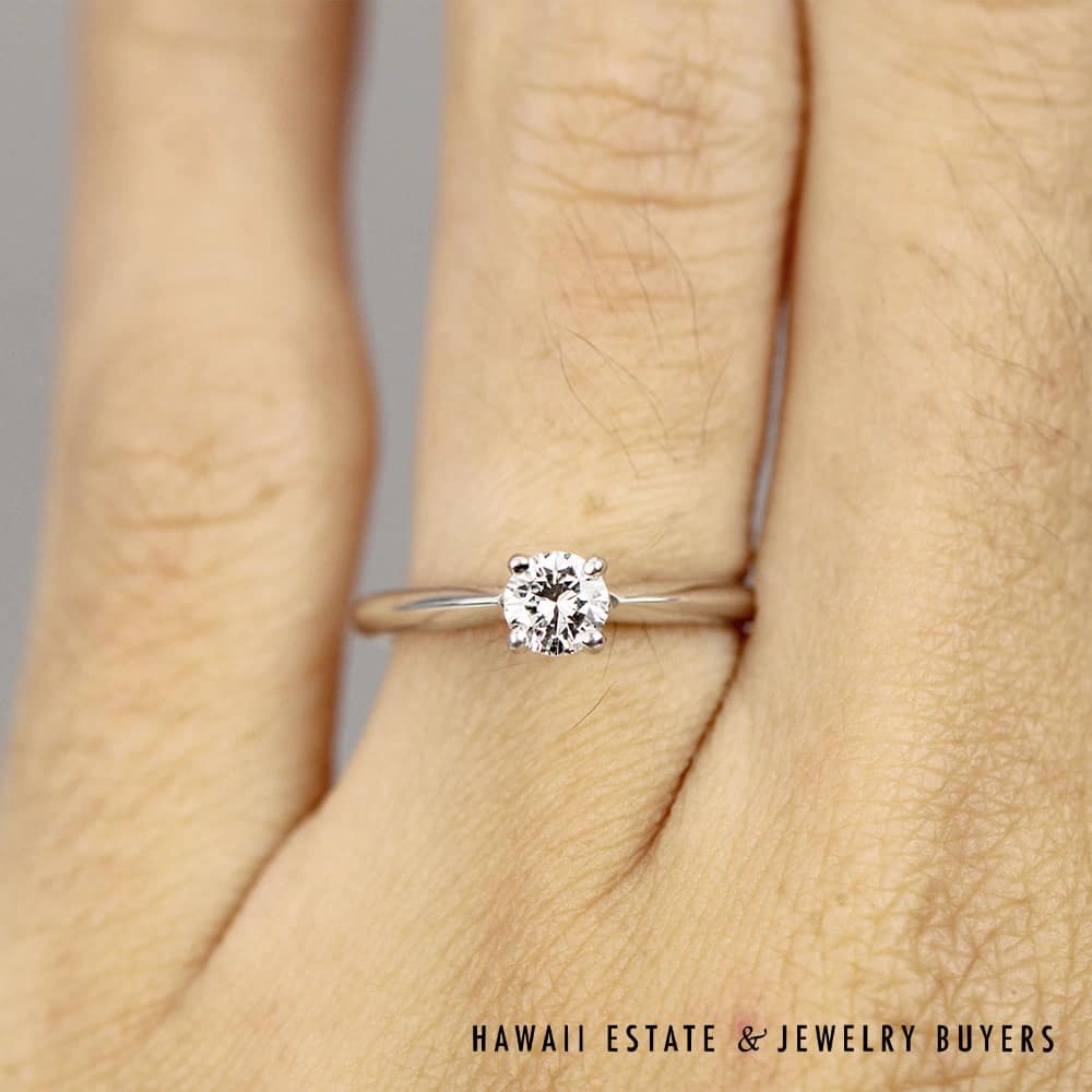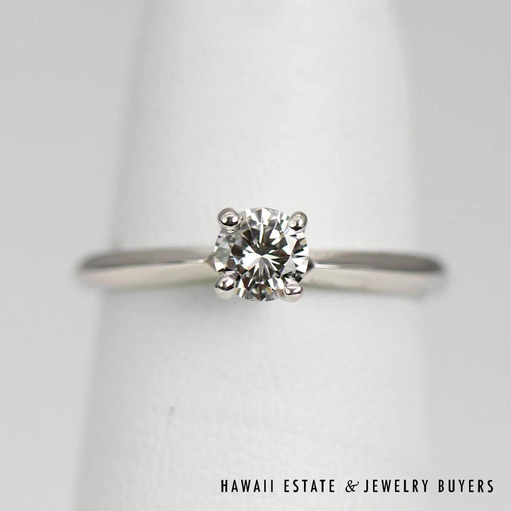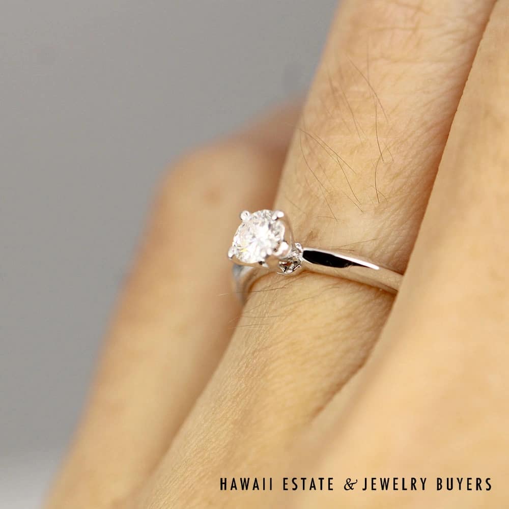 14K white gold ring features a stunning 0.30CT round brilliant diamond (VS2 clarity, G color) elegantly set in a classic solitaire style. The band is sized at 4.25 and is ready to wear, gift, or make that big gesture!