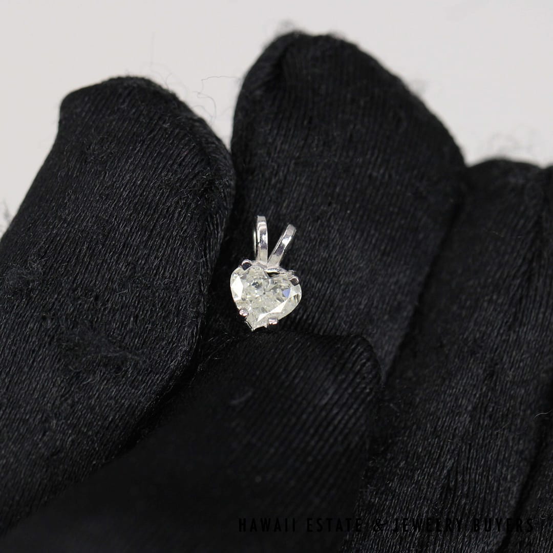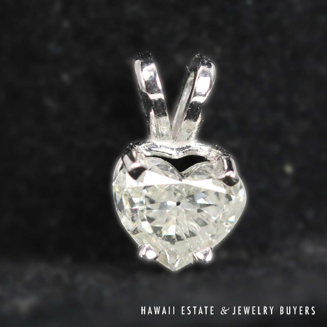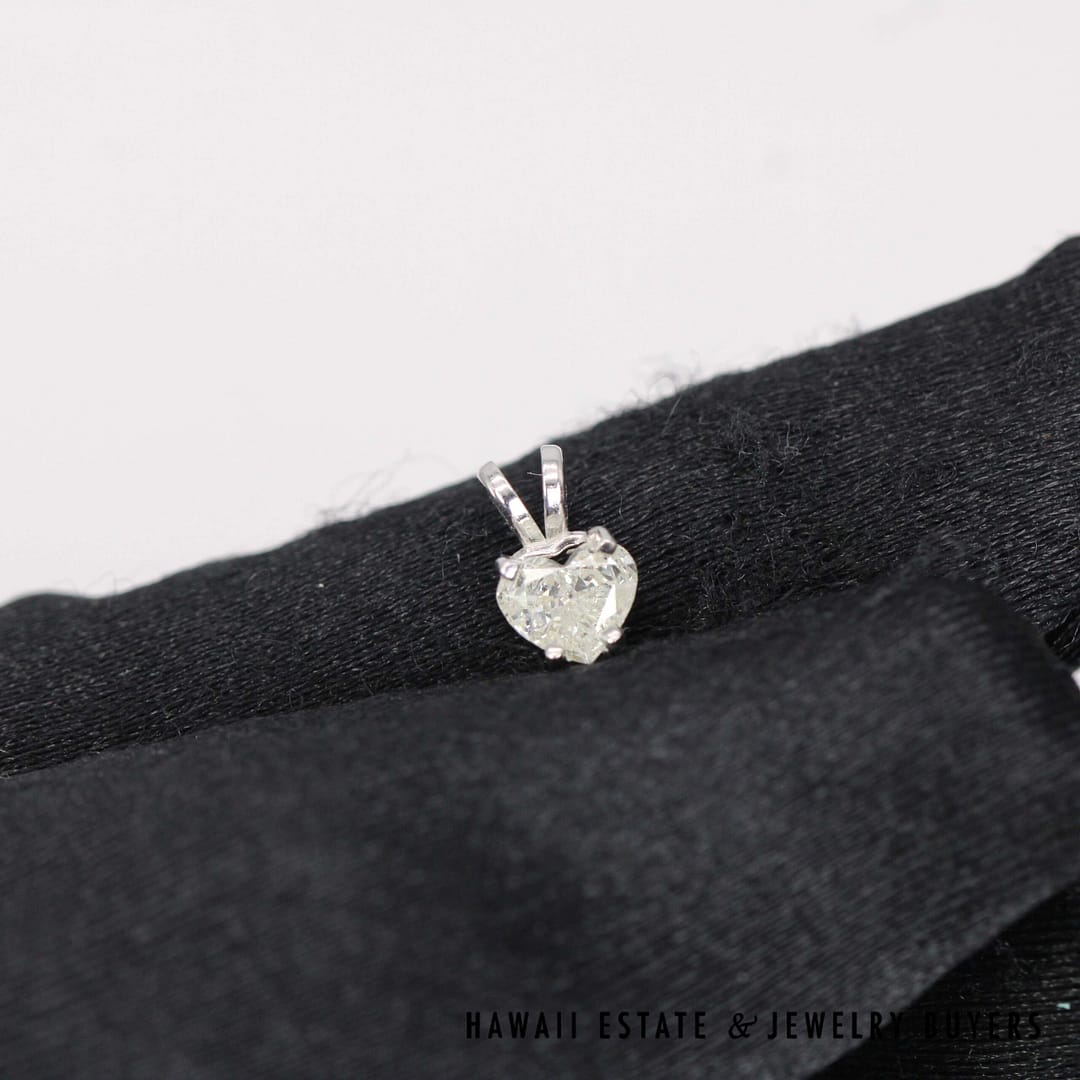 DescriptionBeautiful heart-shaped diamond solitaire pendant in 14K White gold, ready to gift or wear.0.6g 14KWG 0.42ct SI1 HI HEART SHAPED DIAMOND SOLITAIRE PENDANT (2865-15)$700.00Out of stockSKU: 2865-15Category: Pre-owned Diamond JewelryRelated StylesGIA CERTIFIED 4.4g 18K TWO TONE 4.71ct CUSHION CUT PINK-PURPLE SAPPHIRE 0.45ctw DIAMOND RING SIZE 5$25,000.00VINTAGE BURMESE JADEITE JADE & DIAMOND FLORAL 14K YELLOW GOLD BRACELET W/ GEMOLOGIST APPRAISAL$2,447.50BEN BRIDGE 14K YELLOW GOLD WHITE GOLD TWO TONE TENNIS BRACELET & EARRINGS W/ BOX$3,000.00SKY BLUE TOPAZ & DIAMOND 18K WHITE GOLD EARRINGS & PENDANT SET$1,850.00