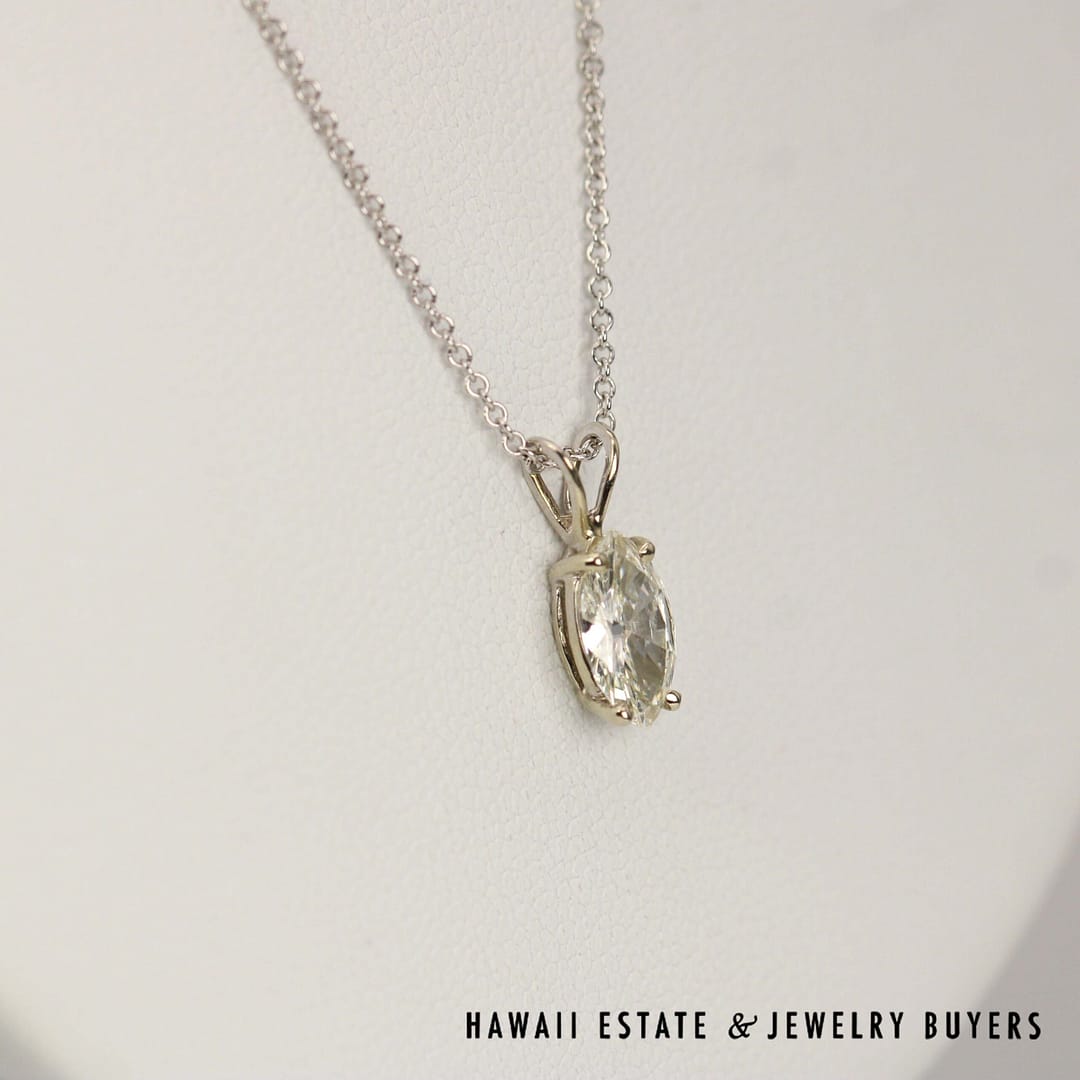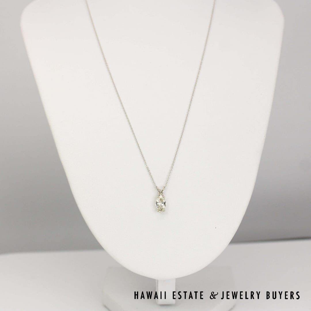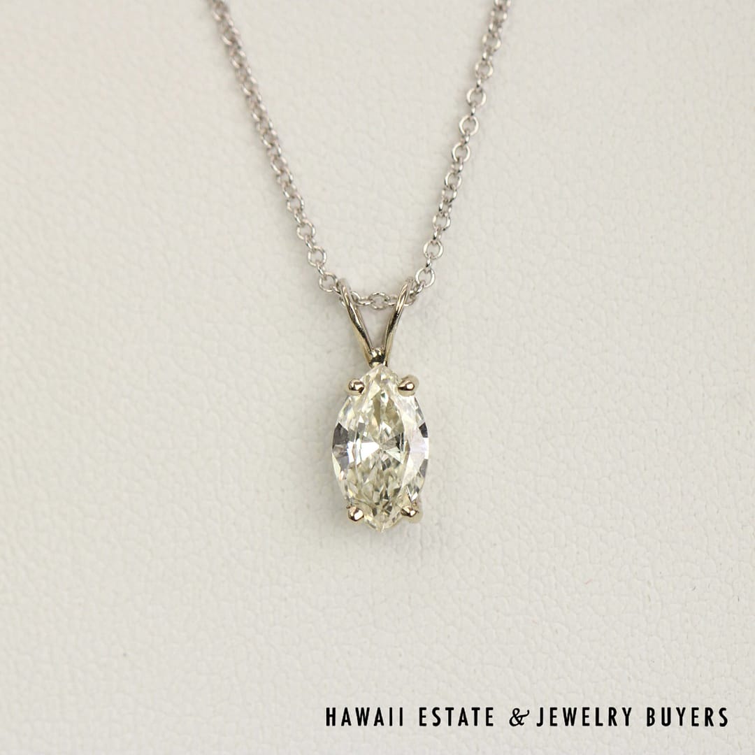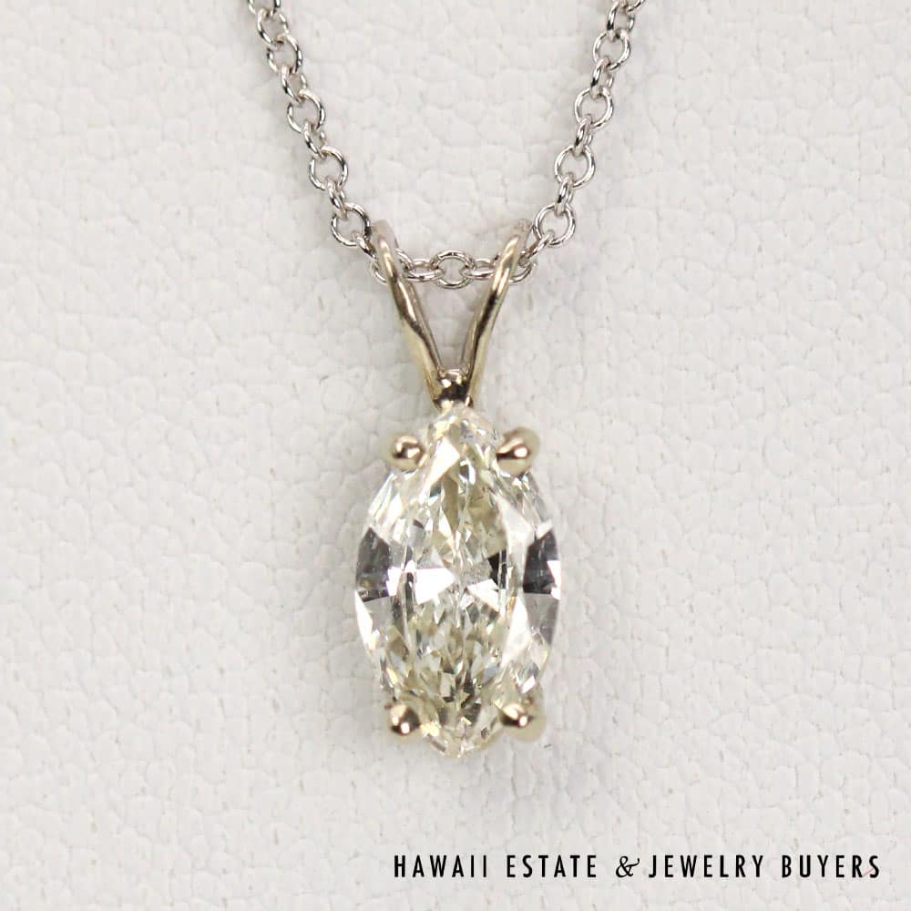 DescriptionA gorgeous 0.67ct Marquise Diamond is set in this beautiful white gold pendant. The necklace chain measures 16" and is stamped "14KT ITALY".14KWG 0.67ct MQ DIAMOND SI1/IJ 16 INCH PENDANT (101422-20)$1,200.001 in stock0.67ct Marquise Diamond 14K White Gold Pendant Necklace , 16Ó Length quantityAdd to cartMake OfferSKU: 101422-20Category: Pre-owned Diamond JewelryRelated StylesDIAMOND 14K YELLOW GOLD OPENING DOORS JEWISH MOSES PENDANT & 18K NECKLACE$3,500.00GIA CERTIFIED 4.4g 18K TWO TONE 4.71ct CUSHION CUT PINK-PURPLE SAPPHIRE 0.45ctw DIAMOND RING SIZE 5$25,000.002.13CTW DIAMOND CLUSTER 14K YELLOW GOLD TREE BRANCH RING W/ GEMOLOGIST APPRAISAL$5,225.002CTW PRINCESS CUT DIAMOND HEAVY 36.9g 18K YELLOW GOLD HINGED BANGLE BRACELET$7,950.00