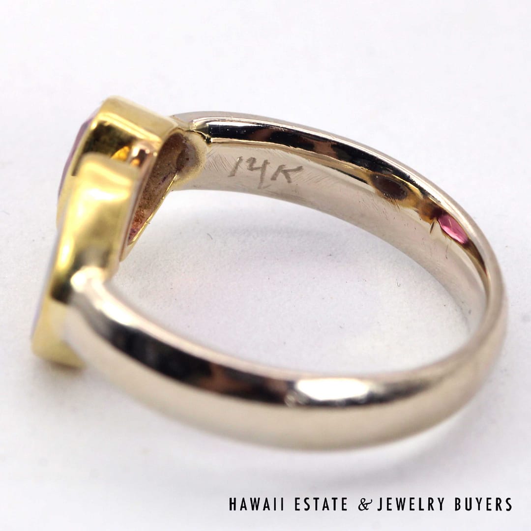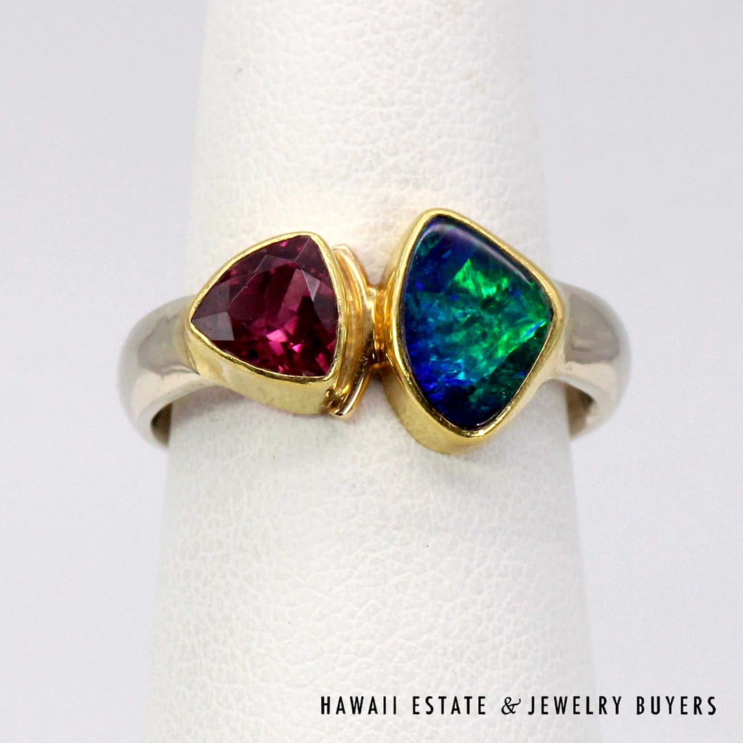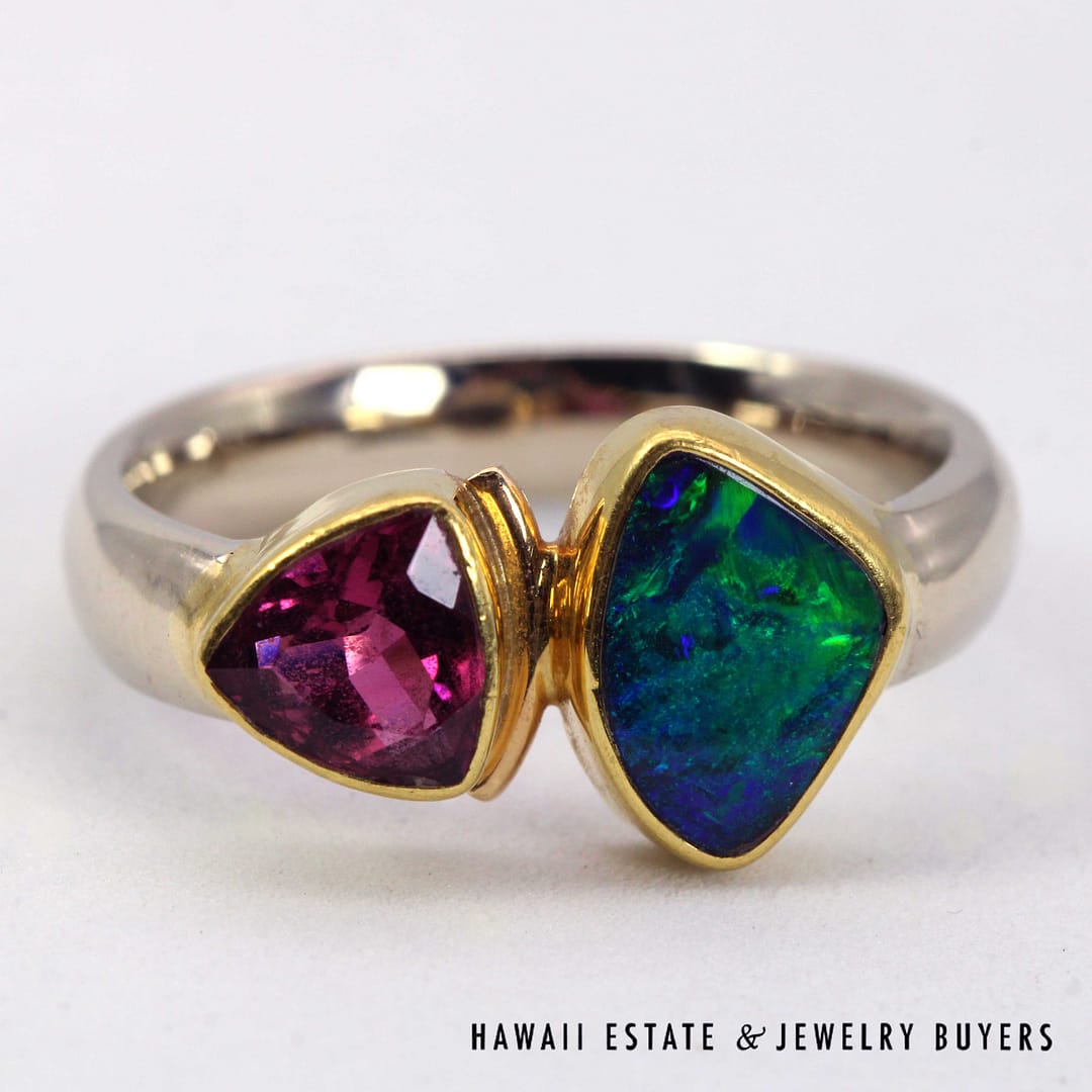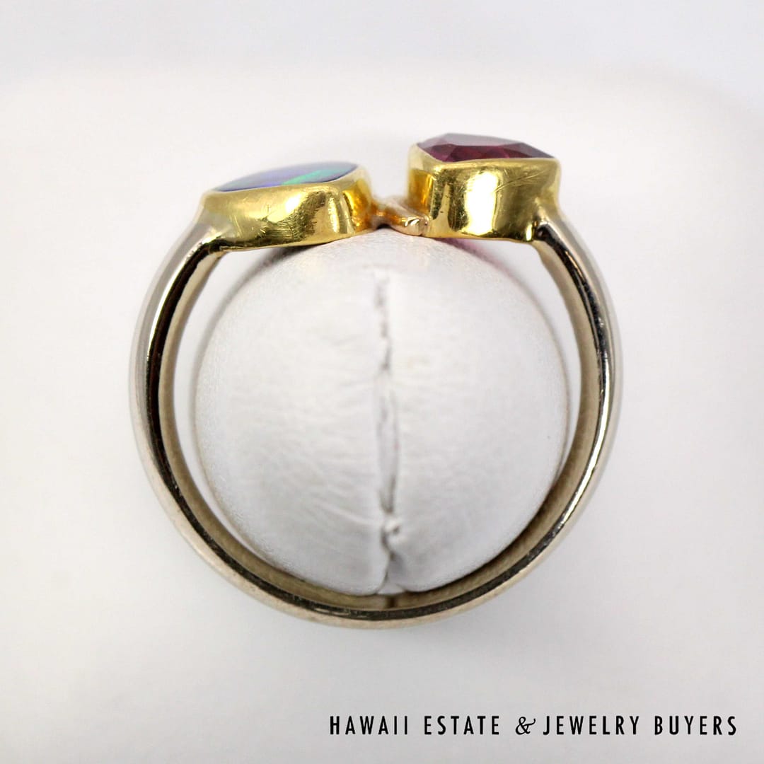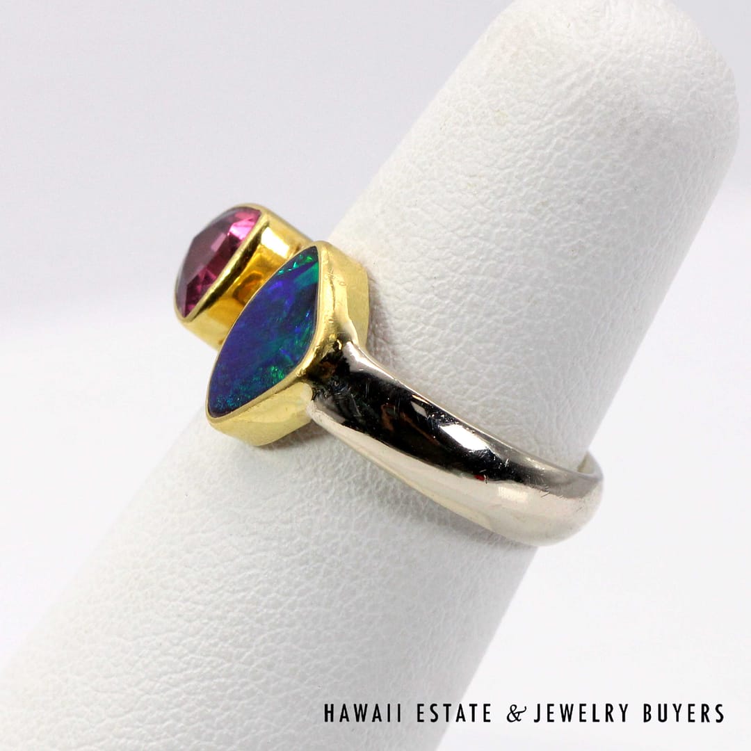 Stunning 14k two-tone gold ring featuring a vibrant trillion-cut pink tourmaline and a striking boulder opal doublet, beautifully set in a unique modern design.