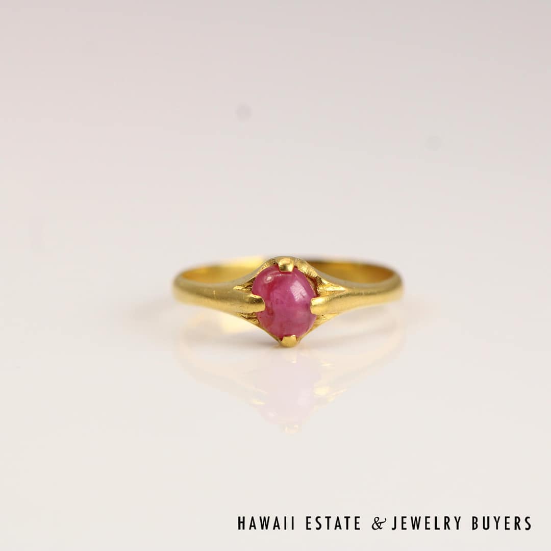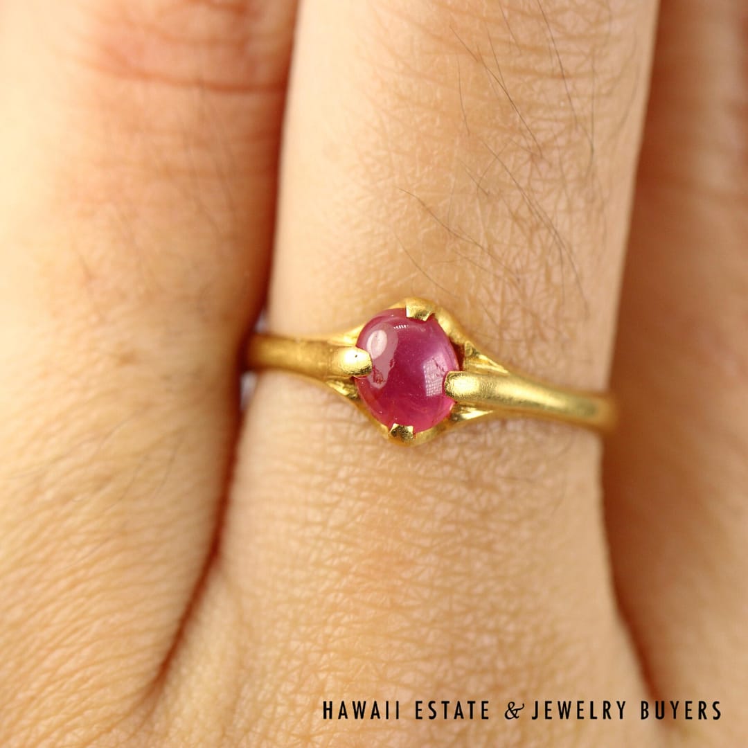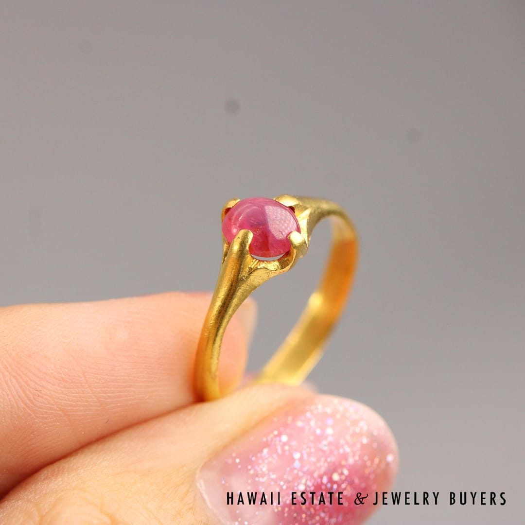 Beautiful 0.55ct Round Burmese Ruby Cabochon set with the unmistakeable color of 22k Yellow Gold, ring size 6