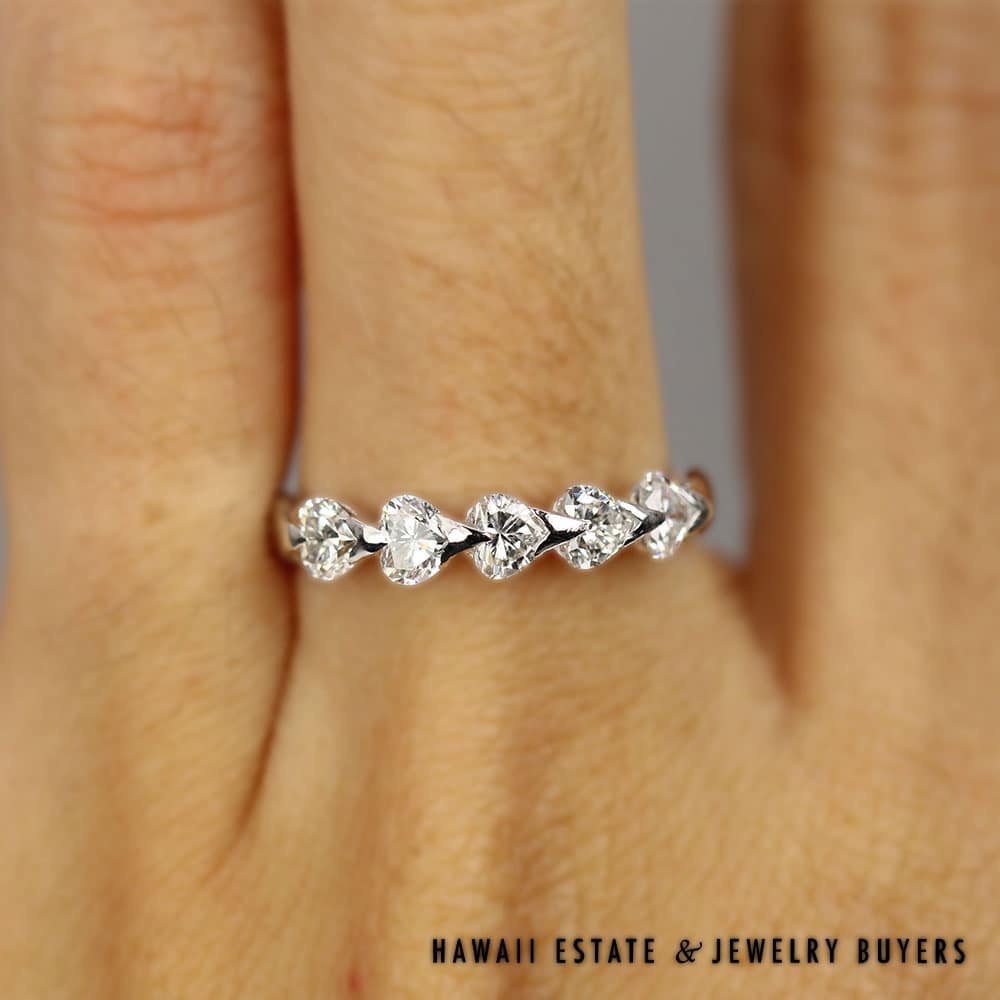 Gorgeous ultra romantic wedding band featuring 5 gorgeous heart shaped diamonds totalling 1.04CTW set in Platinum, ring size 5.25.