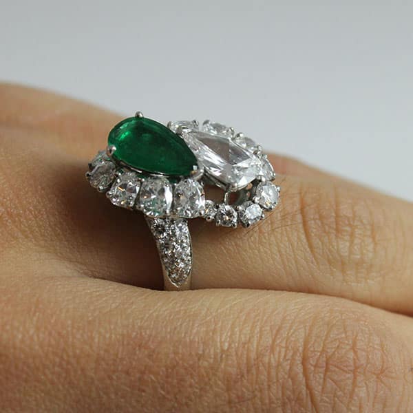 1.30ct Pear Shaped Diamond & Emerald Twin Antique Platinum Ring Size 5.5