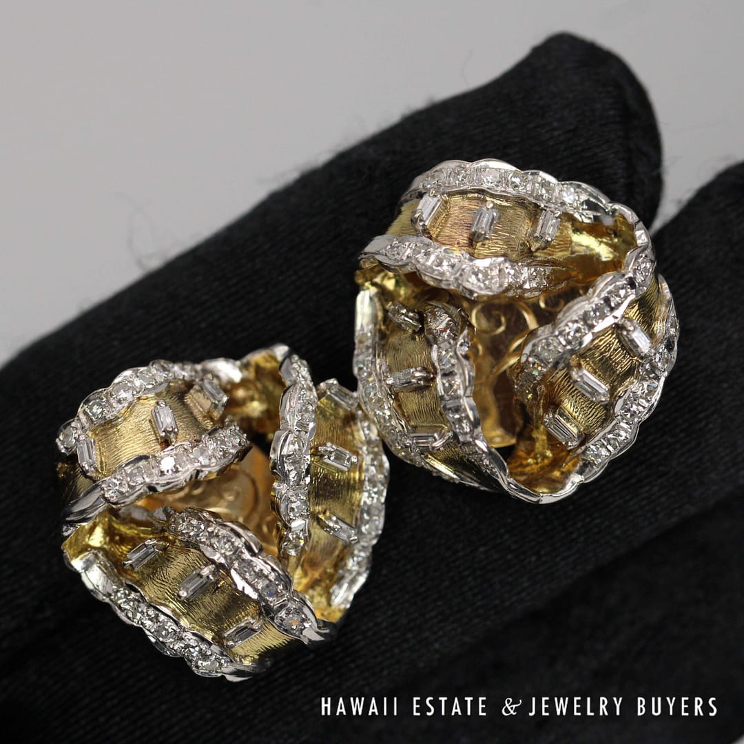 Yellow gold cuff links are stamped 14K and weigh 22.4 grams. Diamonds are single cut round brilliant and baguette VS-SI/GH clarity/color with an estimated total weight of approx. 1.50ctw. Links are approx. 25mm diameter
