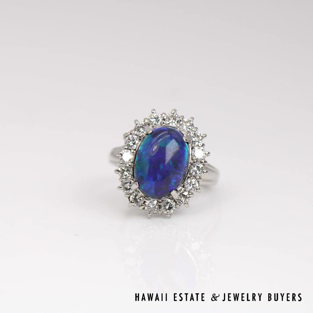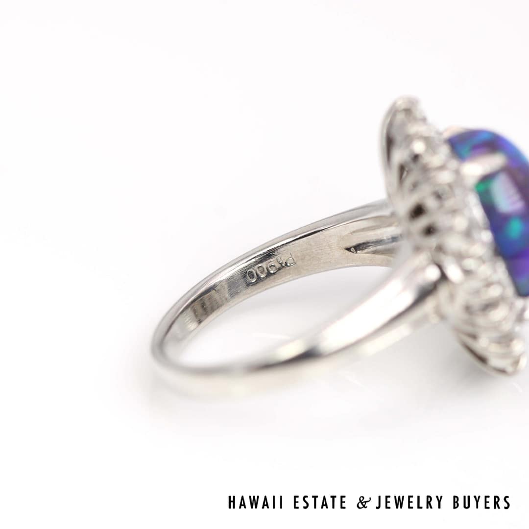 DescriptionThis stunning ring features a 4.54ct Black Opal, set with 1.10ctw of diamonds in Platinum. The ring is a size 6.5.10.4g PLAT 4.54ct BLACK OPAL 1.10ctw VS/GH DIAMOND RING SIZE 6.5 (MJ022120-02)$4,600.001 in stock10.4g Platinum 4.54ct Black Opal 1.10ctw VS/GH Diamond Ring Size 6.5 quantityAdd to cartMake OfferSKU: MJ022120-02Category: Pre-owned Gemstone JewelryRelated StylesMexican Opal 14K Yellow Gold Leaves Ring Size 8$1,650.002.50ctw Sapphire 0.33ctw Diamond SI/GH 18K White Gold Bracelet Size 7.25$900.0032ct Amethyst & 0.10ctw Diamond A.Clunn 22.9g 18KYG Enhancer Pendant$4,500.002ctw Emerald Hand Fabricated Flower 41.4g 18K Yellow Gold Brooch$5,500.00