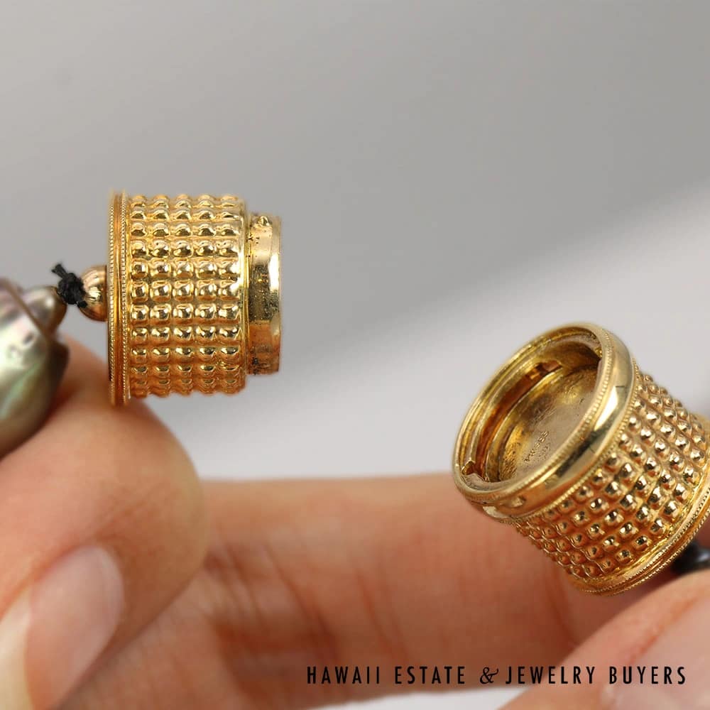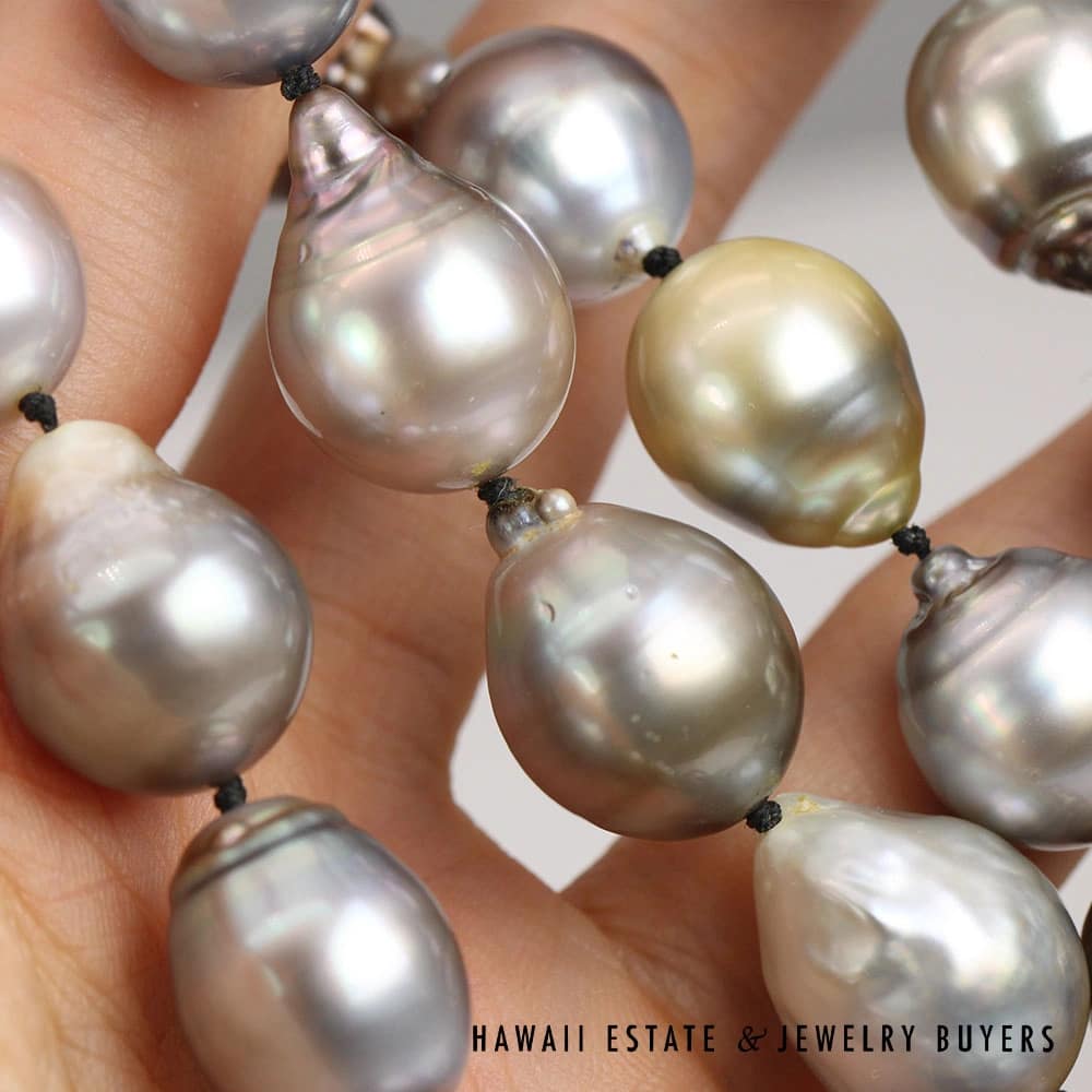 DescriptionPearls range from approx. 13 to approx. 16mm, necklace is approx. 20 inch length with 14K magnetic clasp.3010-09 124.3g 14KYG Baroque Tahitian Pearl Necklace$3,900.001 in stock13-16mm Baroque Tahitian Pearl 14K Yellow Gold Necklace 20" quantityAdd to cartBuy withMake OfferSKU: 3010-09Category: Pre-owned Pearl JewelryRelated Styles8.1g 14KYG 9.6mm TAHITIAN PEARL with 0.50ctw DIAMONDS RING SIZE 7$2,300.007-7.5mm Cultured Cream Pearl 14K Yellow Gold Necklace 28″$900.00Giovanni Corletto 11.7g 18KYG Fine Vintage Enamel & Pearl Brooch$2,500.00South Sea Pearl 0.25ctw Diamond 14K Yellow Gold Pendant$950.00
