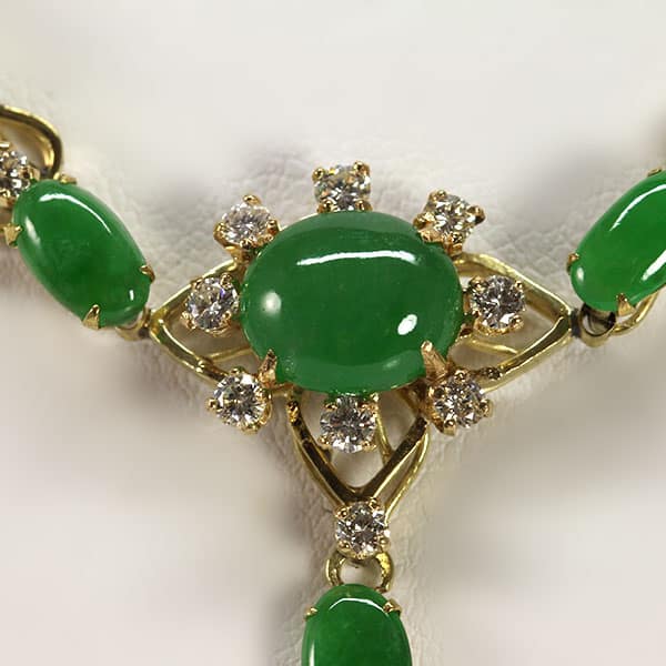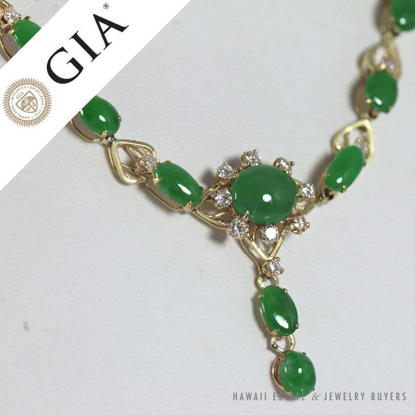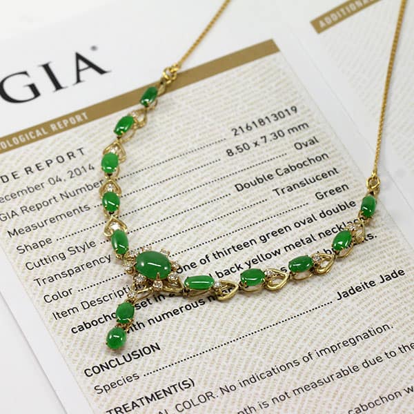 DescriptionGIA Certified Grade “A” Natural JadeGIA Report #: 2161813019Transparency: TranslucentColor: GreenTreatments: NATURAL COLOR. No indication of impregnationSKU: 1113-05$5,900.00Out of stockSKU: 1113-05Category: Pre-owned Vintage JewelryRelated StylesVintage Fire Opal & Diamond 18K Ring$7,000.001.30ct Pear Shaped Diamond and Emerald Twin Antique Platinum Ring$20,000.00Certified Grade “A” Lavender Jade Yellow Gold Ring$2,700.00GIA CERTIFIED NATURAL GRADE A LAVENDER JADEITE JADE PENDANT W/ DIAMONDS$5,900.00