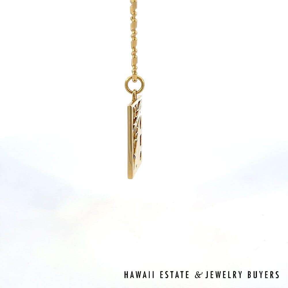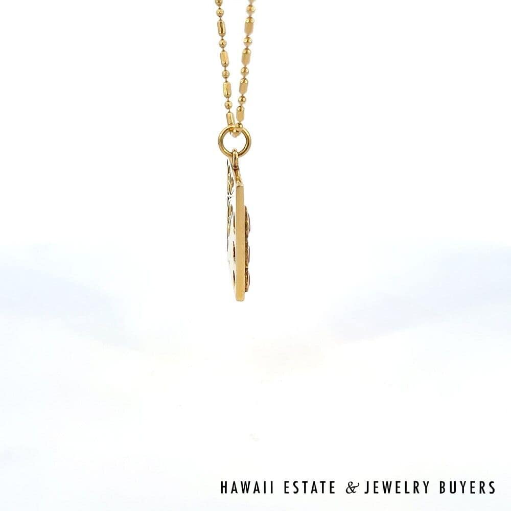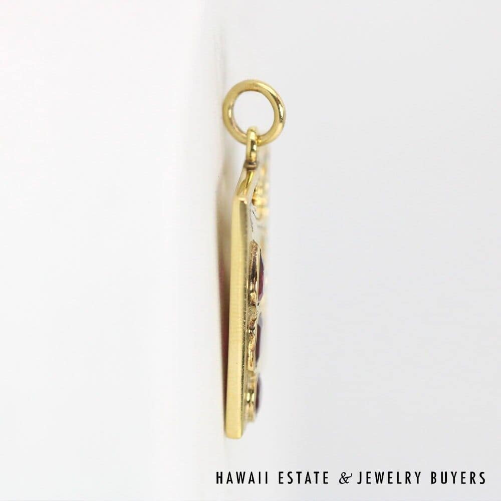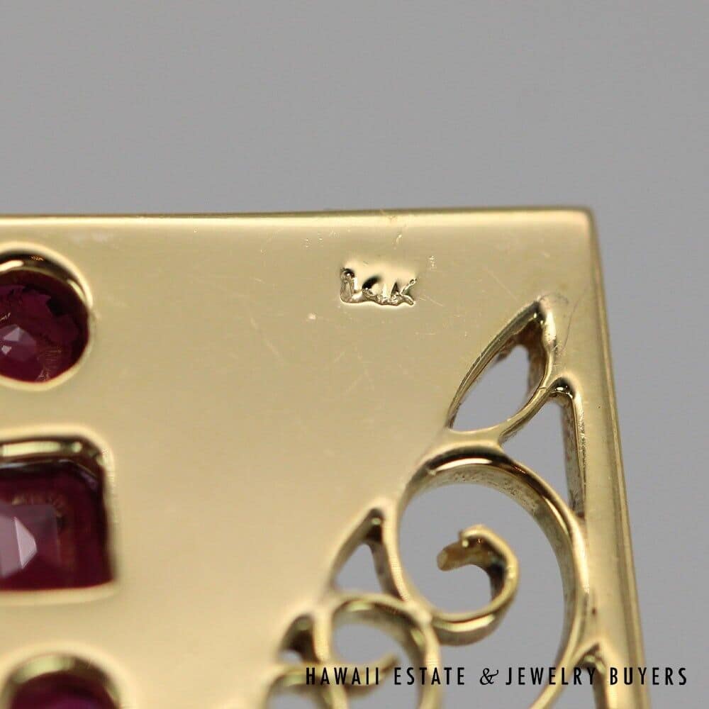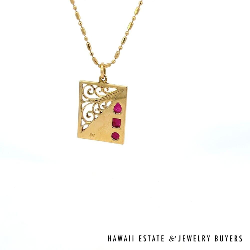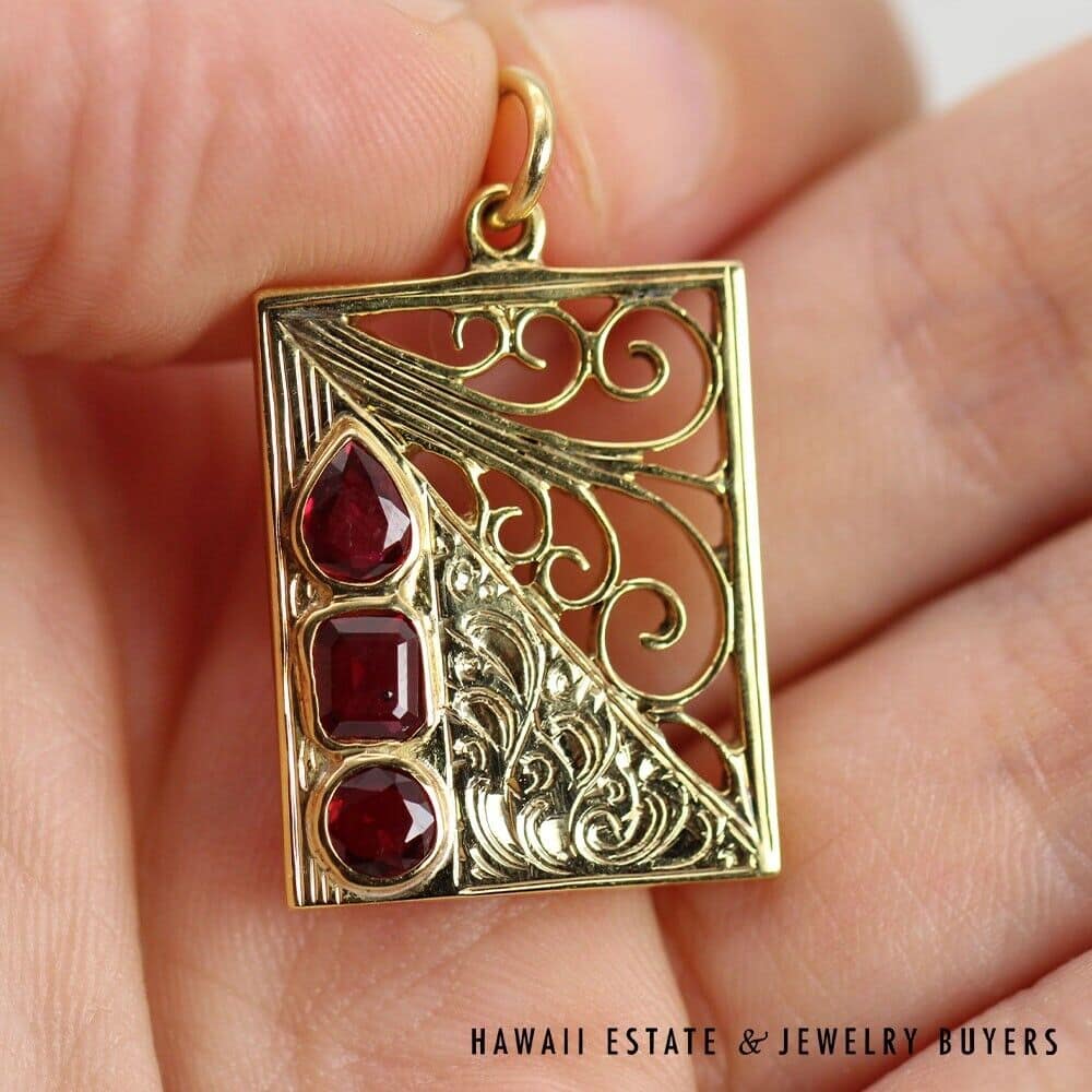 Marvel in the geometric splendor of this one-of-a-kind pendant, complete with swirling metalwork and three dazzling Rubies. Each ruby has been cut in a different style: round, emerald, and pear. The stones have a total carat weight of approximately 0.9 and are held securely in place by bezel settings. The surrounding metal is 14K Yellow Gold, which has been shaped into a 18mmx23mm rectangle and adorned with scrolling filigree and etchings. Including the bail, this pendant has a total drop length of roughly 30mm and weighs 6.7g.