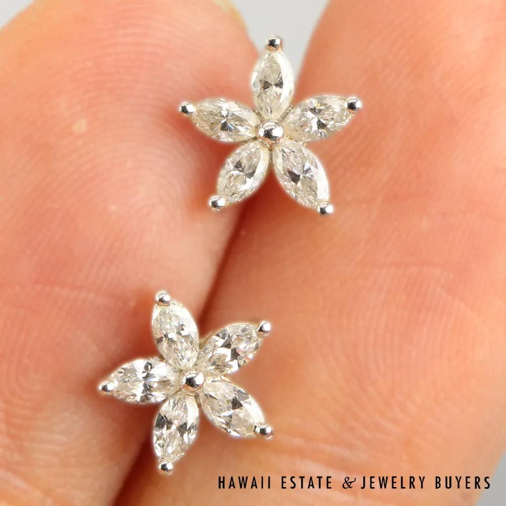 Elevate your style with these stunning 14k white gold earrings featuring marquise-shaped diamonds arranged in a star flower pattern. The diamonds have a total carat weight of .65ctw, perfect for everyday wear or special occasions, and will make a wonderful gift or addition to any jewelry collection.