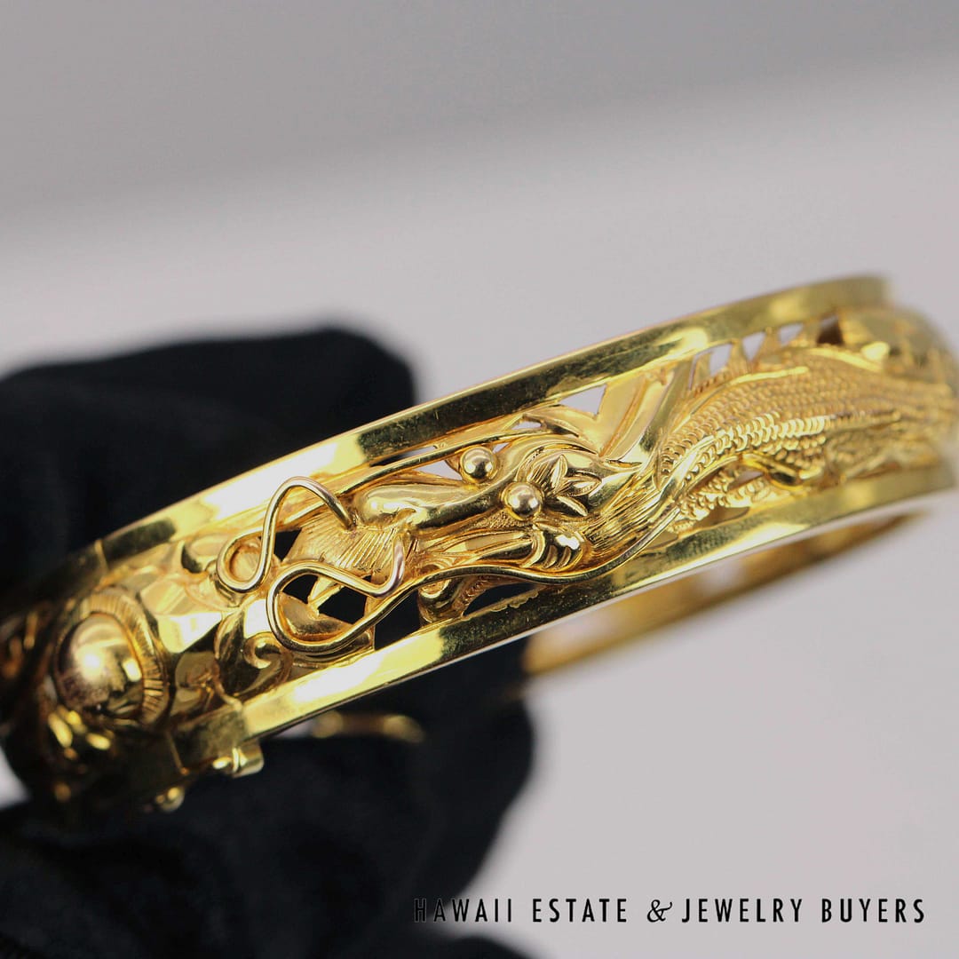 37.6g 18KYG DRAGON & PHOENIX 15.5mm HINGED BANGLE BRACELET SIZE 7 (SU091820-05)