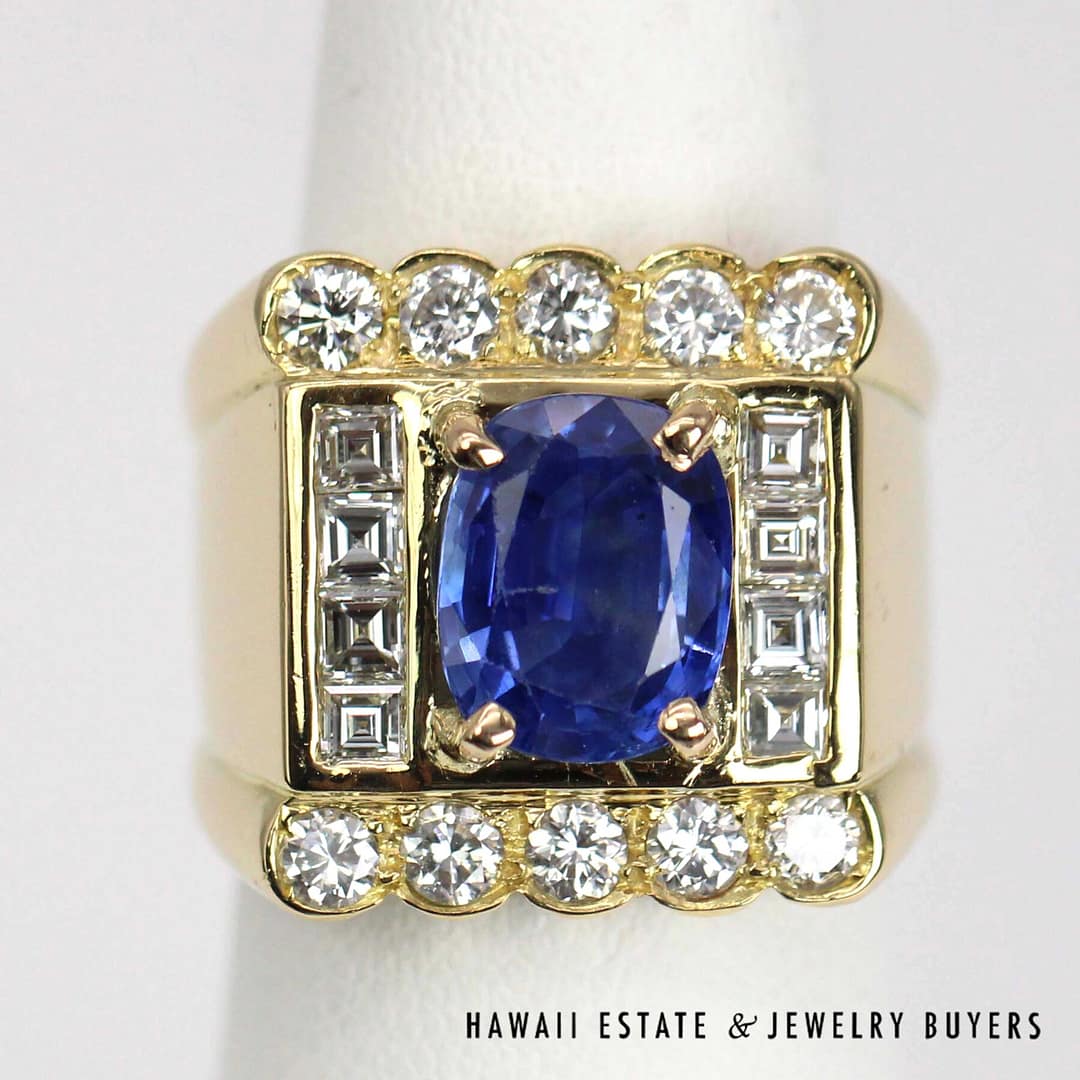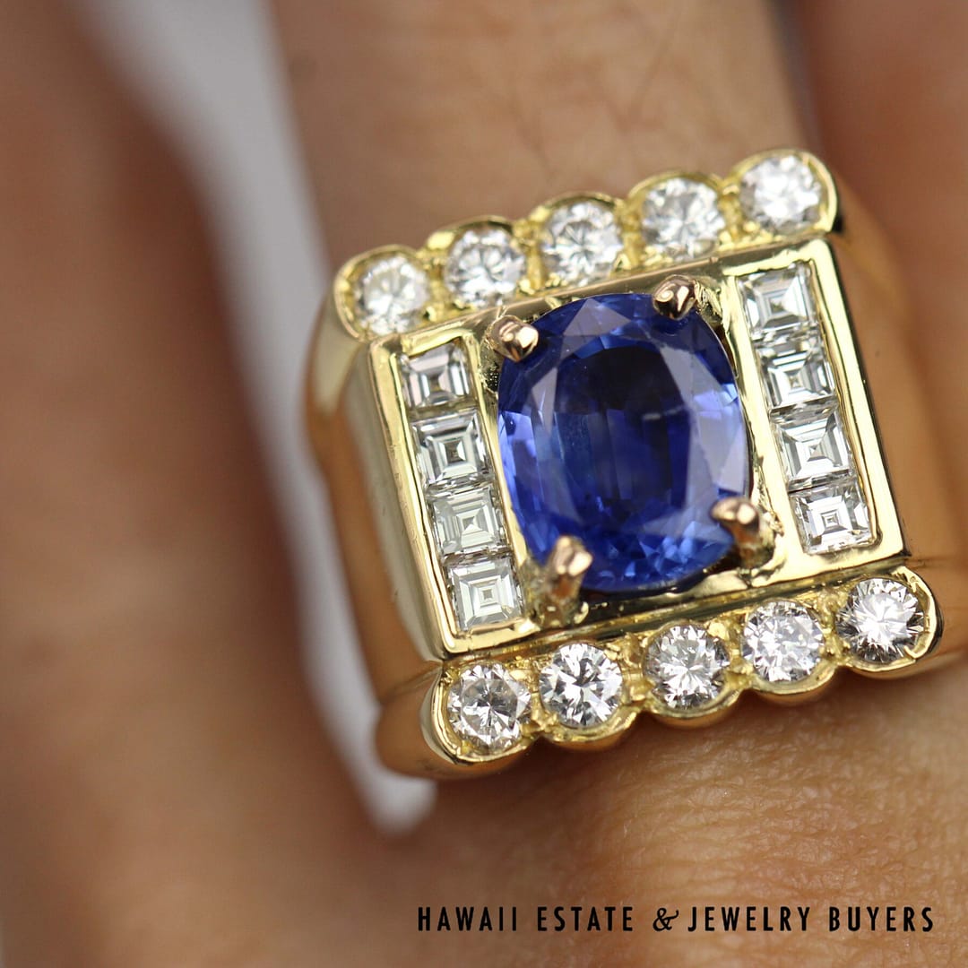 DescriptionRing is stamped K.C. 170 750, sapphire measures 9.87 x 7.82 x 4.74mm16.5g 18KYG 3.09ct OVAL BLUE SAPPHIRE 1.70ctw DIAMOND RING SIZE 6.75 (3007-05)$4,000.001 in stock16.5g 18KYG 3.09ct Oval Blue Sapphire 1.70ctw Diamond Ring Size 6.75 quantityAdd to cartBuy withMake OfferSKU: 3007-05Category: Pre-owned Gemstone JewelryRelated Styles4.5ctw Emerald 4.50ctw Diamond 17.4g 14K Yellow Gold Earrings and Ring Size 6$5,500.008ctw Ruby Hinged Bangle 19K Yellow Gold Bracelet Size 6.5$4,500.00Vintage Coral 14K Yellow Gold Saddle Ring Size 8$900.002ctw Emerald Hand Fabricated Flower 41.4g 18K Yellow Gold Brooch$5,500.00