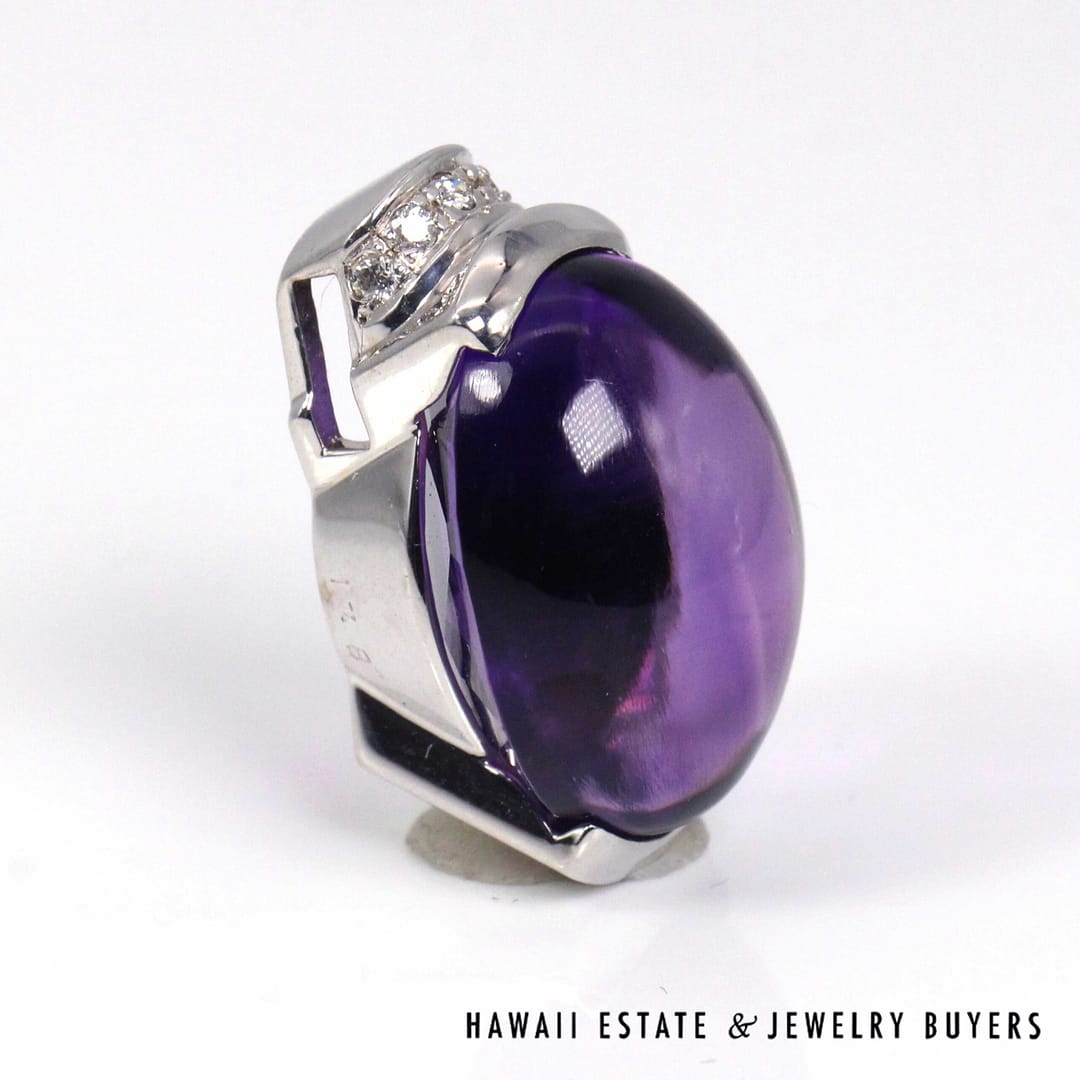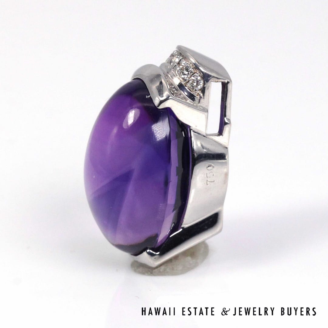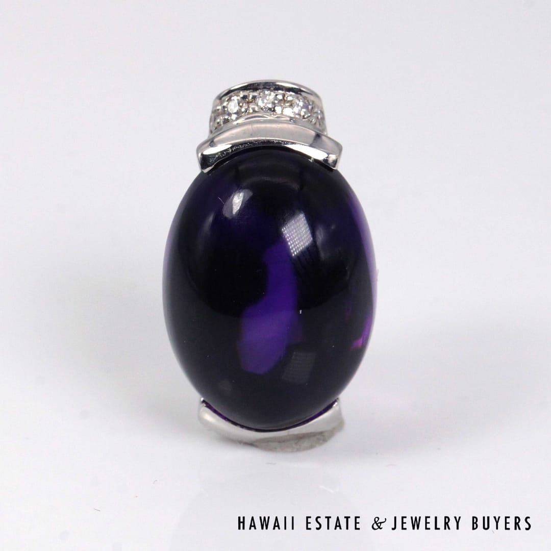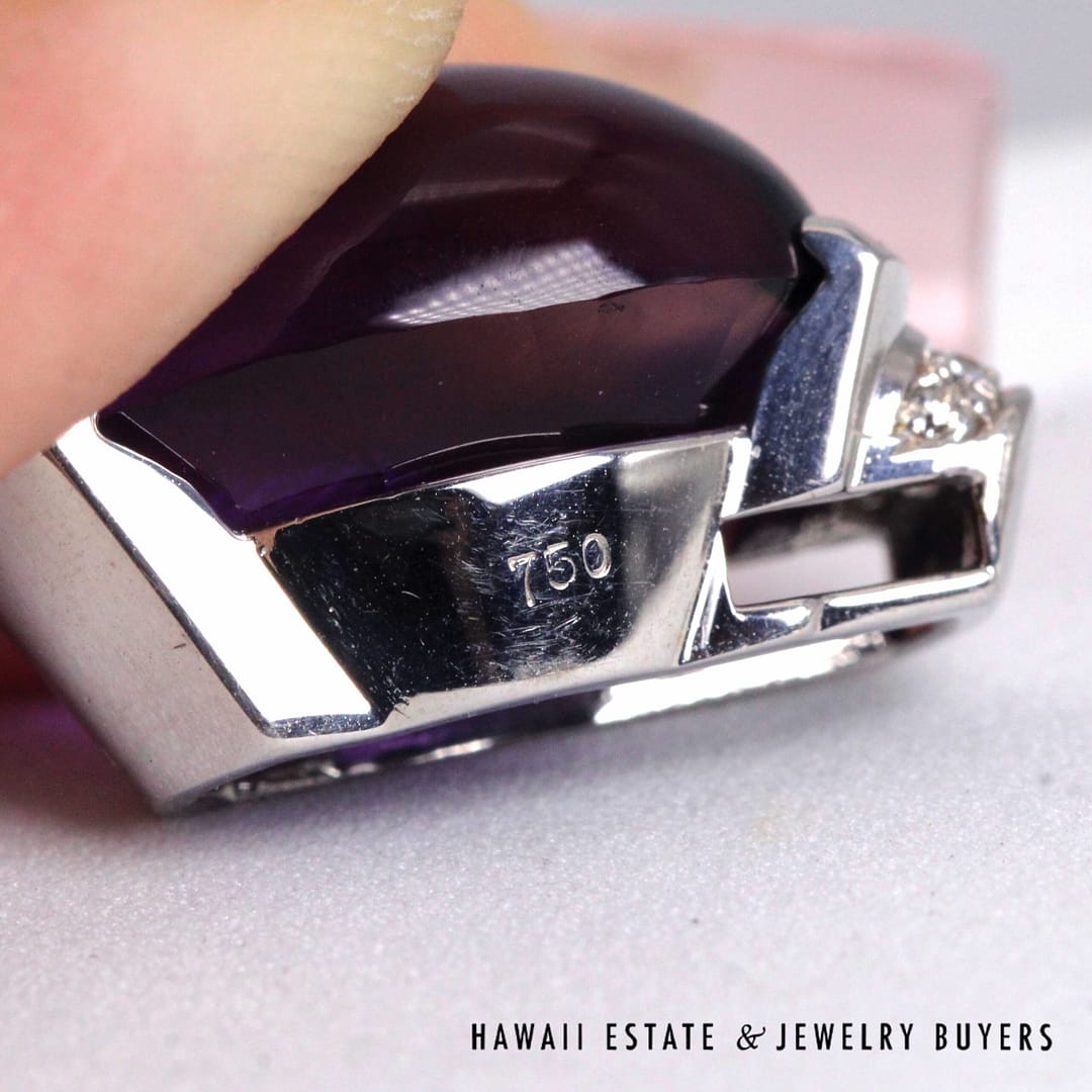 DescriptionStriking pendant featuring a vibrant 17.80ct amethyst set in 18K white gold, accented with 0.15 ctw of sparkling diamonds in a sleek, modern design.7.7g 18KWG 17.80ct AMETHYST 0.15ctw DIAMOND PENDANT (NR0624-08)$900.001 in stock17.80ct Amethyst 0.15ctw Diamond 18K White Gold Pendant quantityAdd to cartBuy withMake OfferSKU: NR0624-08Category: Pre-owned Gemstone JewelryRelated Styles62ct Aquamarine Yellow Gold Large “MIKE” 14K Yellow Gold Pendant$16,000.00BERNARD HURTIG PINK BLUE SAPPHIRE 4.77ctw DIAMOND 18K YELLOW GOLD EARRINGS$34,000.00Black Coral 24K Yellow Gold Hinged Bangle Bracelet Size 6.25$5,600.0032ct Amethyst & 0.10ctw Diamond A.Clunn 22.9g 18KYG Enhancer Pendant$4,500.00