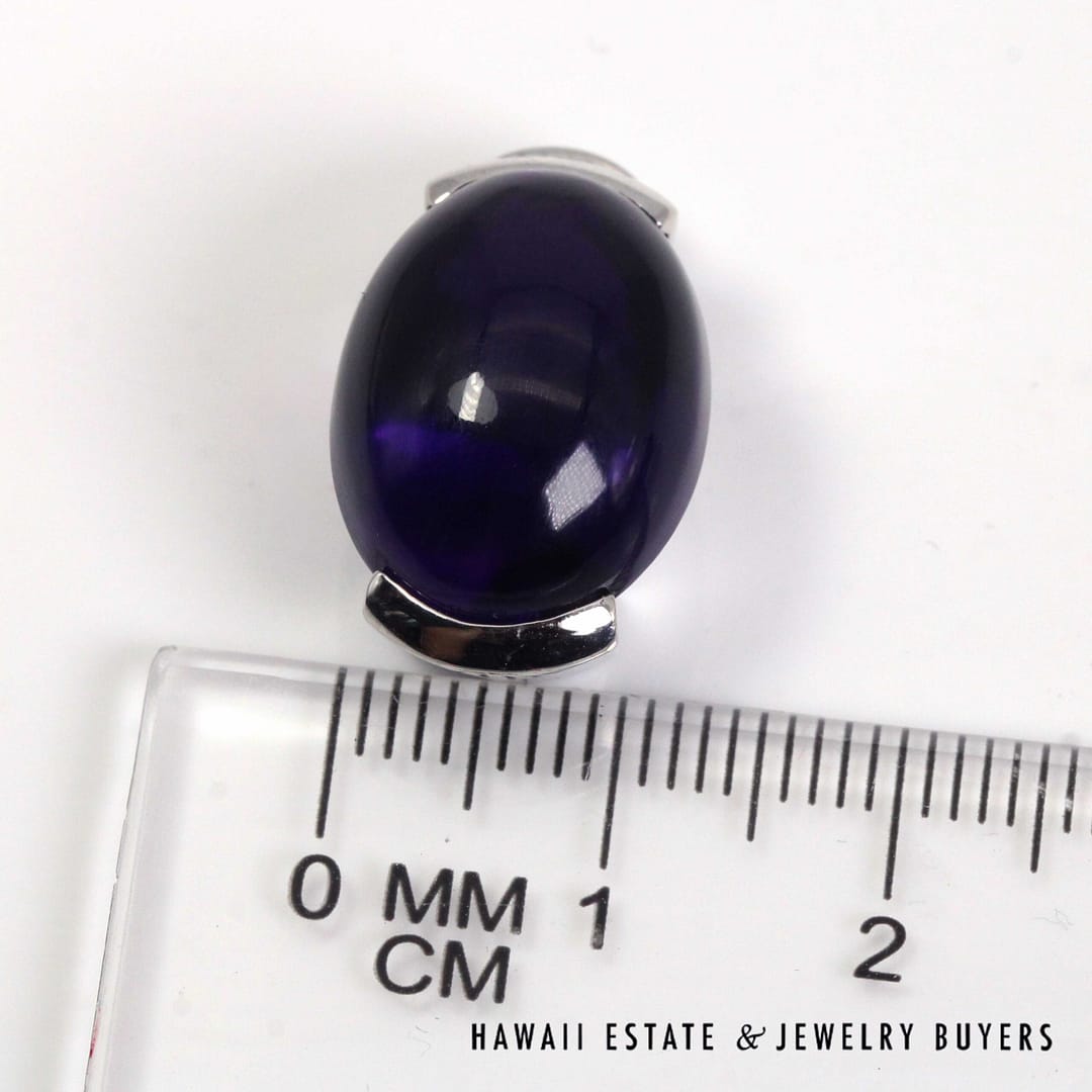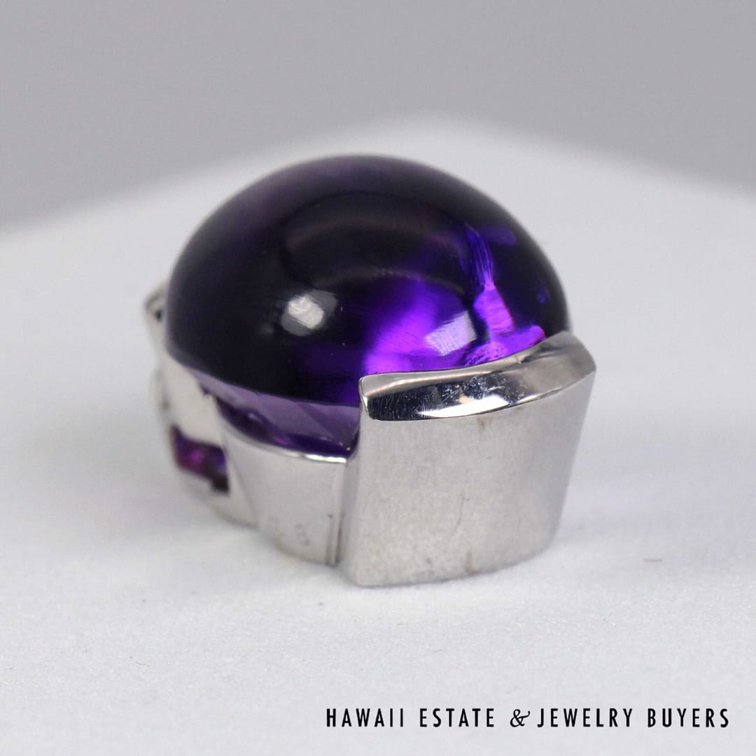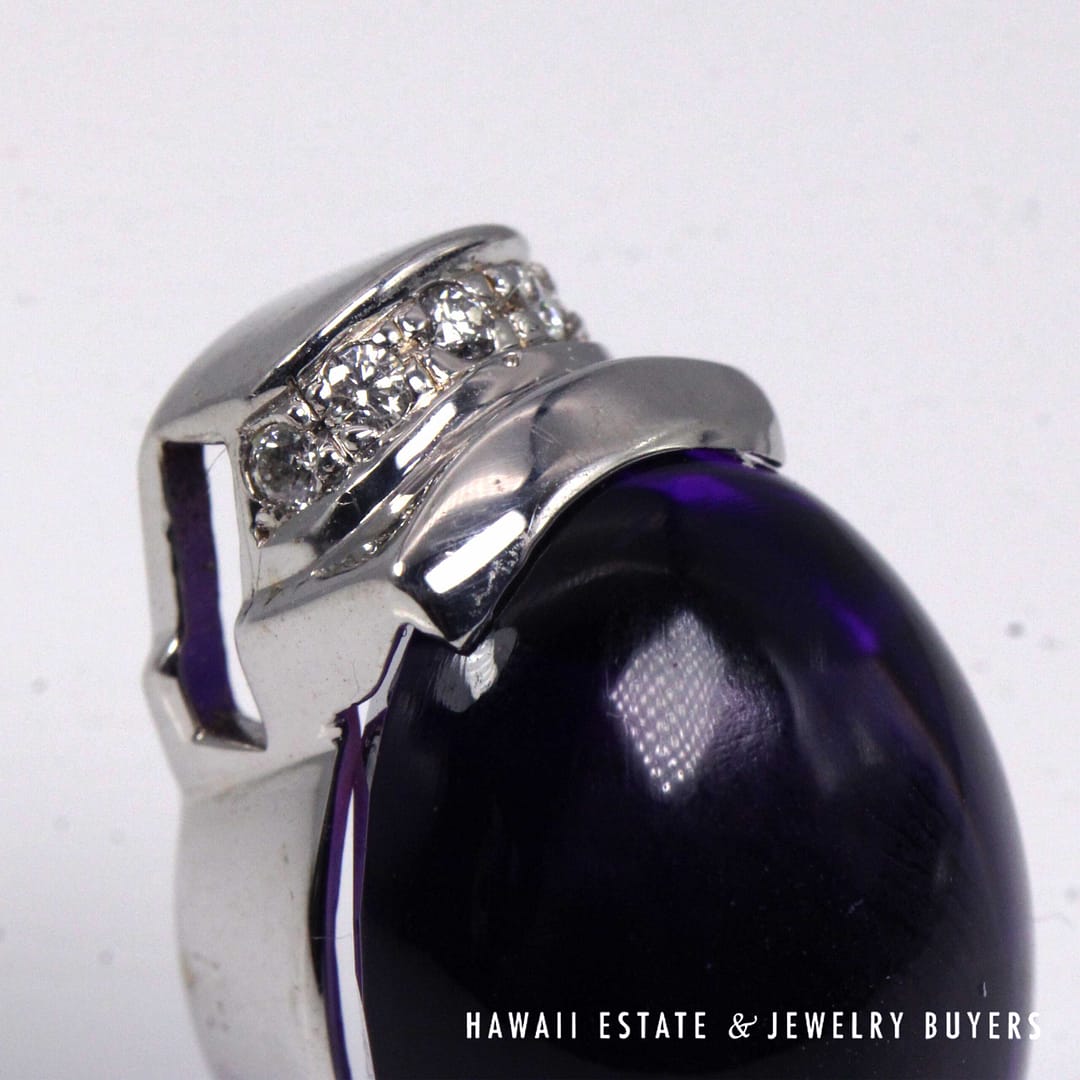 DescriptionStriking pendant featuring a vibrant 17.80ct amethyst set in 18K white gold, accented with 0.15 ctw of sparkling diamonds in a sleek, modern design.7.7g 18KWG 17.80ct AMETHYST 0.15ctw DIAMOND PENDANT (NR0624-08)$900.001 in stock17.80ct Amethyst 0.15ctw Diamond 18K White Gold Pendant quantityAdd to cartBuy withMake OfferSKU: NR0624-08Category: Pre-owned Gemstone JewelryRelated Styles62ct Aquamarine Yellow Gold Large “MIKE” 14K Yellow Gold Pendant$16,000.00BERNARD HURTIG PINK BLUE SAPPHIRE 4.77ctw DIAMOND 18K YELLOW GOLD EARRINGS$34,000.00Black Coral 24K Yellow Gold Hinged Bangle Bracelet Size 6.25$5,600.0032ct Amethyst & 0.10ctw Diamond A.Clunn 22.9g 18KYG Enhancer Pendant$4,500.00