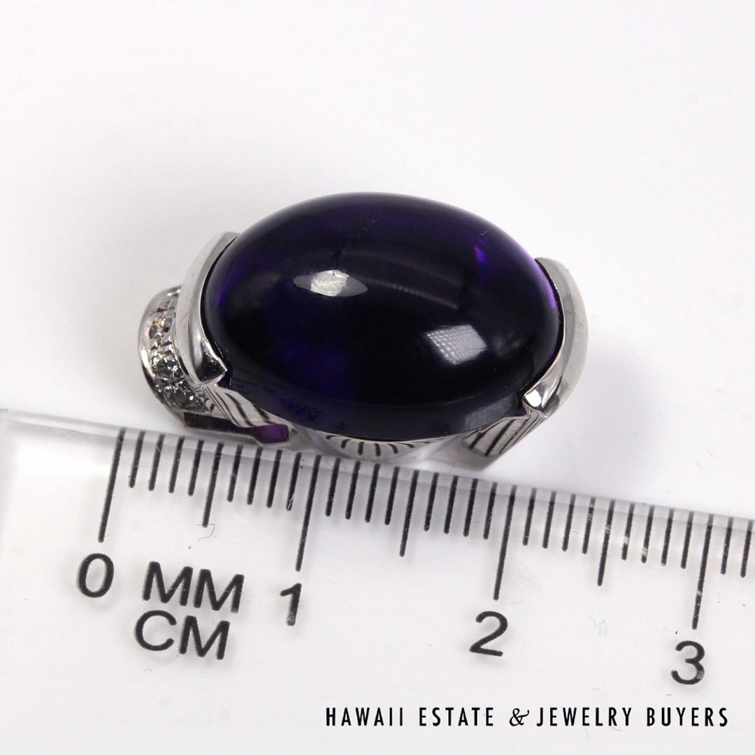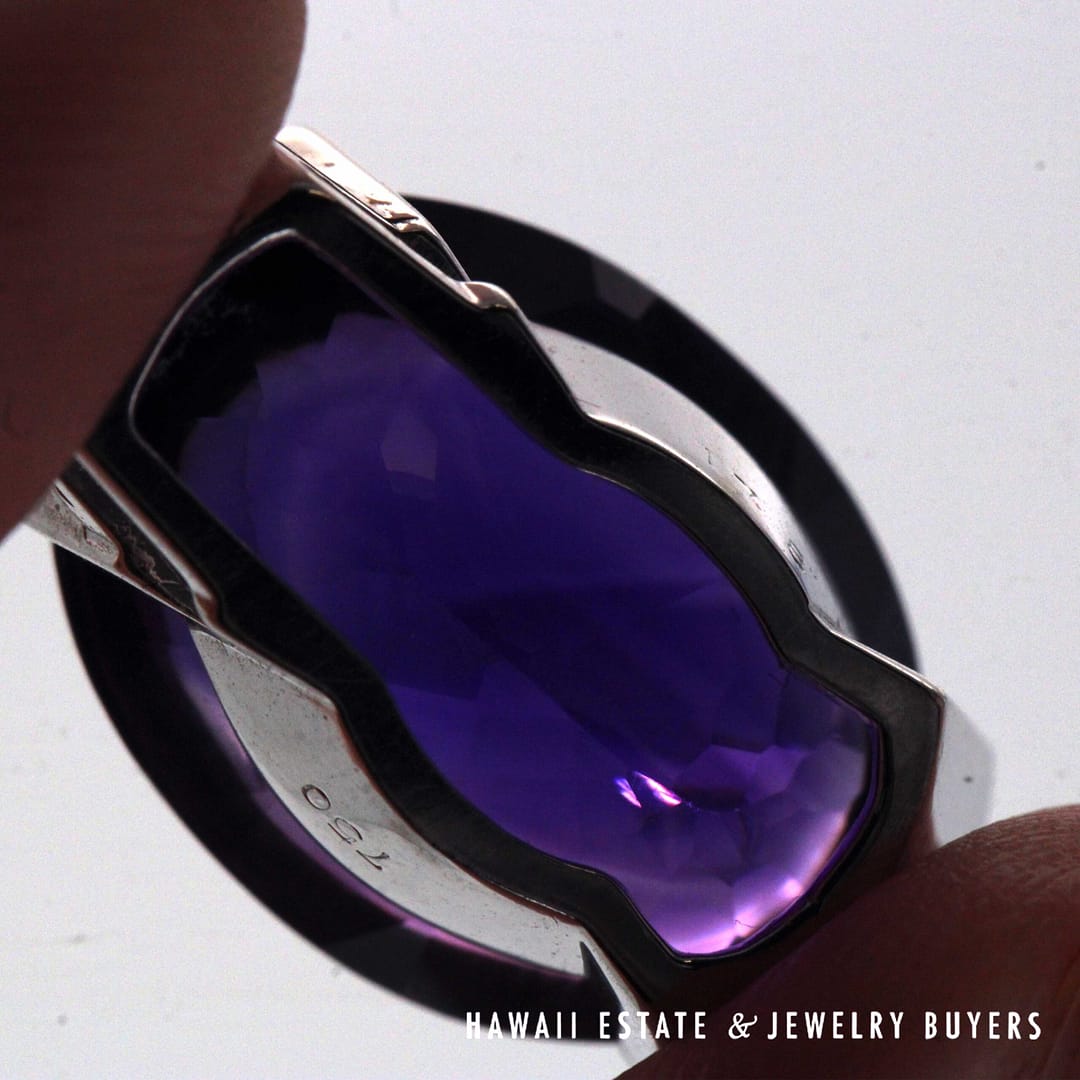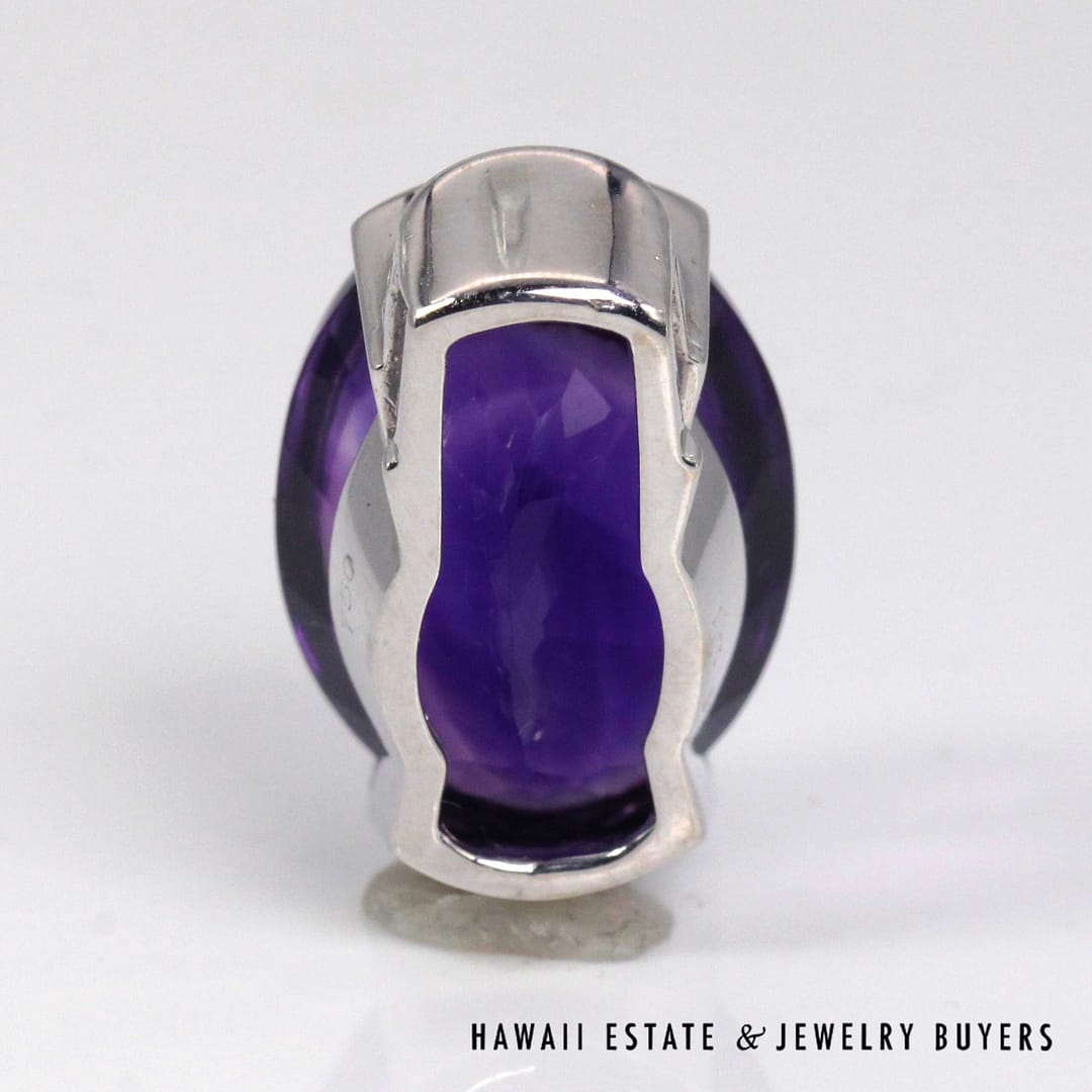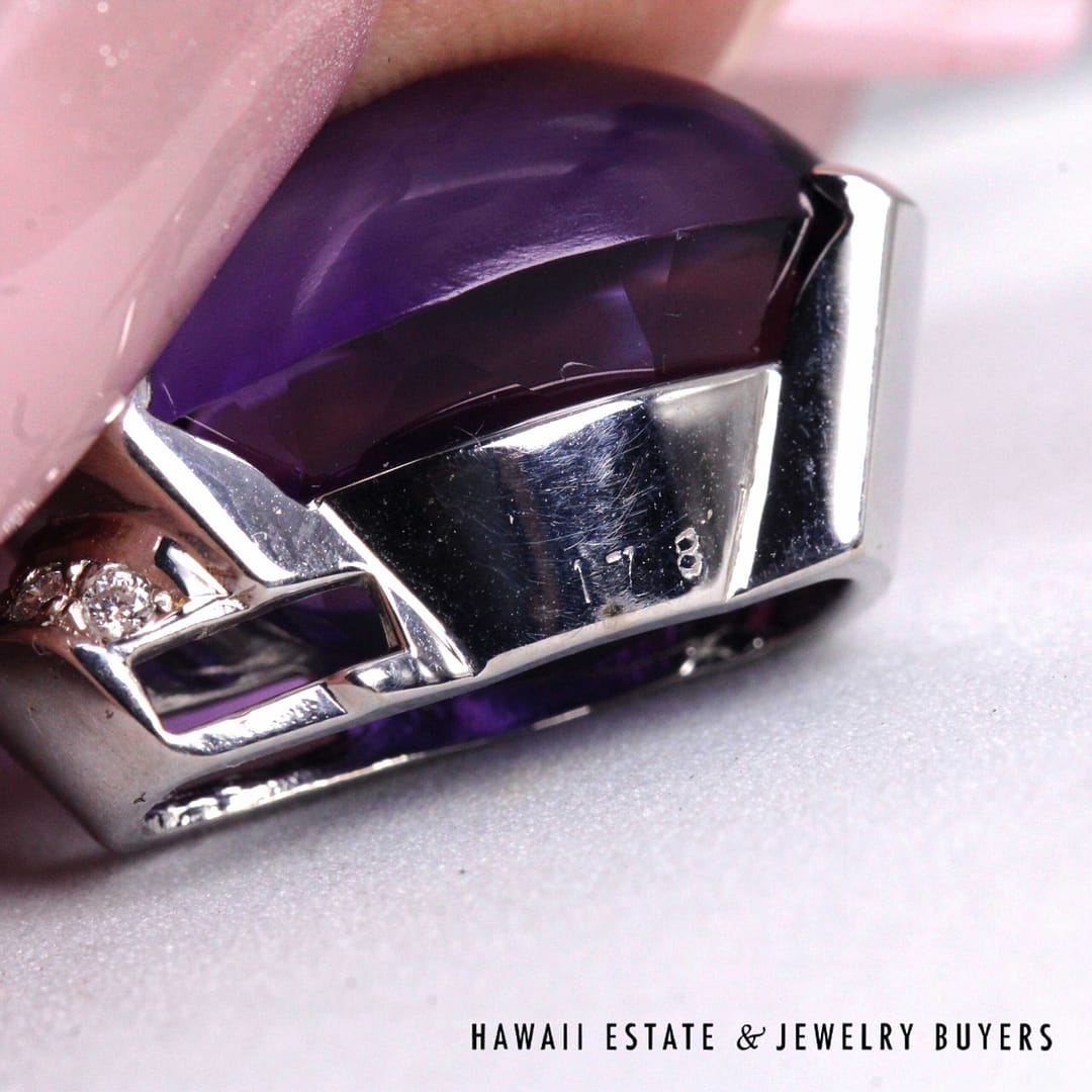 DescriptionStriking pendant featuring a vibrant 17.80ct amethyst set in 18K white gold, accented with 0.15 ctw of sparkling diamonds in a sleek, modern design.7.7g 18KWG 17.80ct AMETHYST 0.15ctw DIAMOND PENDANT (NR0624-08)$900.001 in stock17.80ct Amethyst 0.15ctw Diamond 18K White Gold Pendant quantityAdd to cartBuy withMake OfferSKU: NR0624-08Category: Pre-owned Gemstone JewelryRelated Styles62ct Aquamarine Yellow Gold Large “MIKE” 14K Yellow Gold Pendant$16,000.00BERNARD HURTIG PINK BLUE SAPPHIRE 4.77ctw DIAMOND 18K YELLOW GOLD EARRINGS$34,000.00Black Coral 24K Yellow Gold Hinged Bangle Bracelet Size 6.25$5,600.0032ct Amethyst & 0.10ctw Diamond A.Clunn 22.9g 18KYG Enhancer Pendant$4,500.00