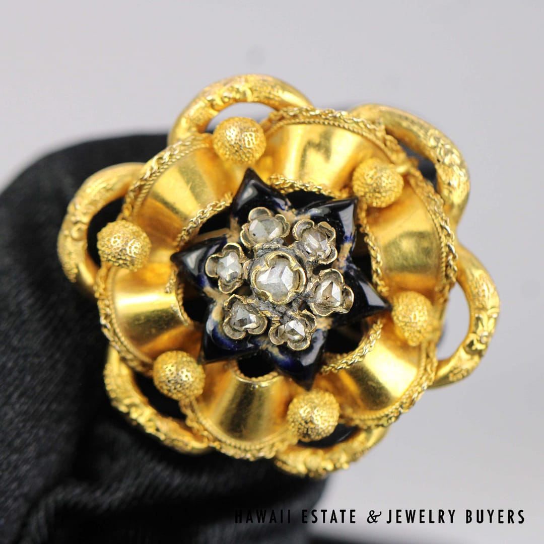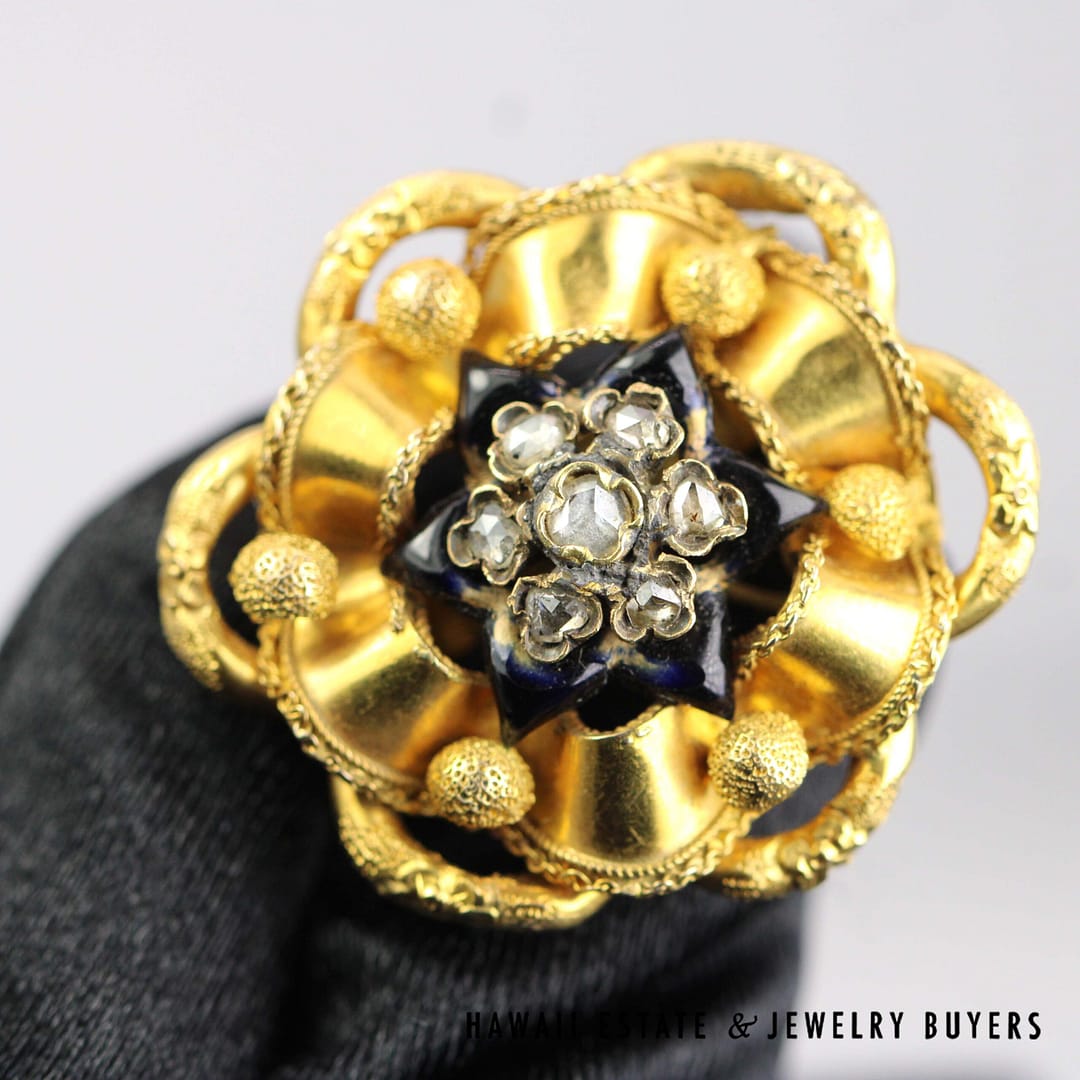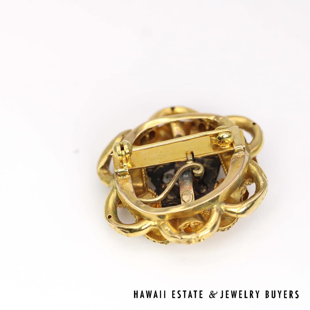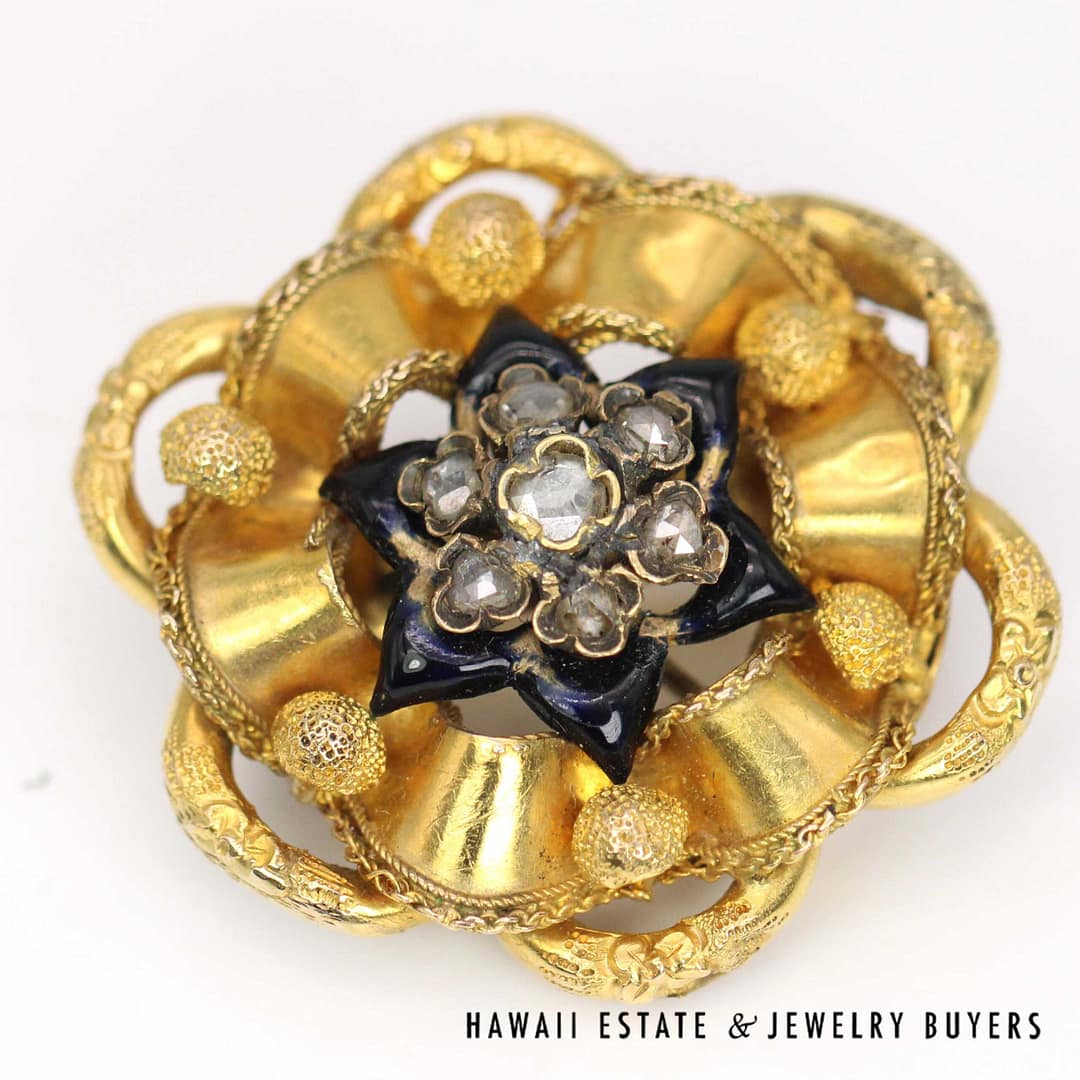 VINTAGE 1800's 11.7g 18KYG ROSE CUT DIAMOND ENAMEL BROOCH (2641-03)