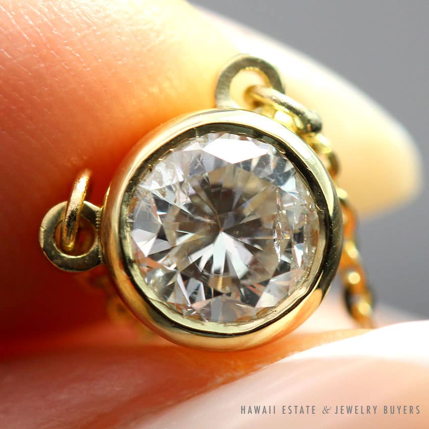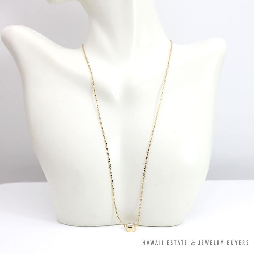 Description1CT ROUND BRILLIANT DIAMOND G/H COLOR & I CLARITYNECKLACE CHAIN STAMPED “14K ITALY”PENDANT & NECKLACE MEASURES APPROX 8.25 INCHES CLASPED$2,600.001 in stock1CT ROUND BRILLIANT DIAMOND BEZEL SET 14K YELLOW GOLD CHOKER NECKLACE 16" quantityAdd to cartBuy withMake OfferSKU: 011521-02Category: Diamond JewelryRelated Styles1.9g 14KWG 0.40ctw DIAMOND FITTED BAND SIZE 4.5$950.00GIA 14.1g 14KWG 24.28ct AQUAMARINE AND 1ctw DIAMOND RING SIZE 7.5$11,000.001.01CT I VS1 OLD EURO CUT DIAMOND BEZEL SET 14K WHITE GOLD NECKLACE 20″$4,900.00GIA 6.2g 14KYG CARVED JADE TABLET 0.25ctw DIAMOND PENDANT$3,600.00