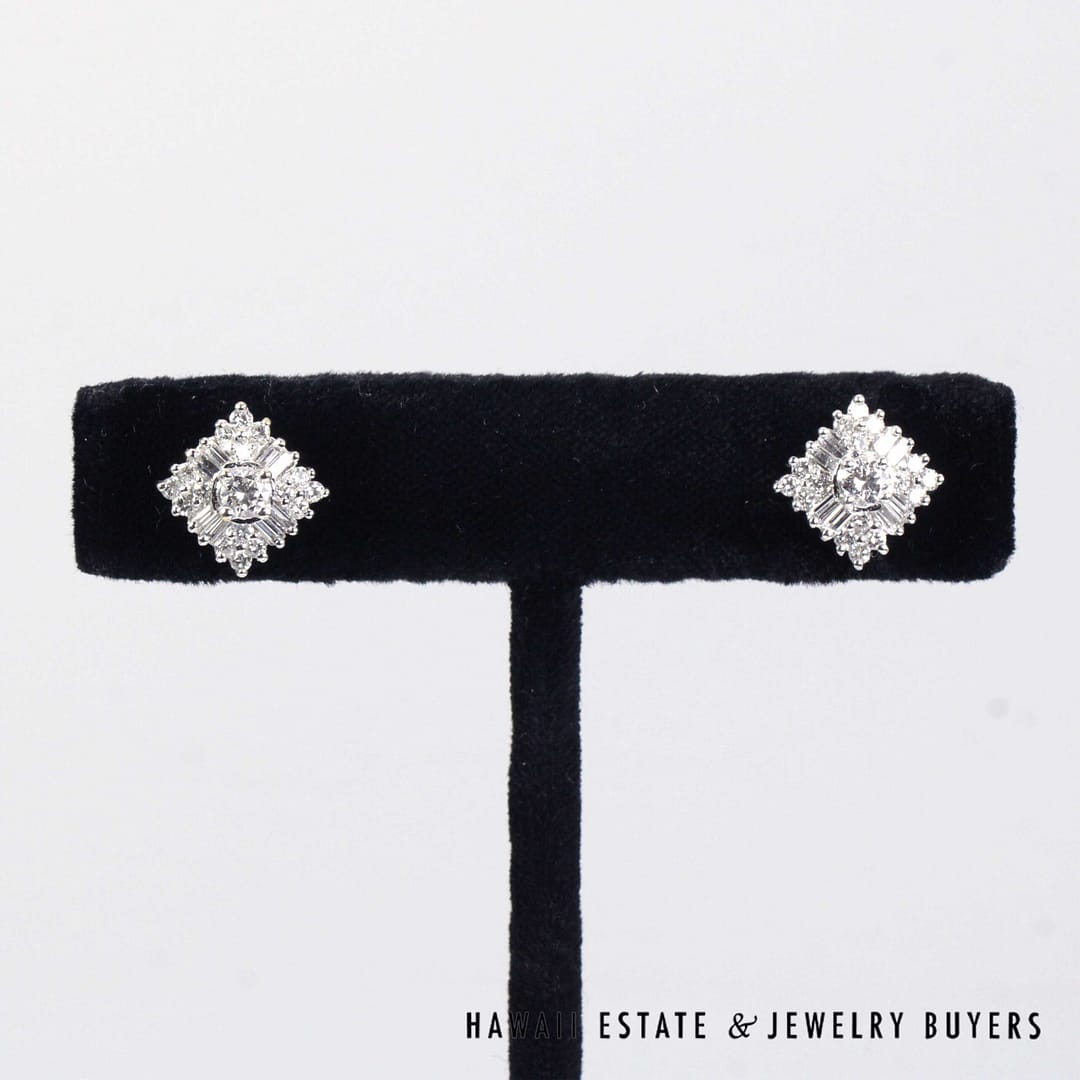 Sparkling cluster stud earrings featuring round and baguette-cut diamonds arranged in a brilliant square design, set in sleek 18K white gold for timeless elegance.