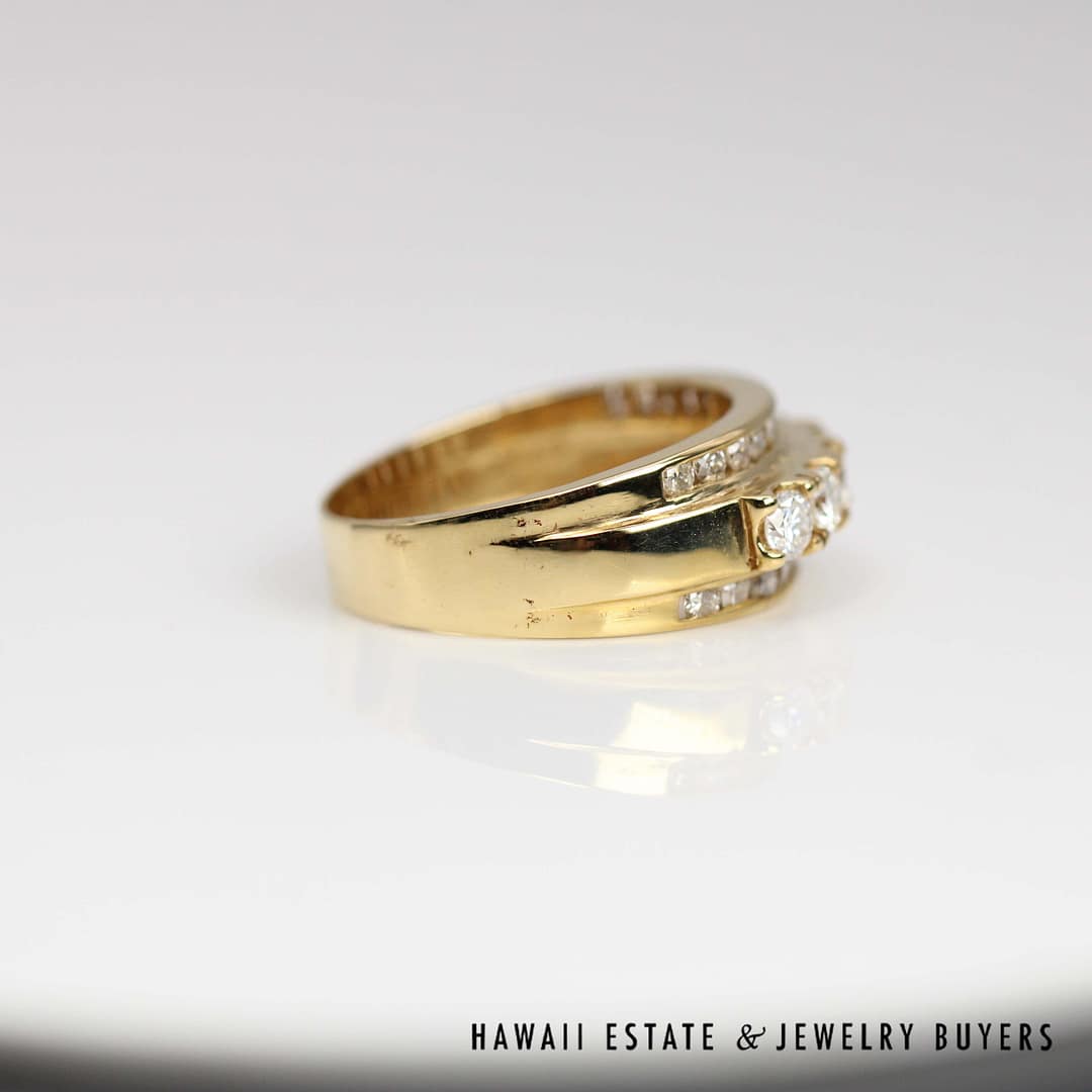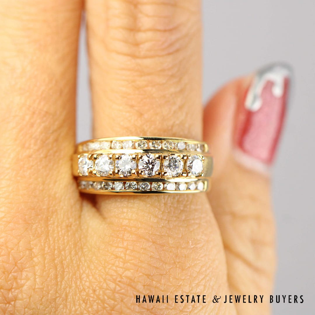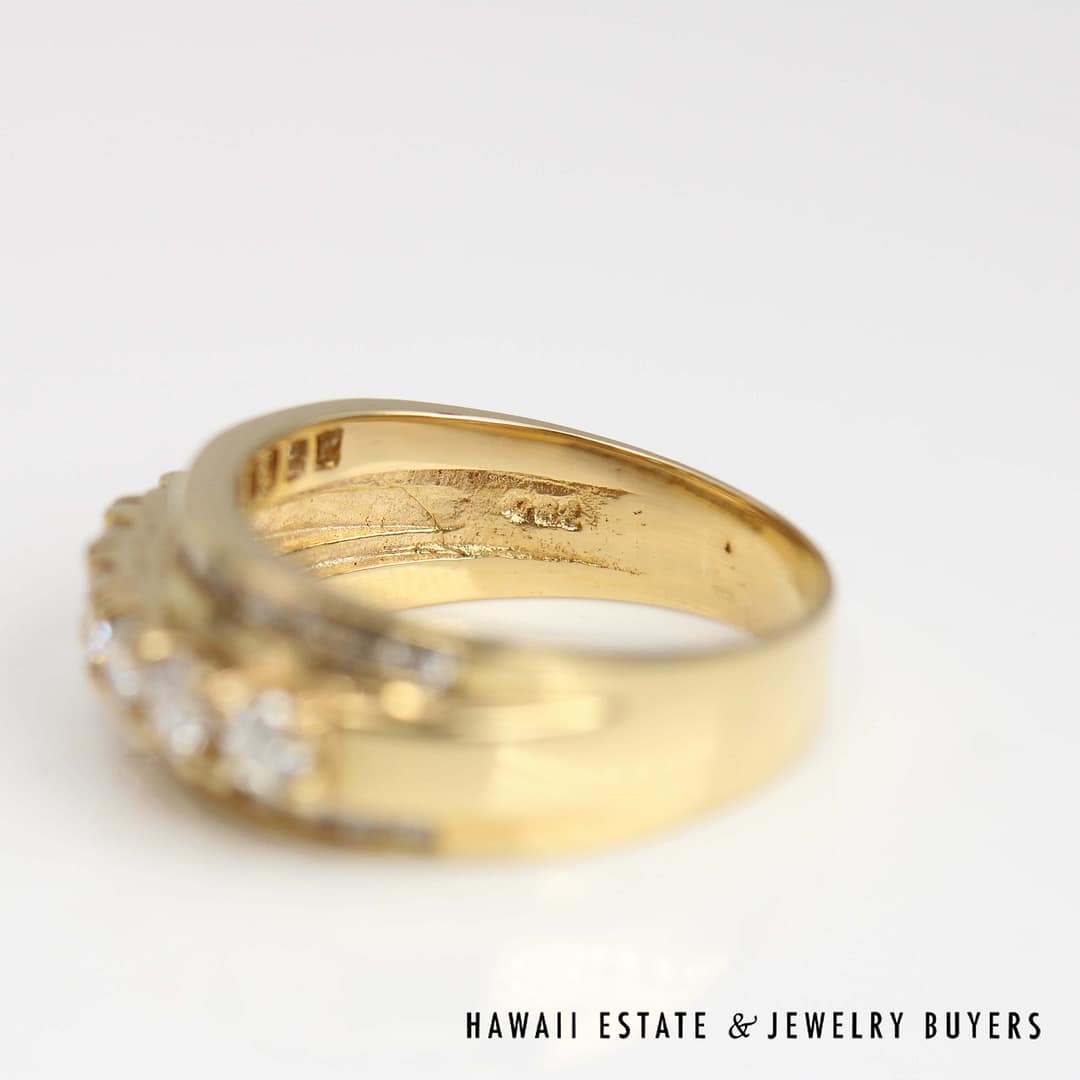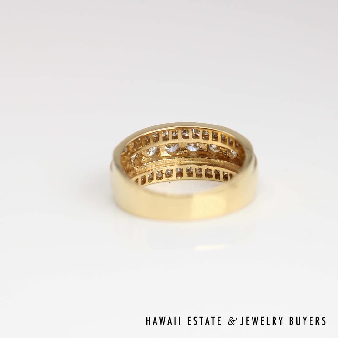 DescriptionBeautiful 3 row diamond ring approx 1ctw, stamped 7506.4g18KYG 1ctw SI/GH DIAMOND BAND SIZE 6.75 (061620-02) $2,300.001 in stock1ctw SI/GH Diamond 18k Yellow Gold Band Size 6.75, 6.4g quantityAdd to cartMake OfferSKU: 061620-02Category: Pre-owned Diamond JewelryRelated StylesSKY BLUE TOPAZ & DIAMOND 18K WHITE GOLD EARRINGS & PENDANT SET$1,850.009.27CTW DIAMOND BAGUETTE 18K YELLOW GOLD HINGED BANGLE BRACELET$8,000.00DIAMOND 4.2CTW 14K YELLOW GOLD TENNIS BRACELET 7″$4,200.00NATURAL RUBY & 2.23CTW OLD MINE CUT DIAMOND MARQUISE SHAPE 14K YELLOW GOLD RING$9,500.00