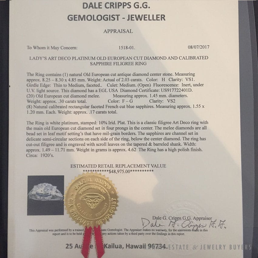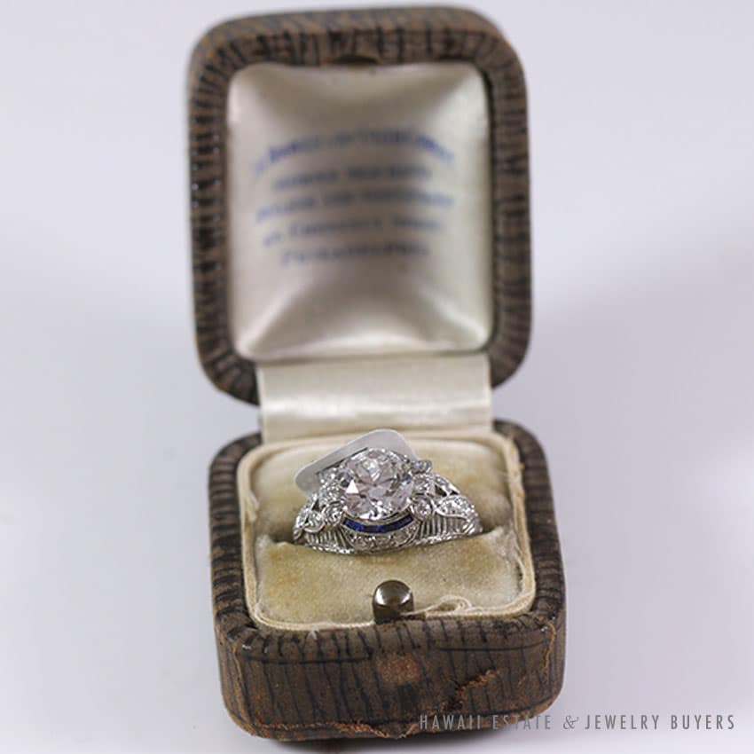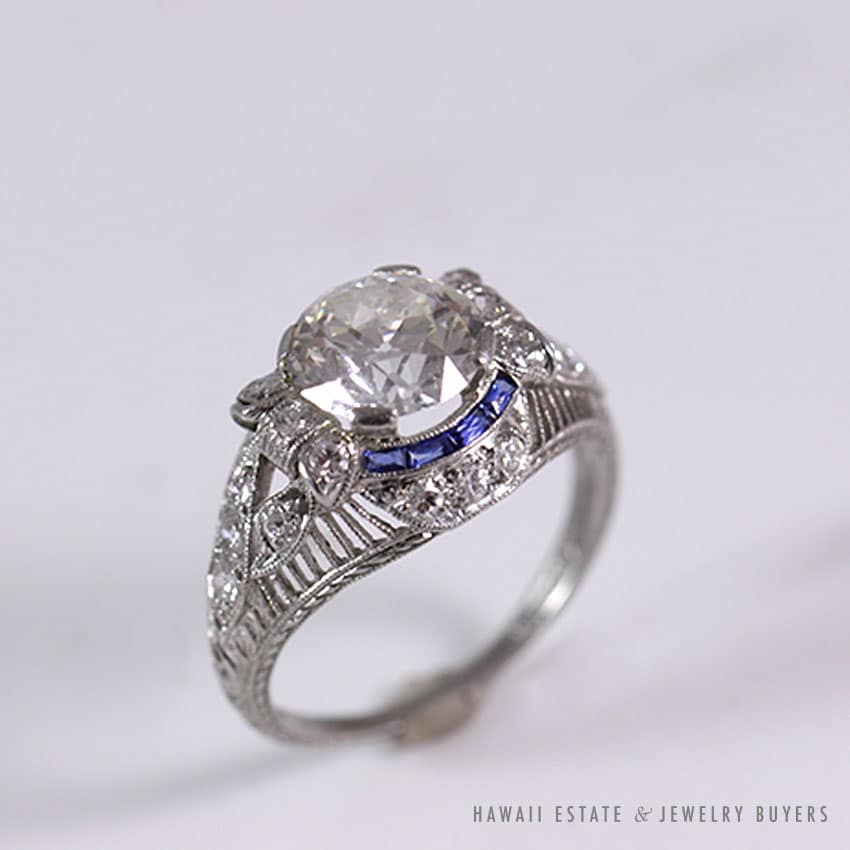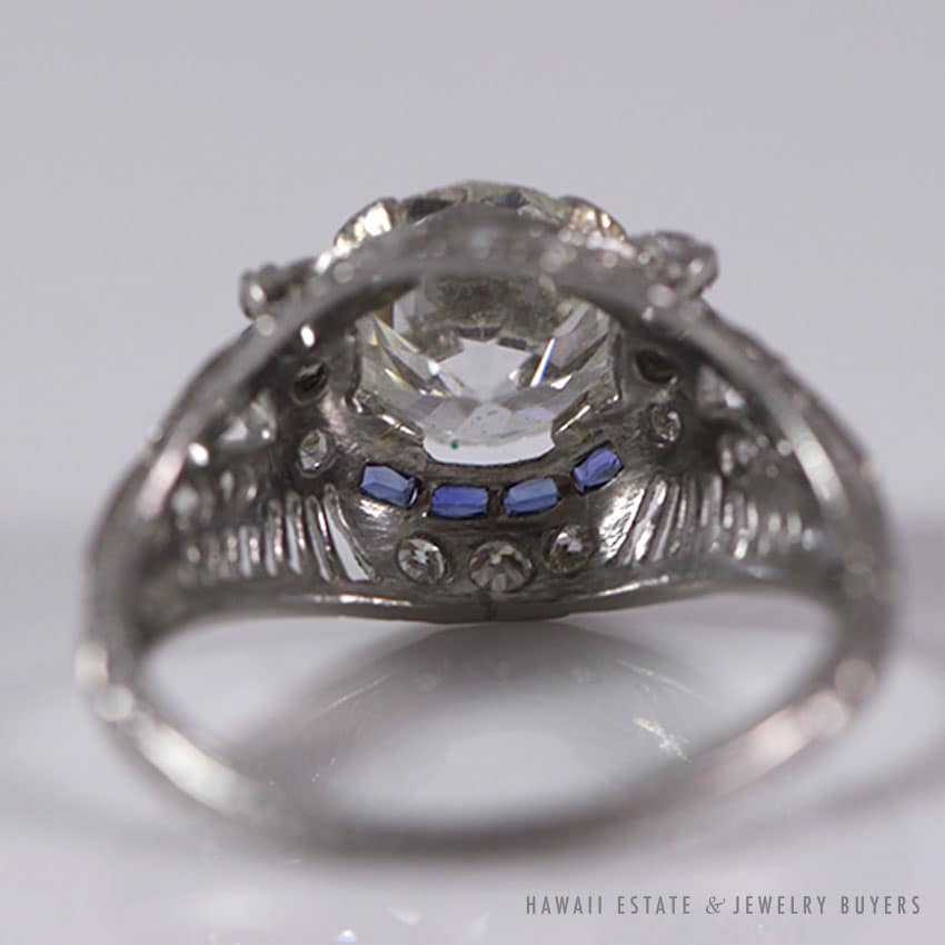 This is a classic Art Deco ring with the main old European cut diamond set in four prongs in the center. The melee diamonds are all bead set in leaf motif settings that have mil-grain borders. The sapphires are channel set in delicate semi-circular sections on each side of the ring, below the center diamond. The ring has cut-out filigree and is engraved with scroll leaves on the tapered & barreled shank.