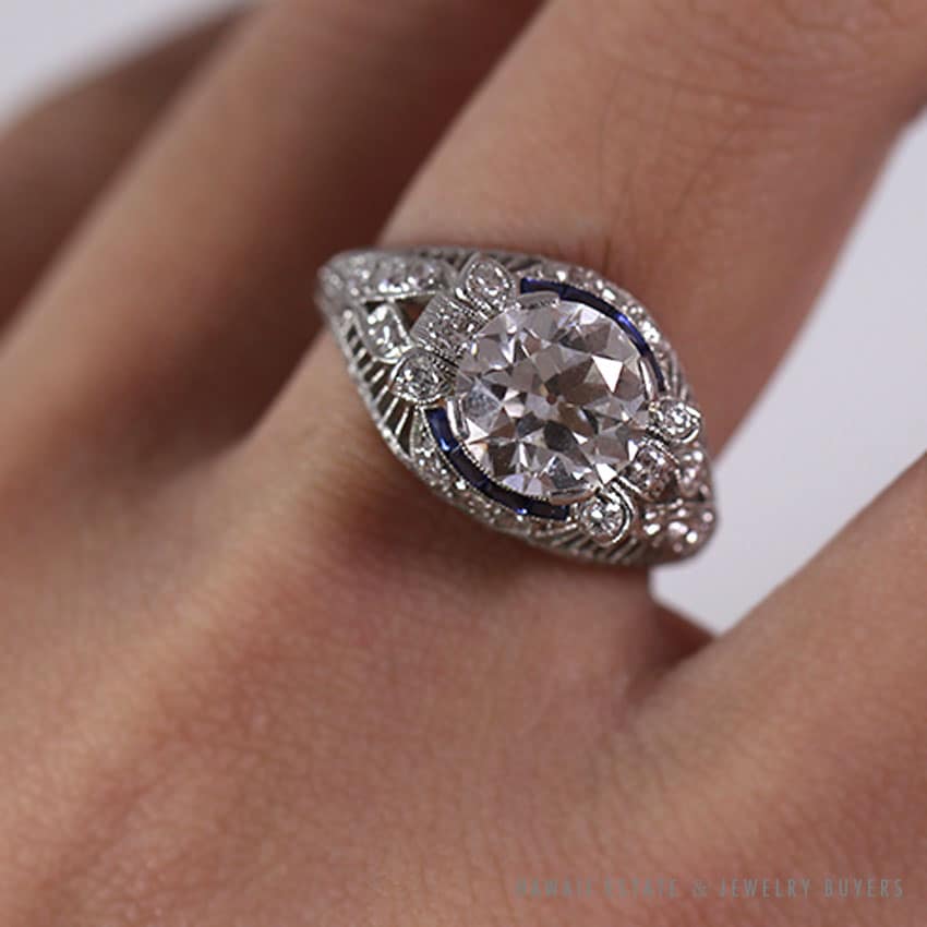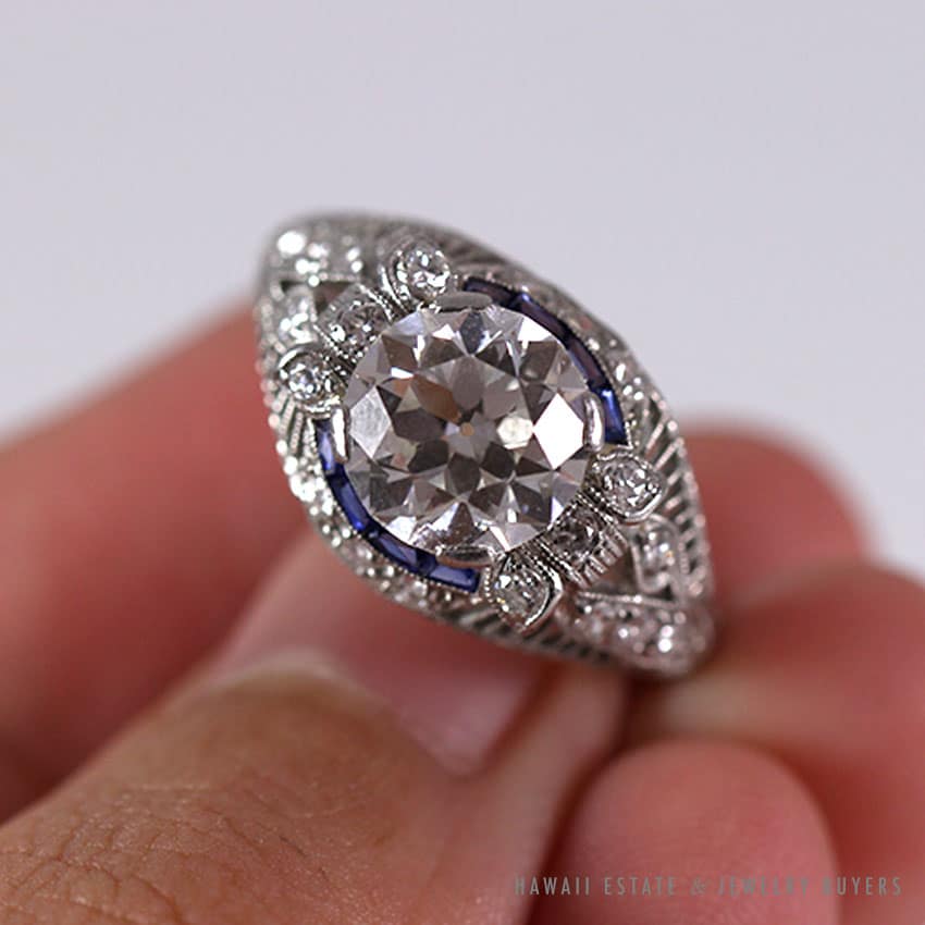 The ring contains (1) natural Old European cut antique diamond center stone. Measuring approx. 8.25 – 8.30×4.85mm. Weight: actual of 2.03 carats. Color: H Clarity: VS1.