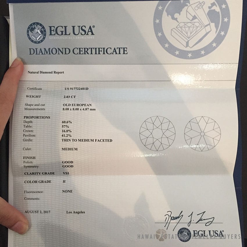 This diamond has an EGL USA Diamond Certificate: US917722401D.