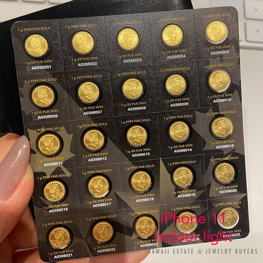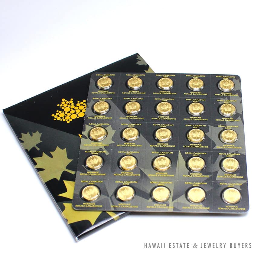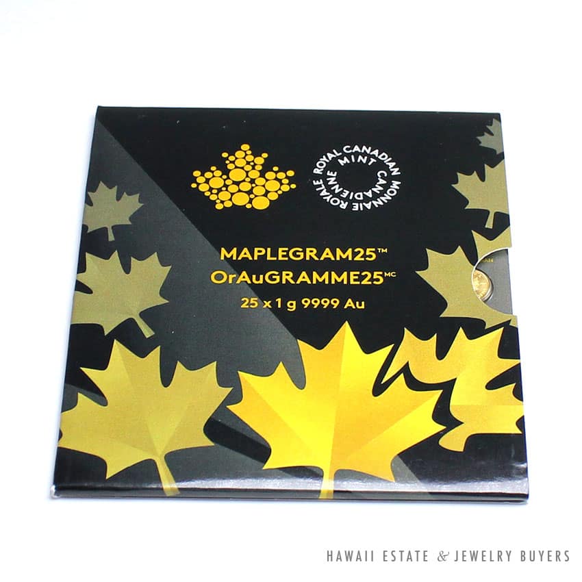 CONSISTS OF 25 MAPLE LEAF X 1 GRAM OF 9999 FINE GOLD AS 5X5 UNITS