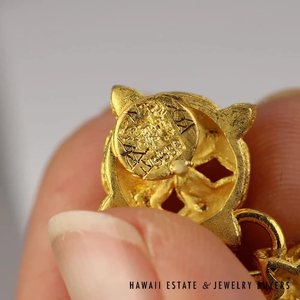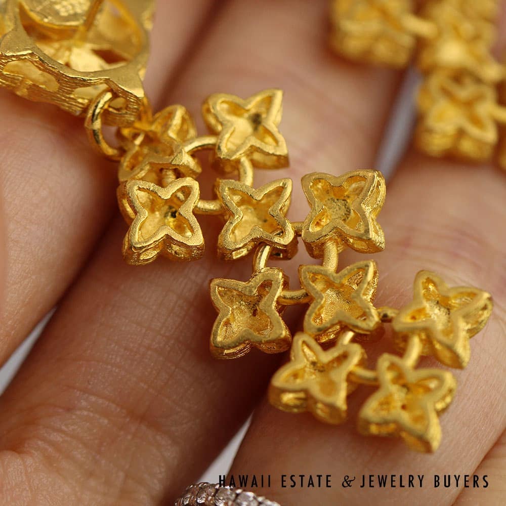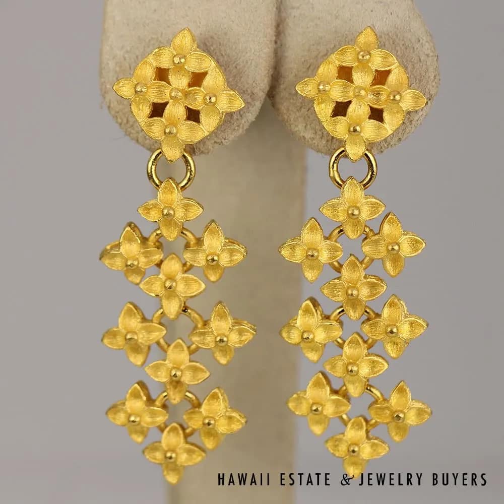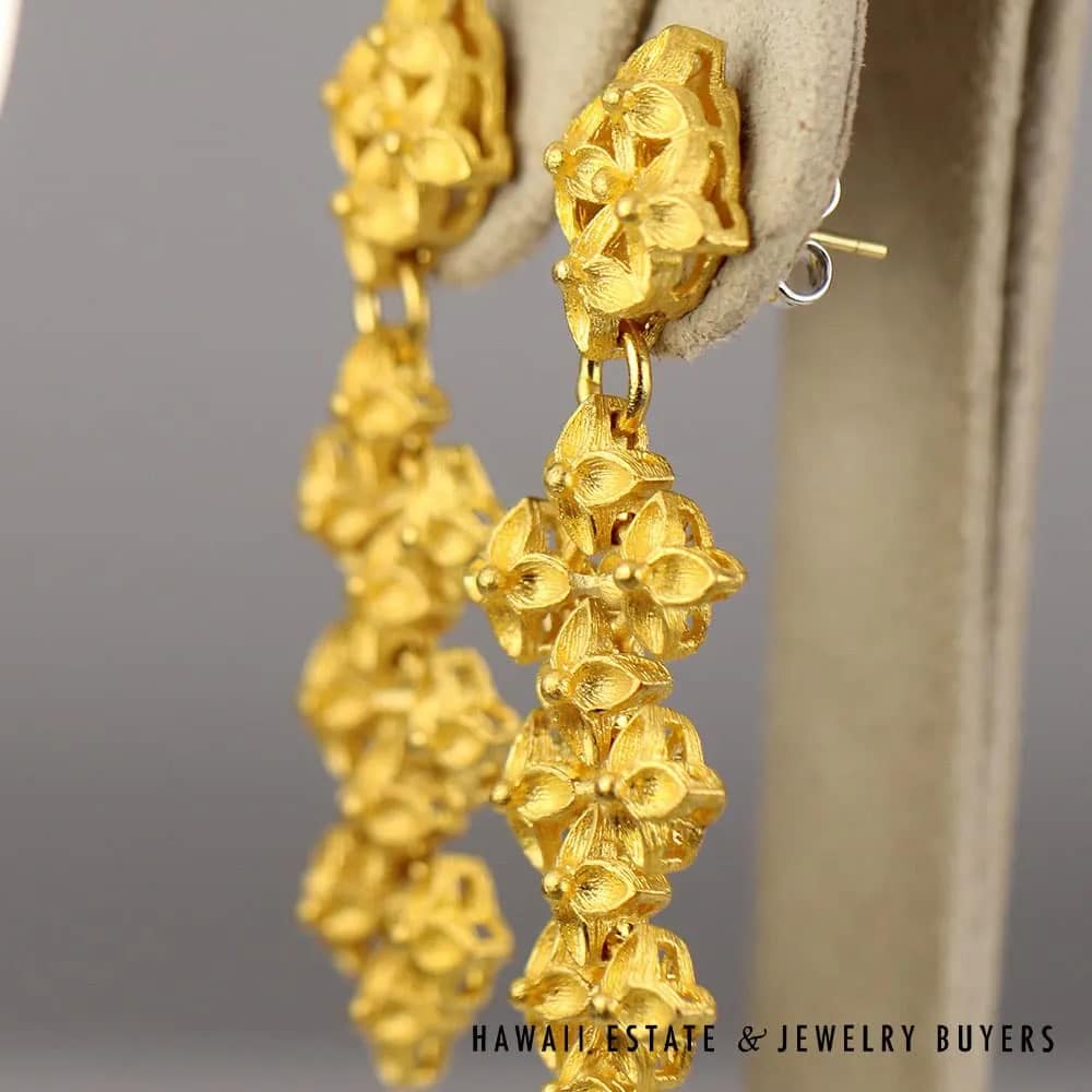 Add sophisticated elegance to your outfit with these stunning 22k yellow gold earrings. The high gold content makes an unmistakable beautiful warm gold color that is unmatched. Crafted with delicate intricate floral motifs, these dangle earrings measure 50x15mm.