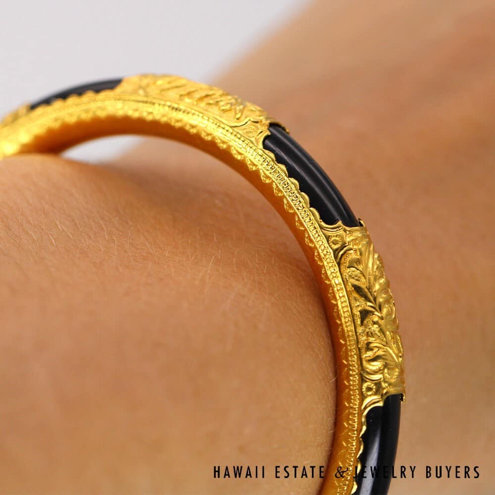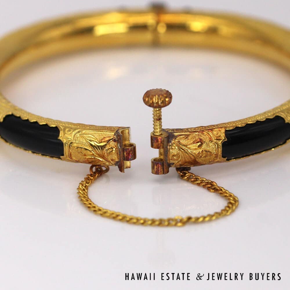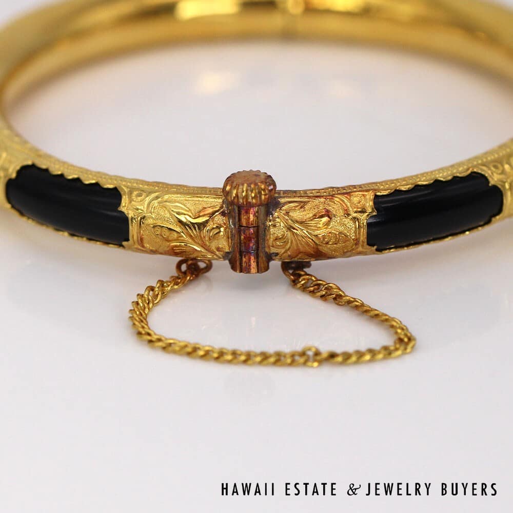 Rich golden details stand out against a black backdrop with this stylish bangle bracelet.