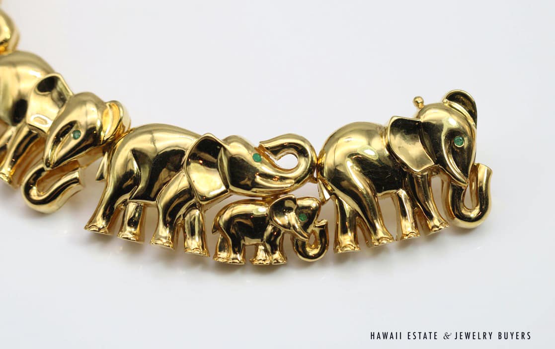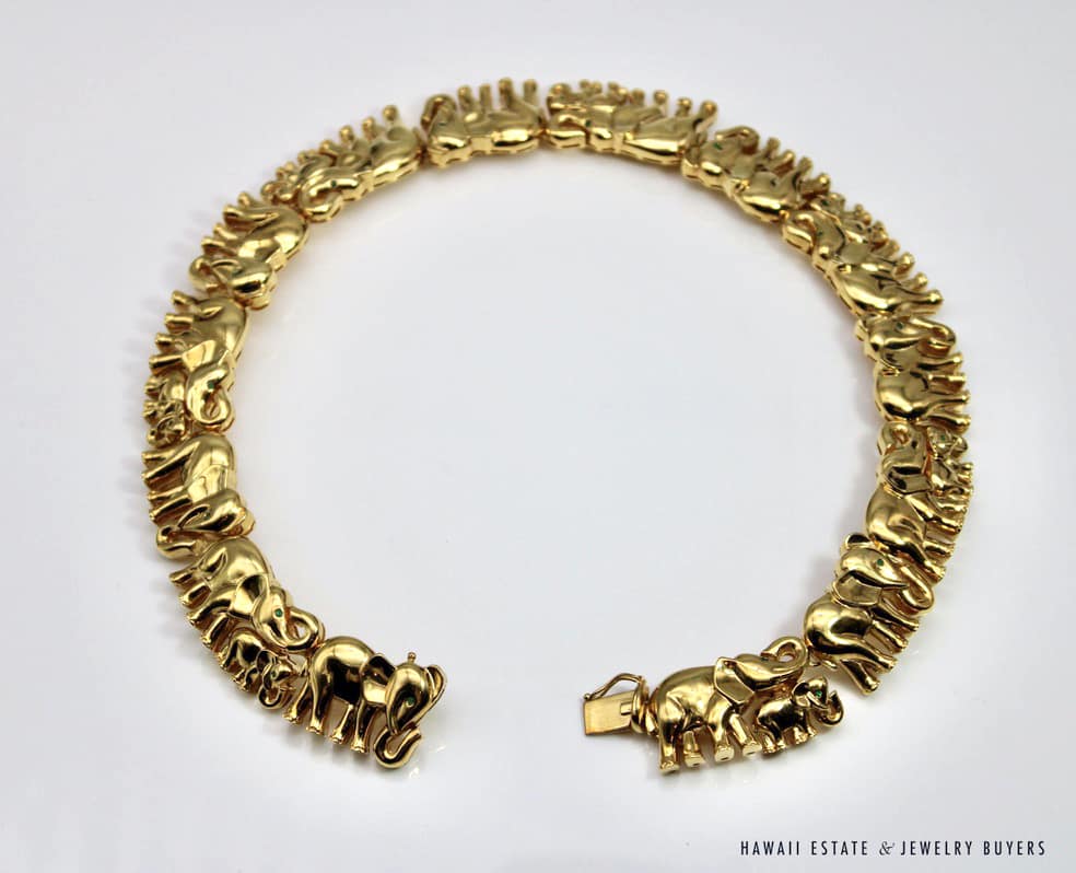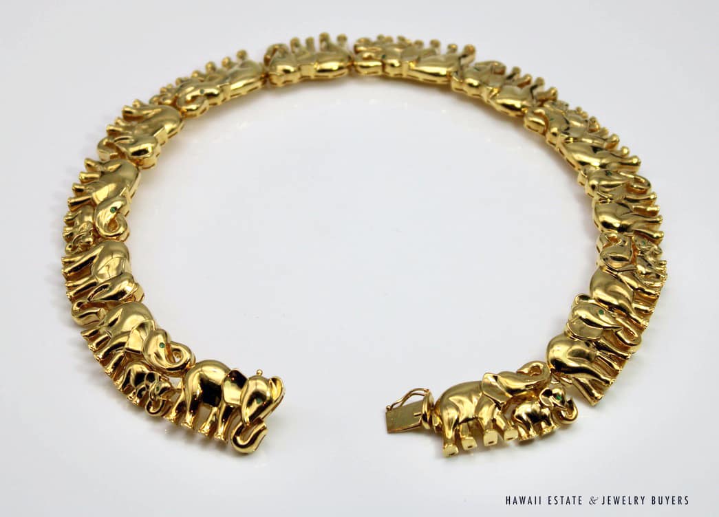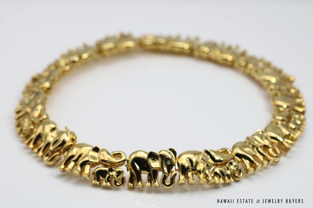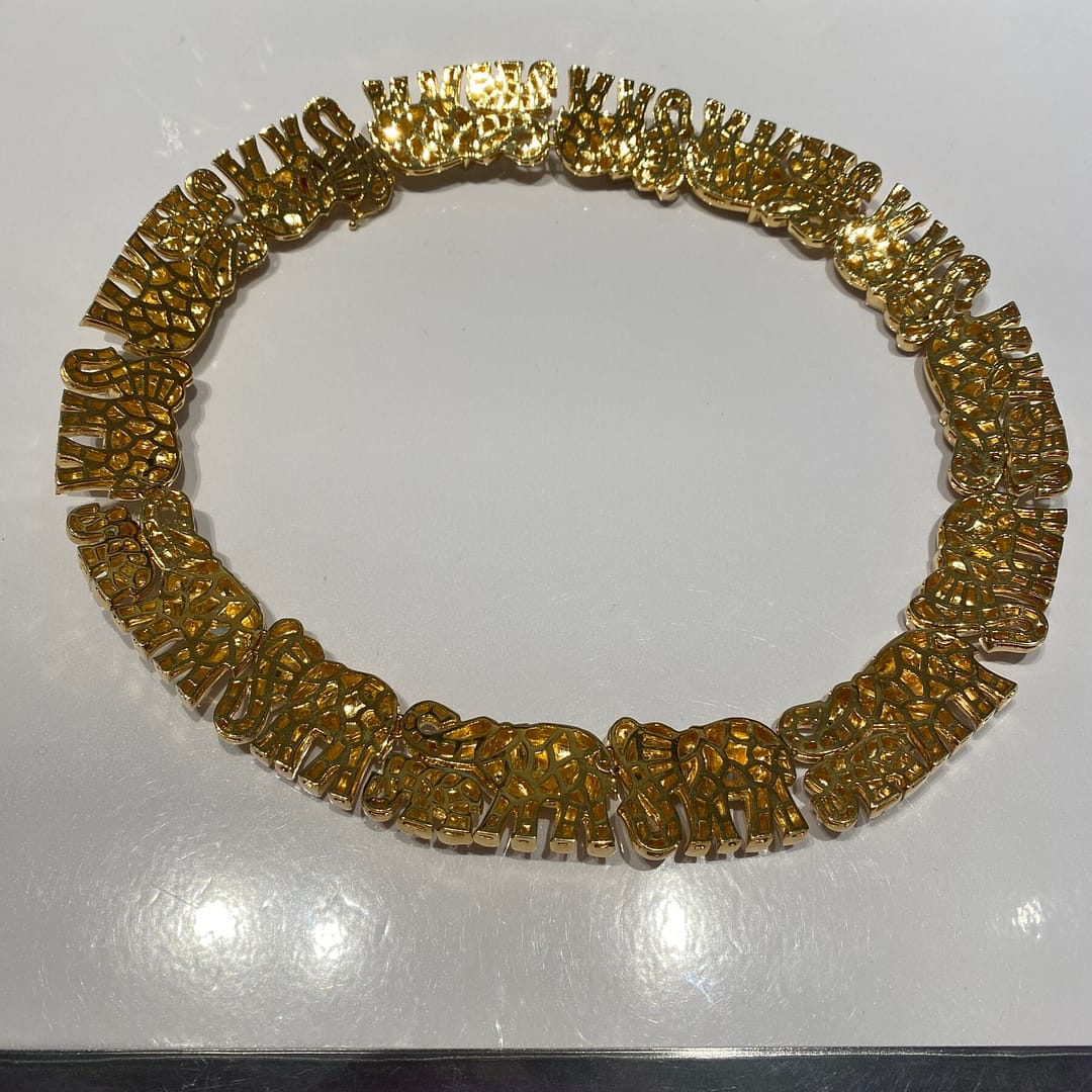 Home » Shop » 235g 18KYG 0.45ctw EMERALD ELEPHANT COLLAR NECKLACE 16 INCH
