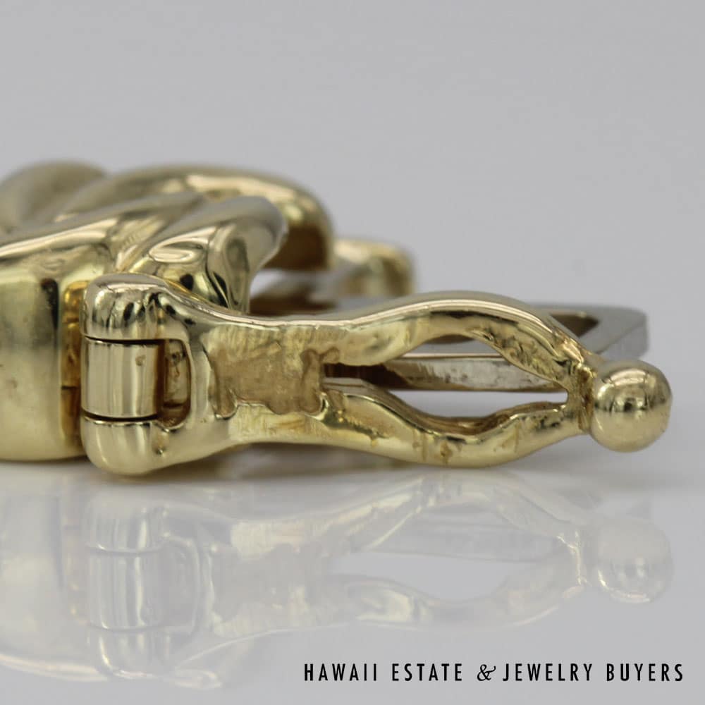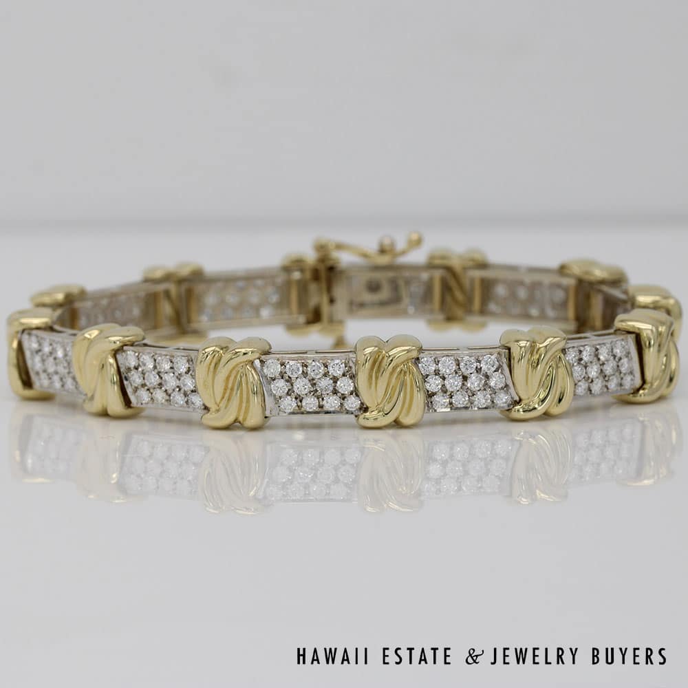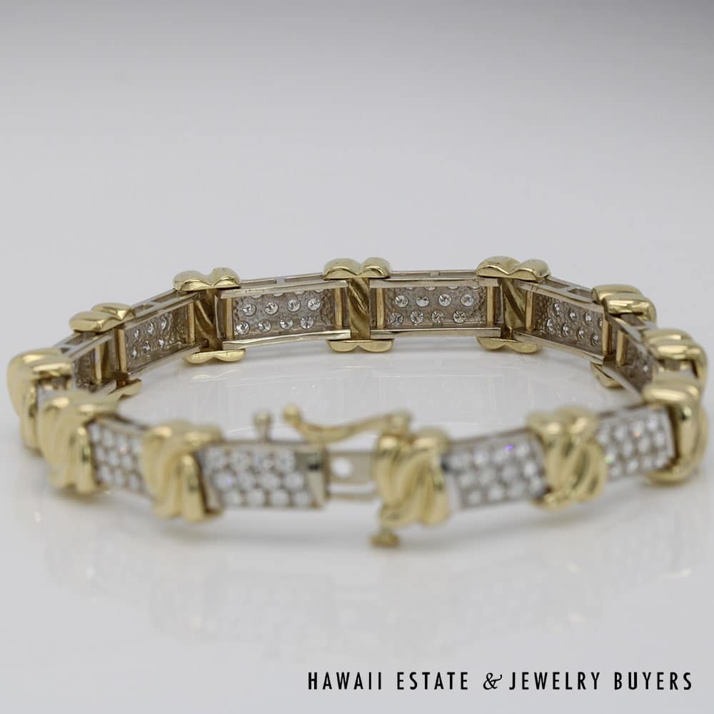 This bracelet weighs 24.3g and is SIZE 6.5. It is stamped 14K on the clasp/closure and is two-toned. Diamonds are set in white gold and are accented by a yellow gold design.