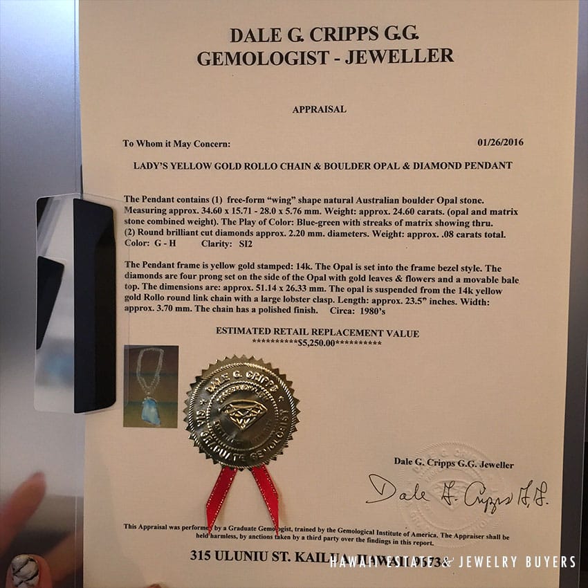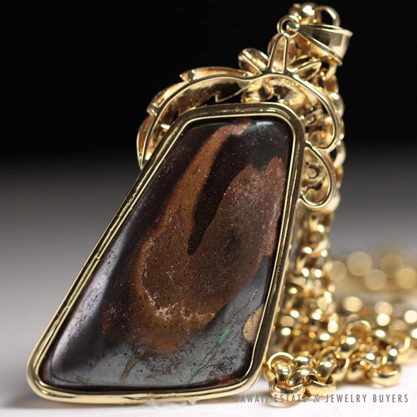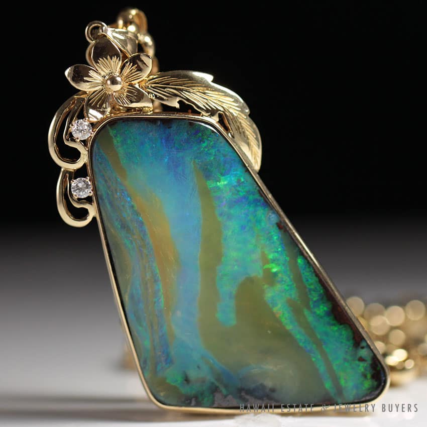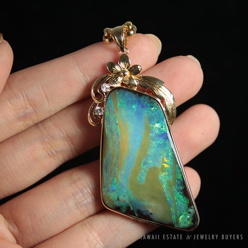 Description24.60ct Blue Australian Boulder Opal Diamond 14k PendantMetal: 14K Yellow GoldOpal Weight: 24.60ctsDiamond Weight: .08 ctw (G-H / SI2)Chain Size: 23.5″x 3.70 mm thicknessSKU: 1760-06SOLD$1,300.00Out of stockSKU: 1760-06Category: Pre-owned Vintage JewelryRelated StylesNatural Grade A White Jade Archer Ring$3,800.00Natural Grade A Jade Cabochon Ring$8,500.00Natural GIA Certified Ruby Diamond Ring$6,800.00Certified Grade A Natural Jade Cabochon Ring$5,800.00