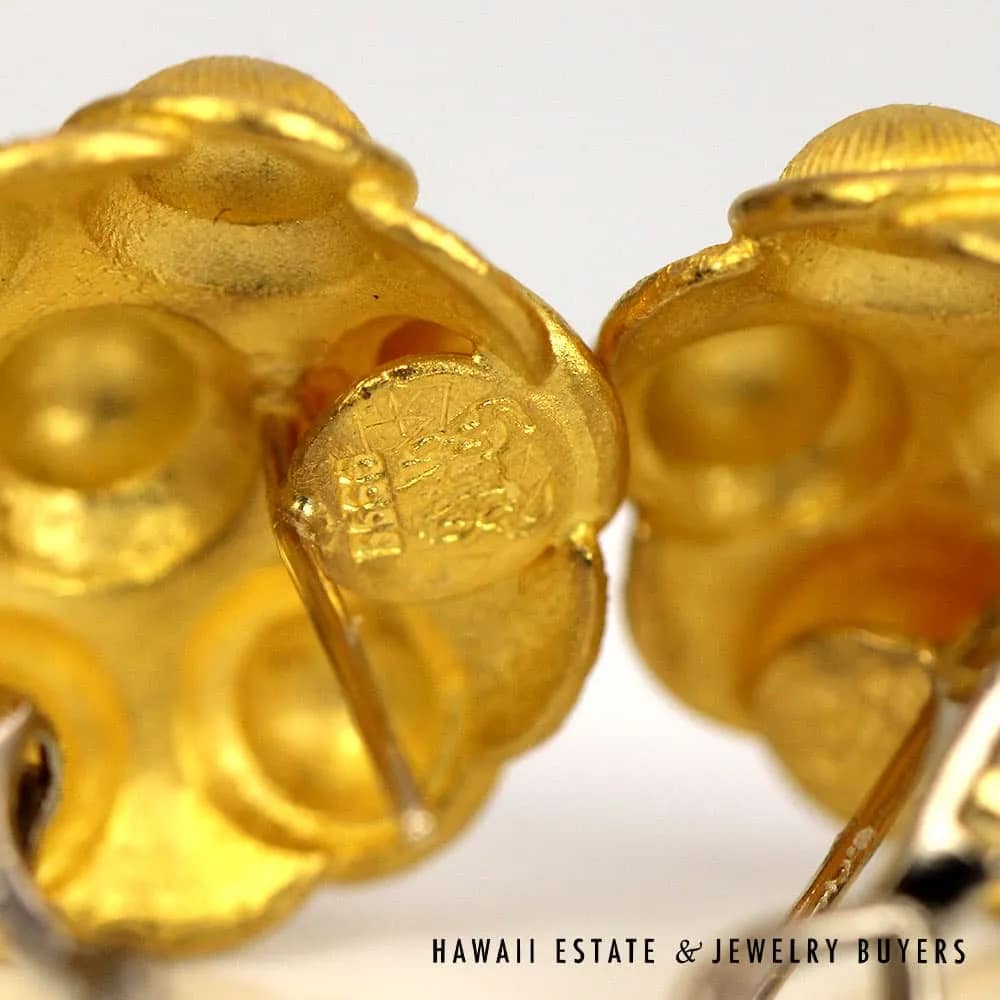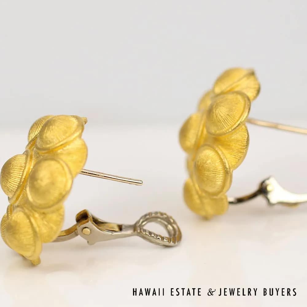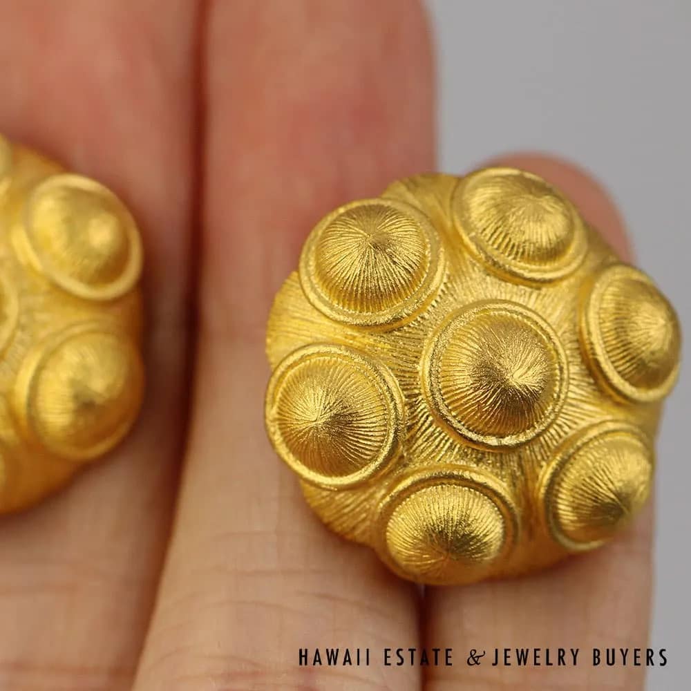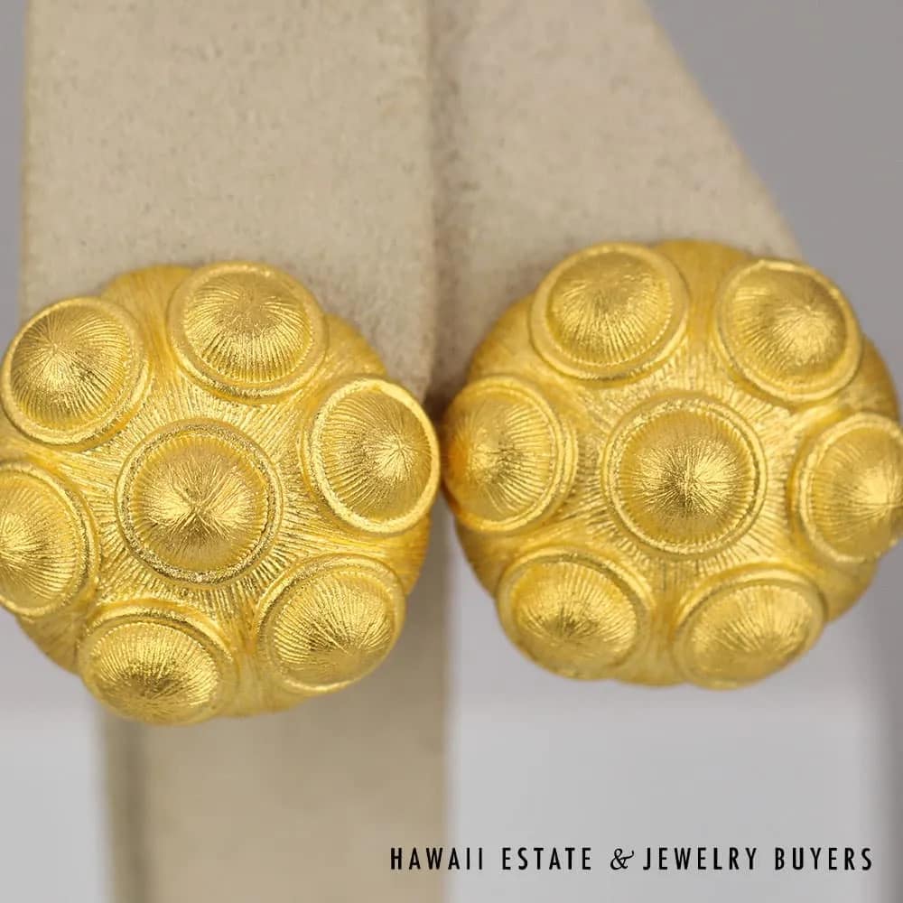 GORGEOUS 24K yellow gold post + clip earrings. The gold purity creates a recognizable gorgeous warm gold color. The satin-finished bubble design adds a unique touch. Their 22mm diameter and intricate detail are beautiful. Stamped 9999