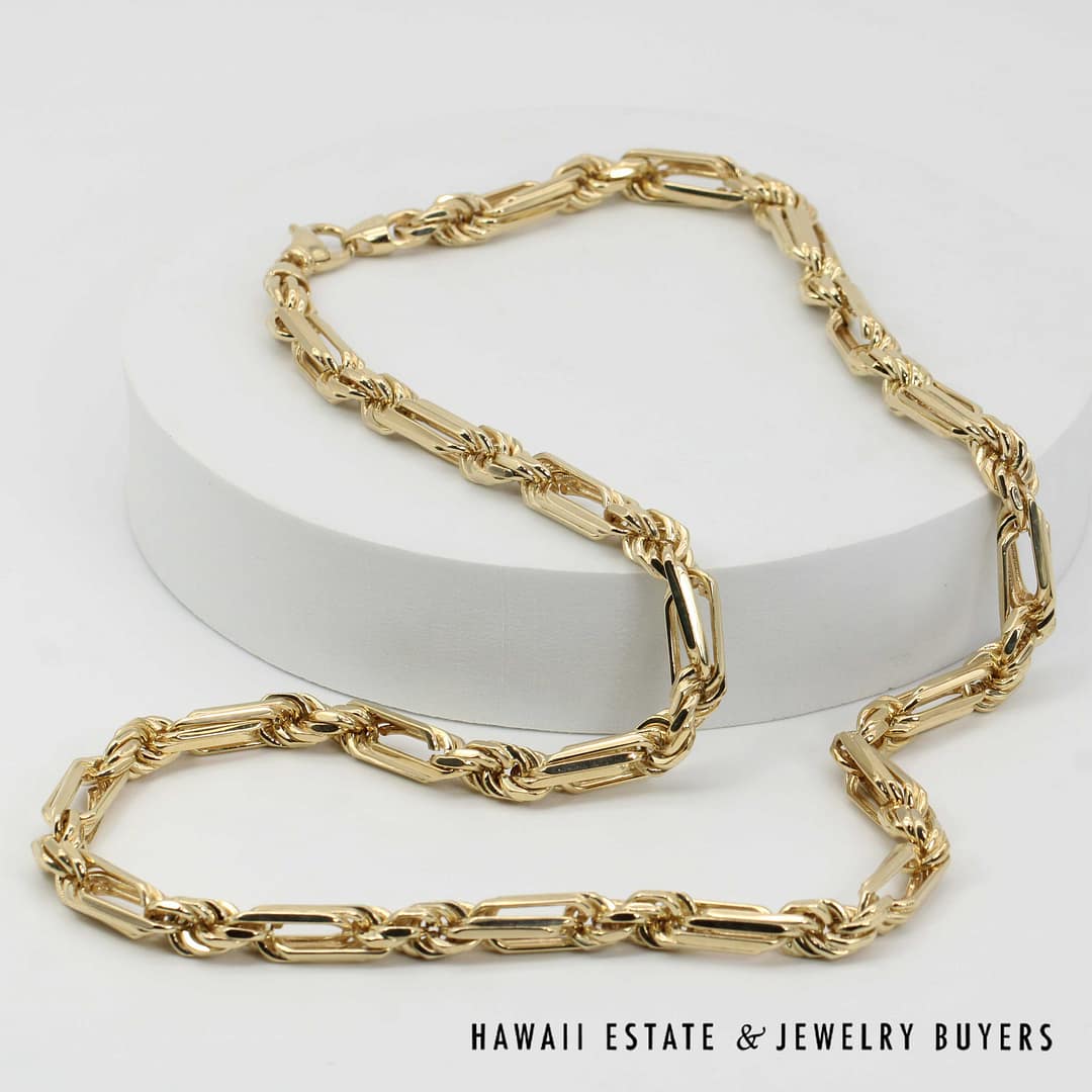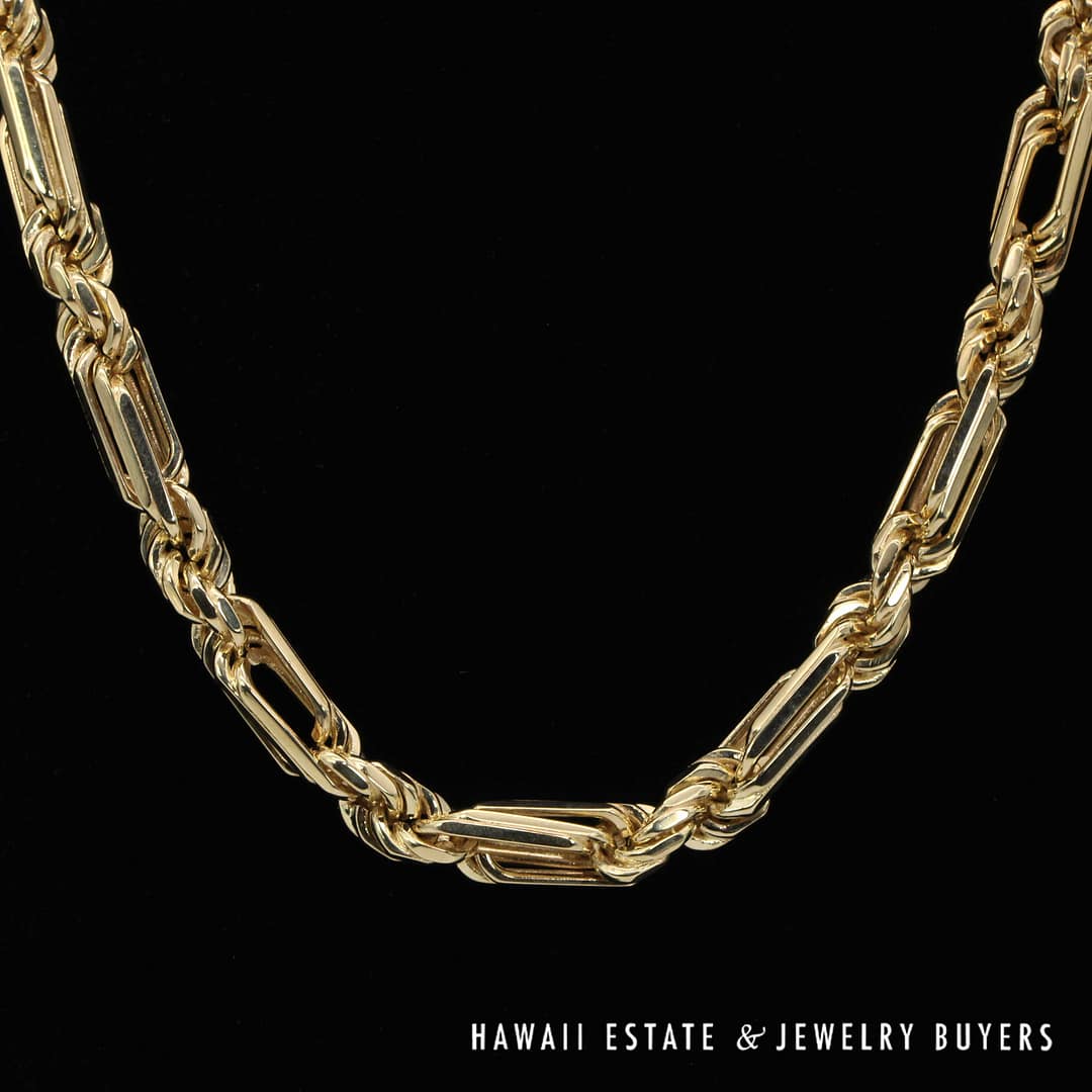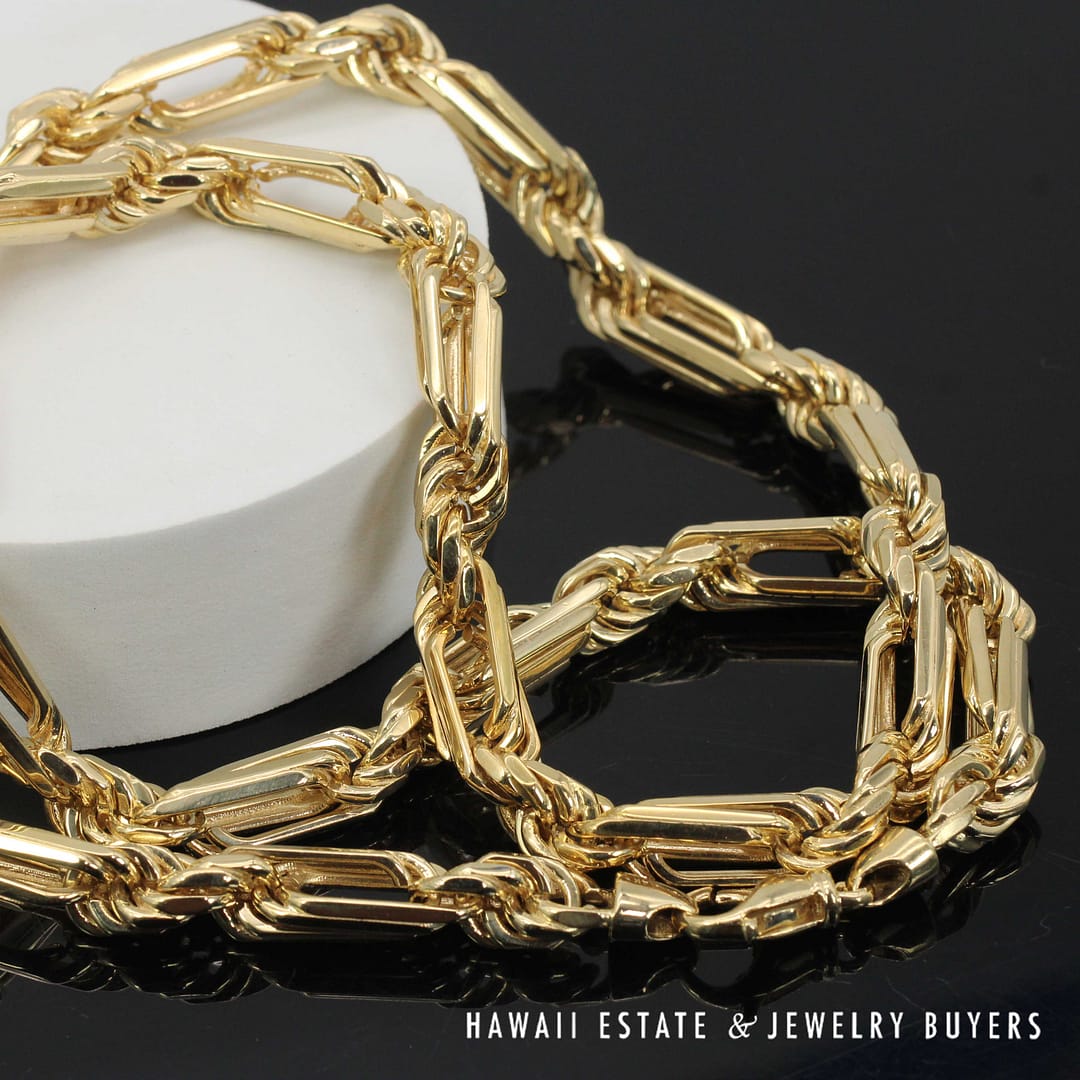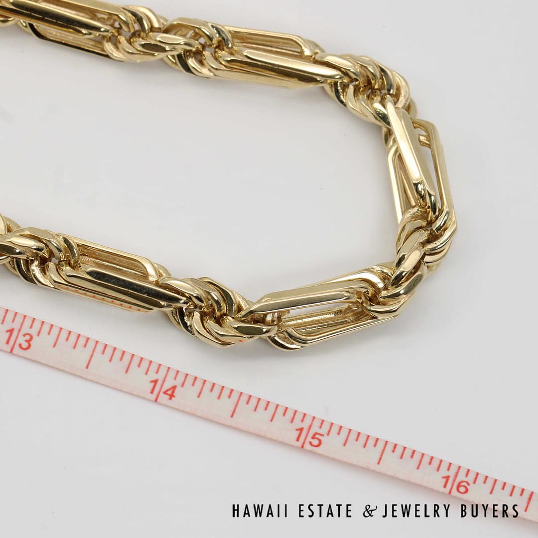 DescriptionThis stunning 14K yellow gold chain features a unique elongated and textured link design, creating a bold yet elegant statement.265.6g 14KYG 10mm MILANO 31 INCH CHAIN (3104-01)$20,935.001 in stock265.6g 14K Yellow Gold Milano 10mm 31" Chain Necklace quantityAdd to cartBuy withMake OfferSKU: 3104-01Category: Pre-owned gold jewelryRelated StylesMING’S 4.1g 14KYG 8mm PHOENIX BAND RING SIZE 6$1,250.00FRATELLI BOVO 9.4g 14KYG LEAF NECKLACE 17 INCHES W/ 2 INCH EXTENSION$1,600.00MING’S 4.8g 14KYG SHOU 8.5mm DOMED RING SIZE 6$1,450.006.2g 14KYG 1.50ct OPAL AND 0.10ctw DIAMOND RING SIZE 7.75$900.00
