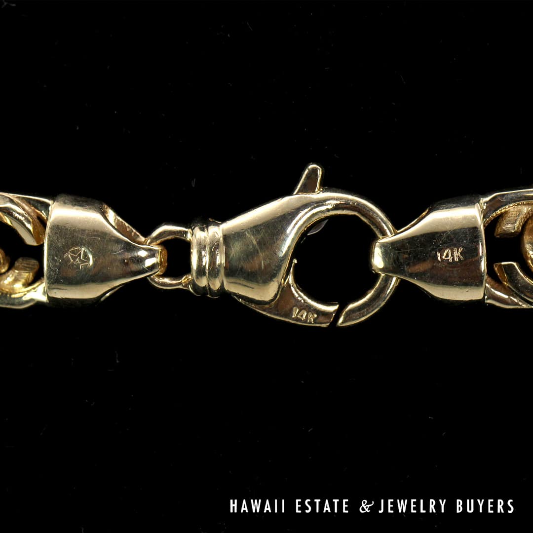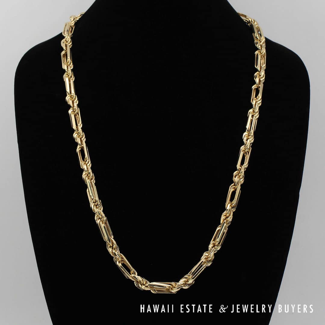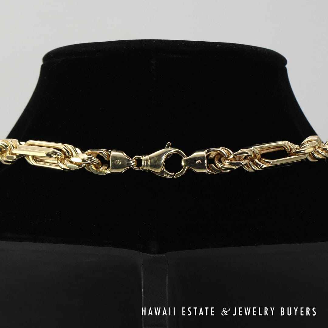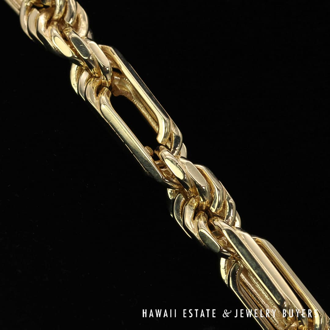 DescriptionThis stunning 14K yellow gold chain features a unique elongated and textured link design, creating a bold yet elegant statement.265.6g 14KYG 10mm MILANO 31 INCH CHAIN (3104-01)$20,935.001 in stock265.6g 14K Yellow Gold Milano 10mm 31" Chain Necklace quantityAdd to cartBuy withMake OfferSKU: 3104-01Category: Pre-owned gold jewelryRelated StylesMING’S 4.1g 14KYG 8mm PHOENIX BAND RING SIZE 6$1,250.00FRATELLI BOVO 9.4g 14KYG LEAF NECKLACE 17 INCHES W/ 2 INCH EXTENSION$1,600.00MING’S 4.8g 14KYG SHOU 8.5mm DOMED RING SIZE 6$1,450.006.2g 14KYG 1.50ct OPAL AND 0.10ctw DIAMOND RING SIZE 7.75$900.00