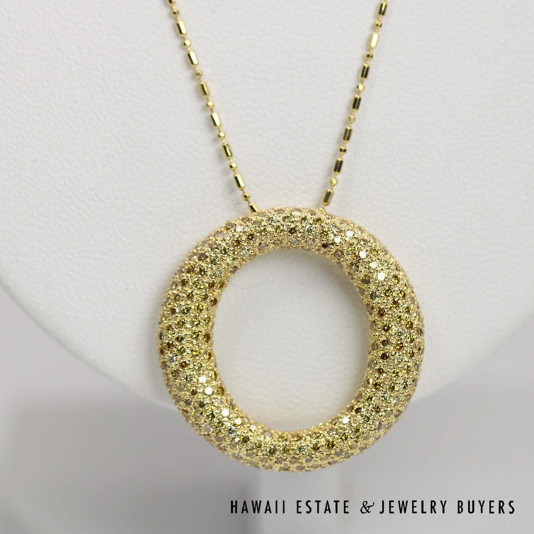 2ctw of dazzling diamonds! Diamonds are SI clarity fancy yellow color; chain is yellow gold bead and bar. Circle measures approx. 28mm outside diameter.