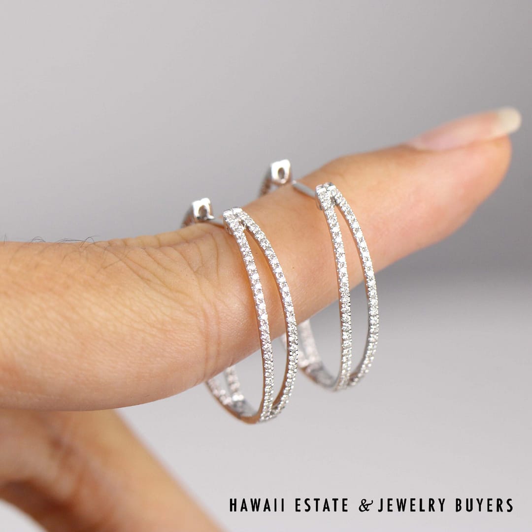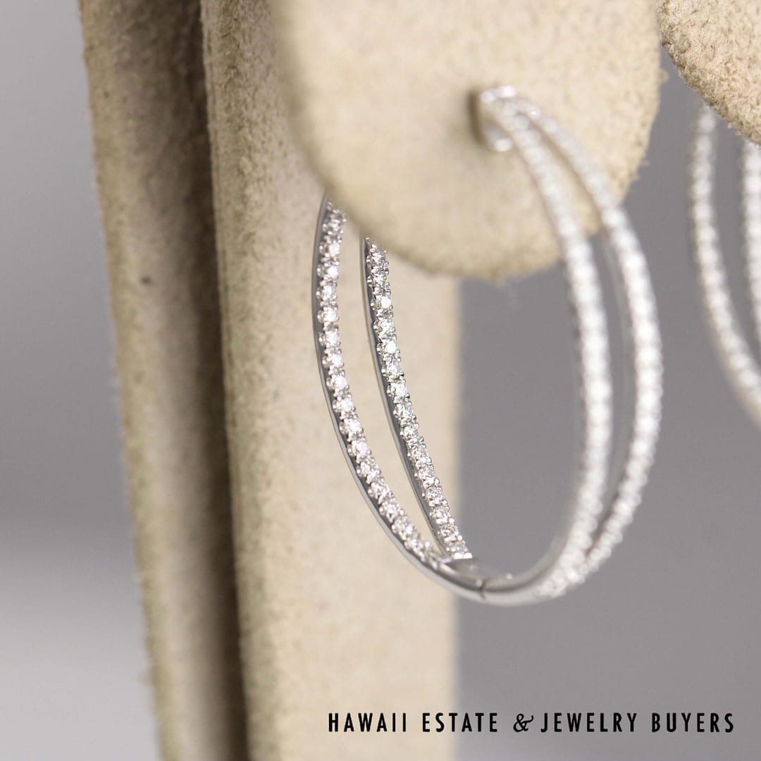 DescriptionStunning hoop earrings feature front facing diamonds on both the outter front and inside, as shown. Dazzling gift for someone special or for self!3.5g 18KWG 0.47ctw DIAMOND FRONT AND BACK HOOP EARRINGS (3039-03)$990.001 in stock3.5g 18KWG 0.47ctw Diamond Front and Back Hoop Earrings quantityAdd to cartMake OfferSKU: 3039-03Category: Pre-owned Diamond JewelryRelated Styles9.27CTW DIAMOND BAGUETTE 18K YELLOW GOLD HINGED BANGLE BRACELET$10,700.004.02ct Princess Cut Diamond Ring GIA H, VS1$75,000.002CTW PRINCESS CUT DIAMOND HEAVY 36.9g 18K YELLOW GOLD HINGED BANGLE BRACELET$7,950.00GIA CERTIFIED 4.4g 18K TWO TONE 4.71ct CUSHION CUT PINK-PURPLE SAPPHIRE 0.45ctw DIAMOND RING SIZE 5$25,000.00