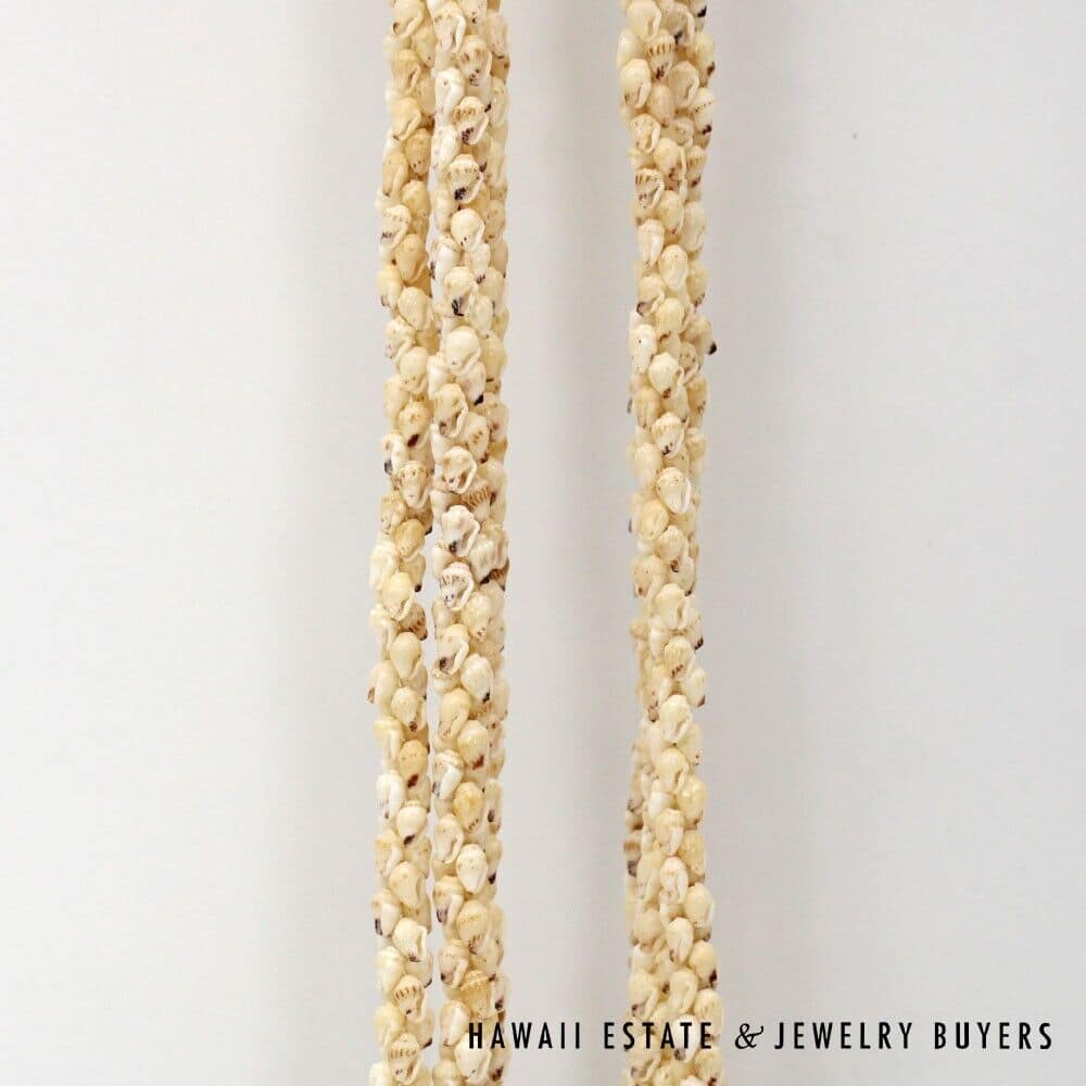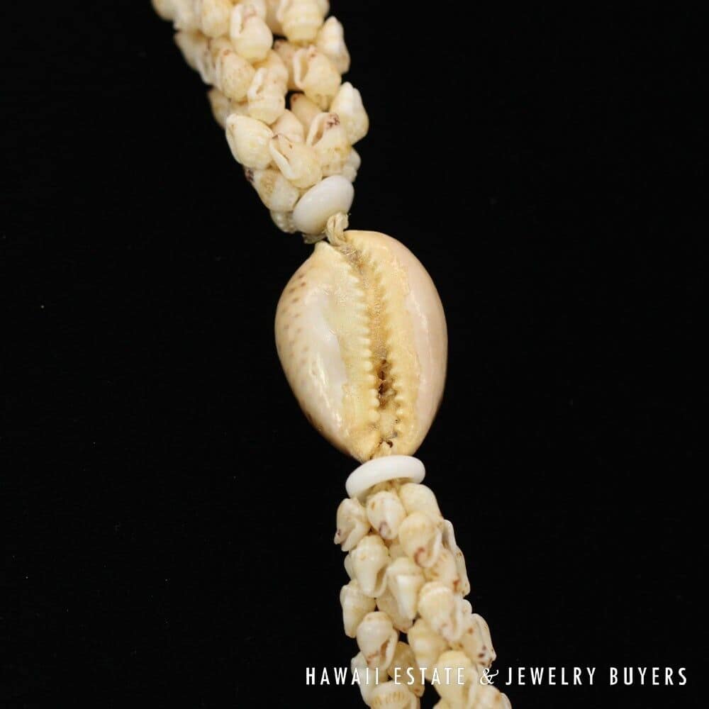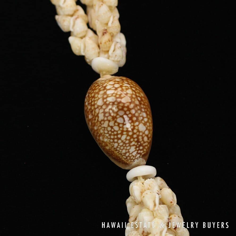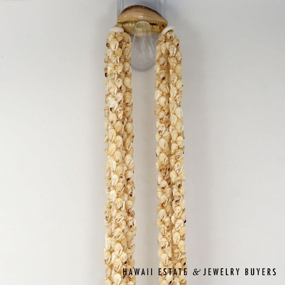 All shells are of the Momi (Dove shell) variety with Lenalena (yellow/off white) and Lenalena Kua Ele (yellow/off white with black dotted tip) colorations. The strands are connected by a 28mmX18mm Pōleholeho (decorative shell that ties the ends of each strand together) of the Malina (smooth cowrie shell) variety with a rich spotted pattern.