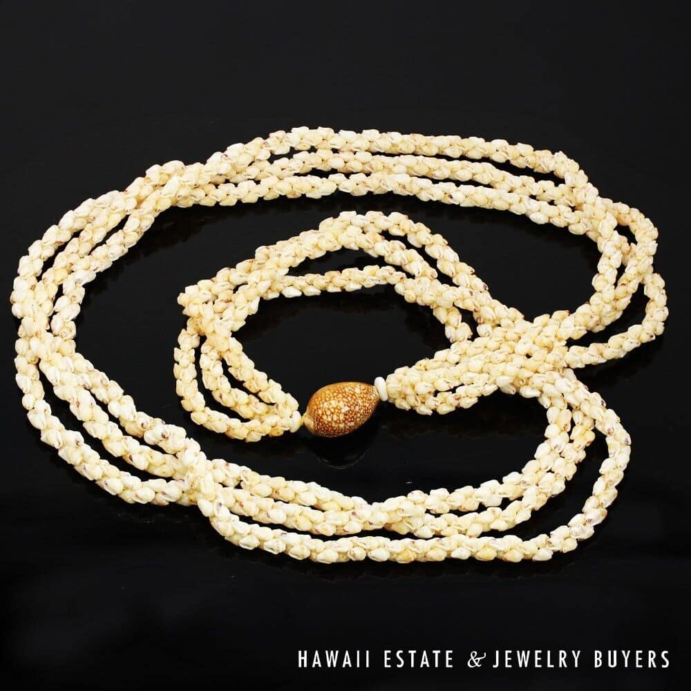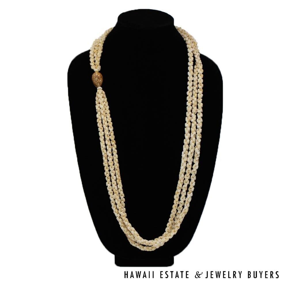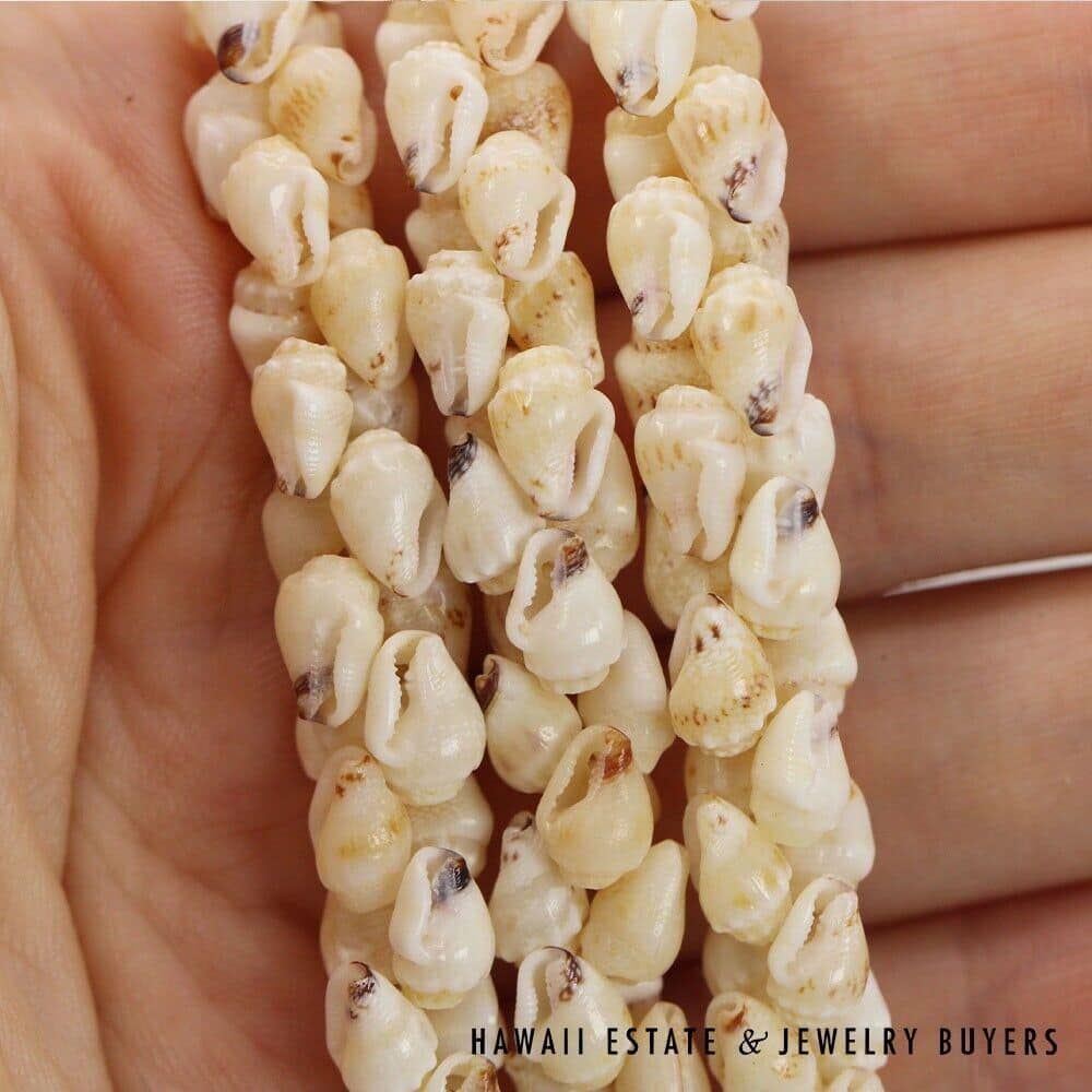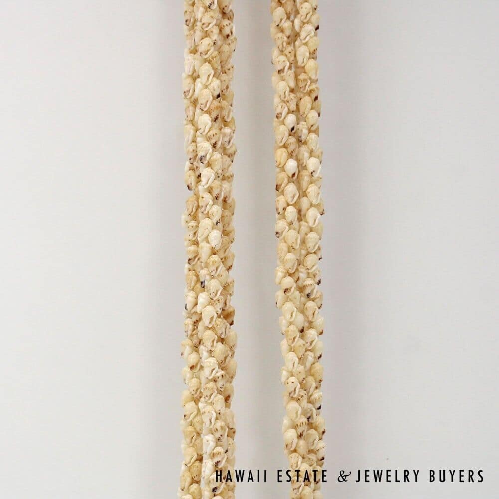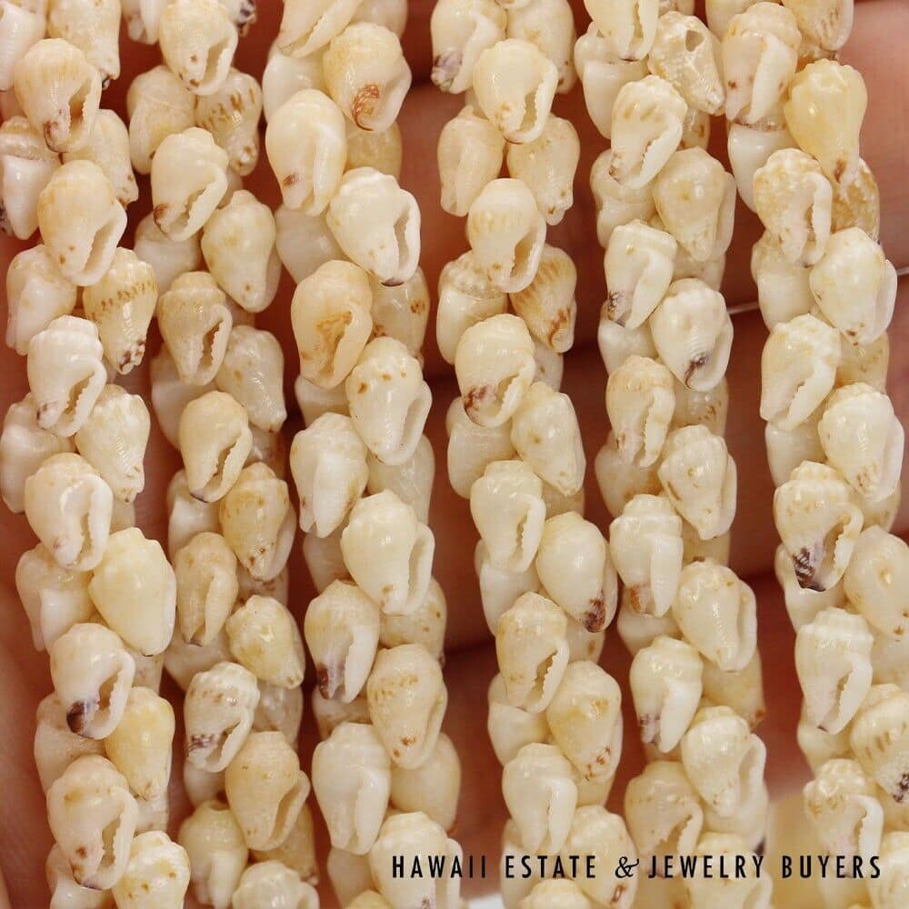 All shells are of the Momi (Dove shell) variety with Lenalena (yellow/off white) and Lenalena Kua Ele (yellow/off white with black dotted tip) colorations. The strands are connected by a 28mmX18mm Pōleholeho (decorative shell that ties the ends of each strand together) of the Malina (smooth cowrie shell) variety with a rich spotted pattern.