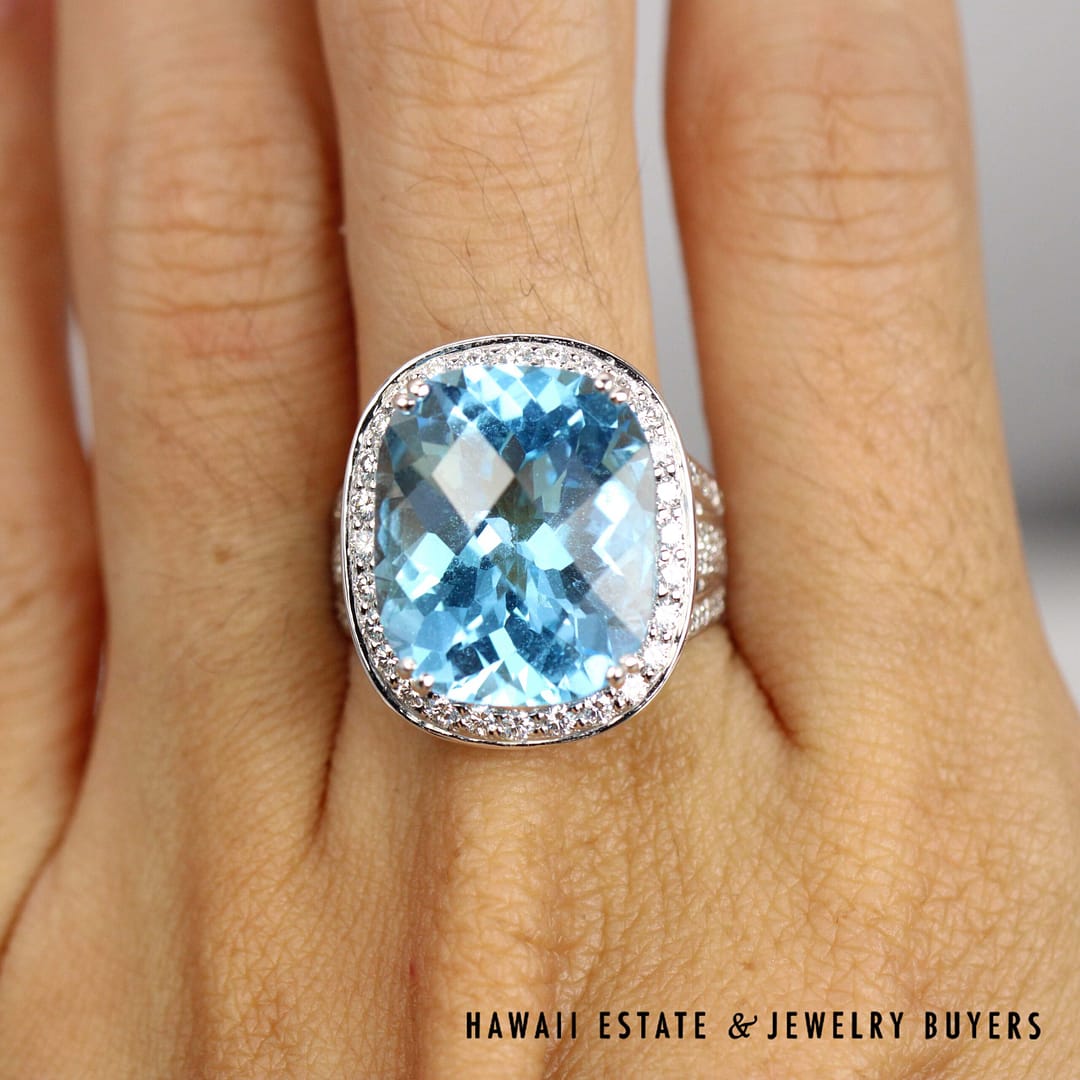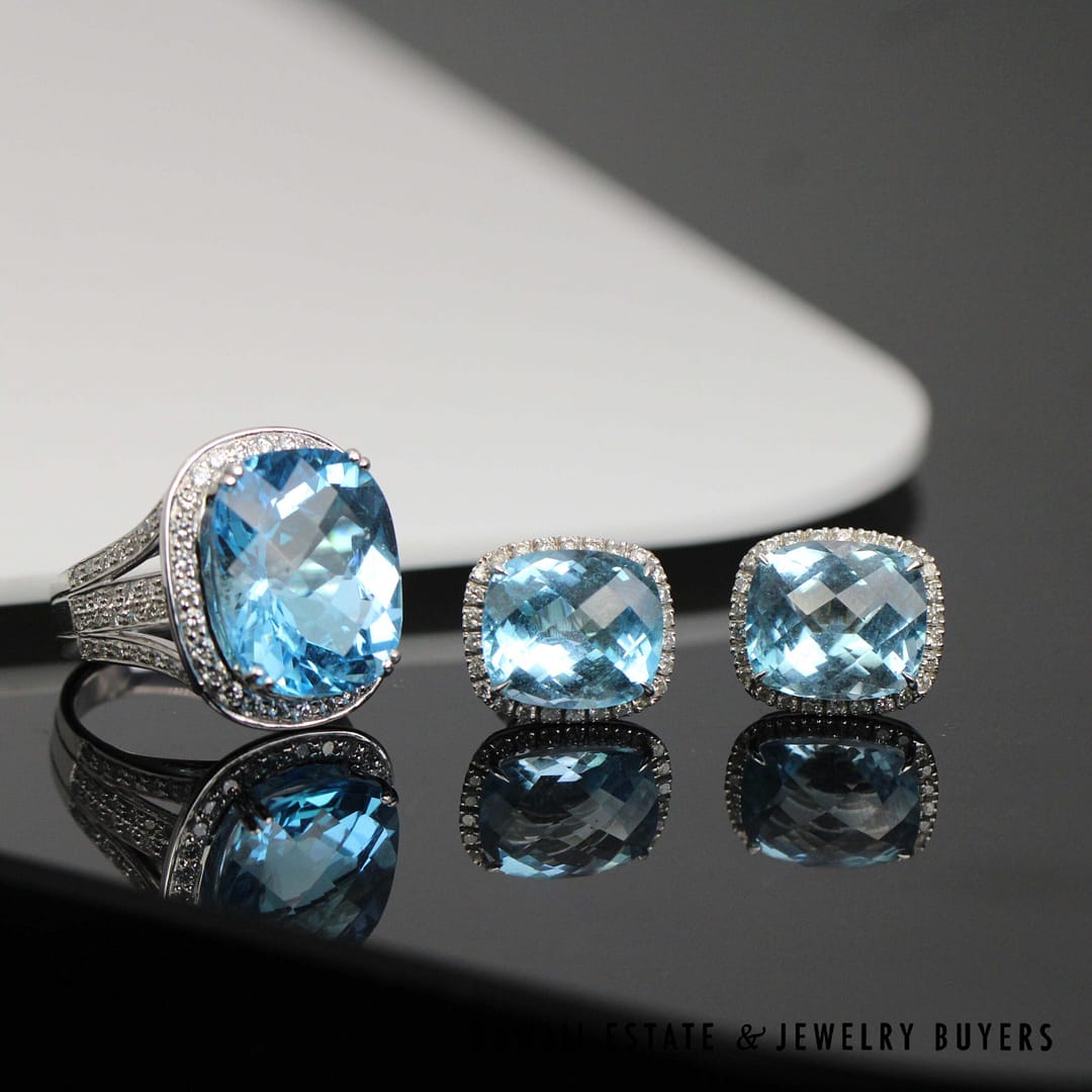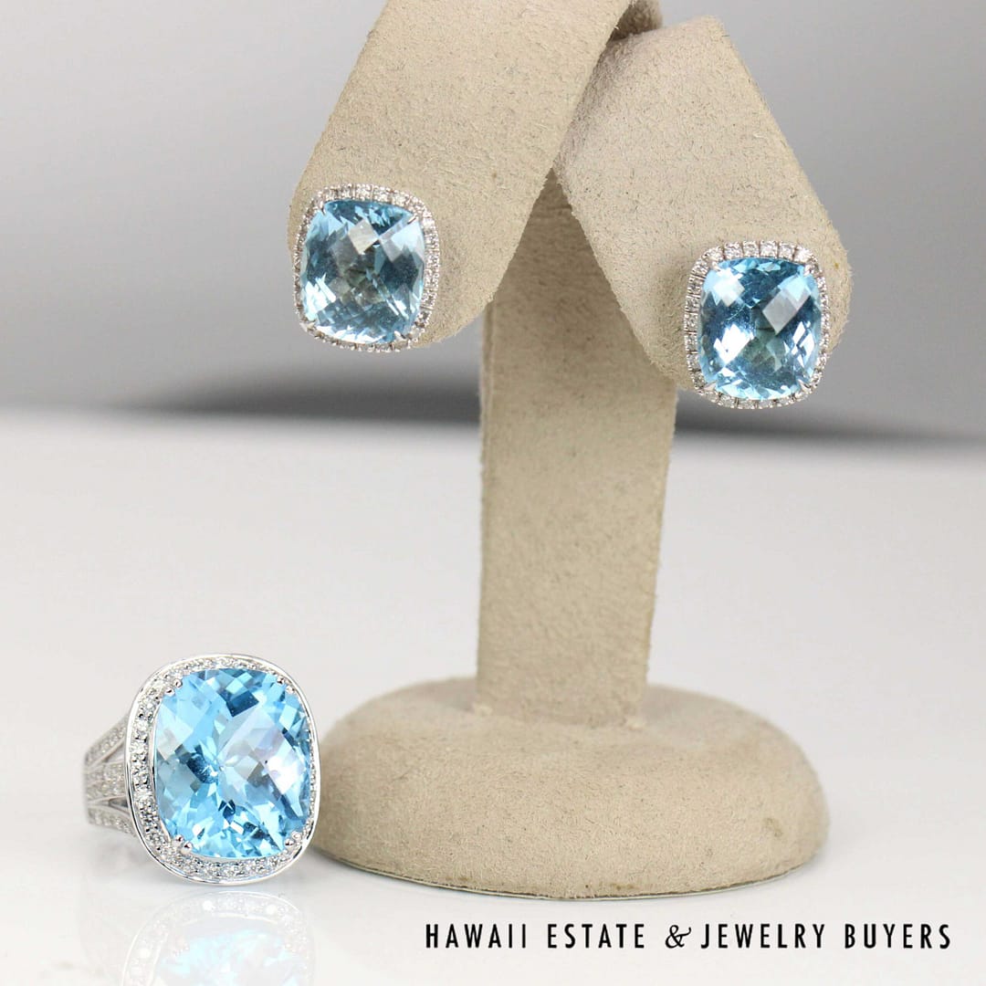 DescriptionTopaz is checkerboard cut and diamonds are I1/GHSET 21.7g 18KWG 35ctwt SWISS BLUE TOPAZ AND 1.10ctw DIAMOND RING SIZE 6.5 AND EARRING (3045-04)$2,950.001 in stock35ctw Swiss Blue Topaz and 1.10ctw Diamond 18K White Gold Ring Size 6.5 and Earrings quantityAdd to cartBuy withMake OfferSKU: 3045-04Category: Pre-owned Gemstone JewelryRelated StylesTiffany & Co. Garnet 18K Yellow Gold Sterling Silver Floral Brooch Pin$950.004.5ctw Emerald 4.50ctw Diamond 17.4g 14K Yellow Gold Earrings and Ring Size 6$5,500.00BERNARD HURTIG PINK BLUE SAPPHIRE 4.77ctw DIAMOND 18K YELLOW GOLD EARRINGS$34,000.002.50ctw Sapphire 0.33ctw Diamond SI/GH 18K White Gold Bracelet Size 7.25$900.00