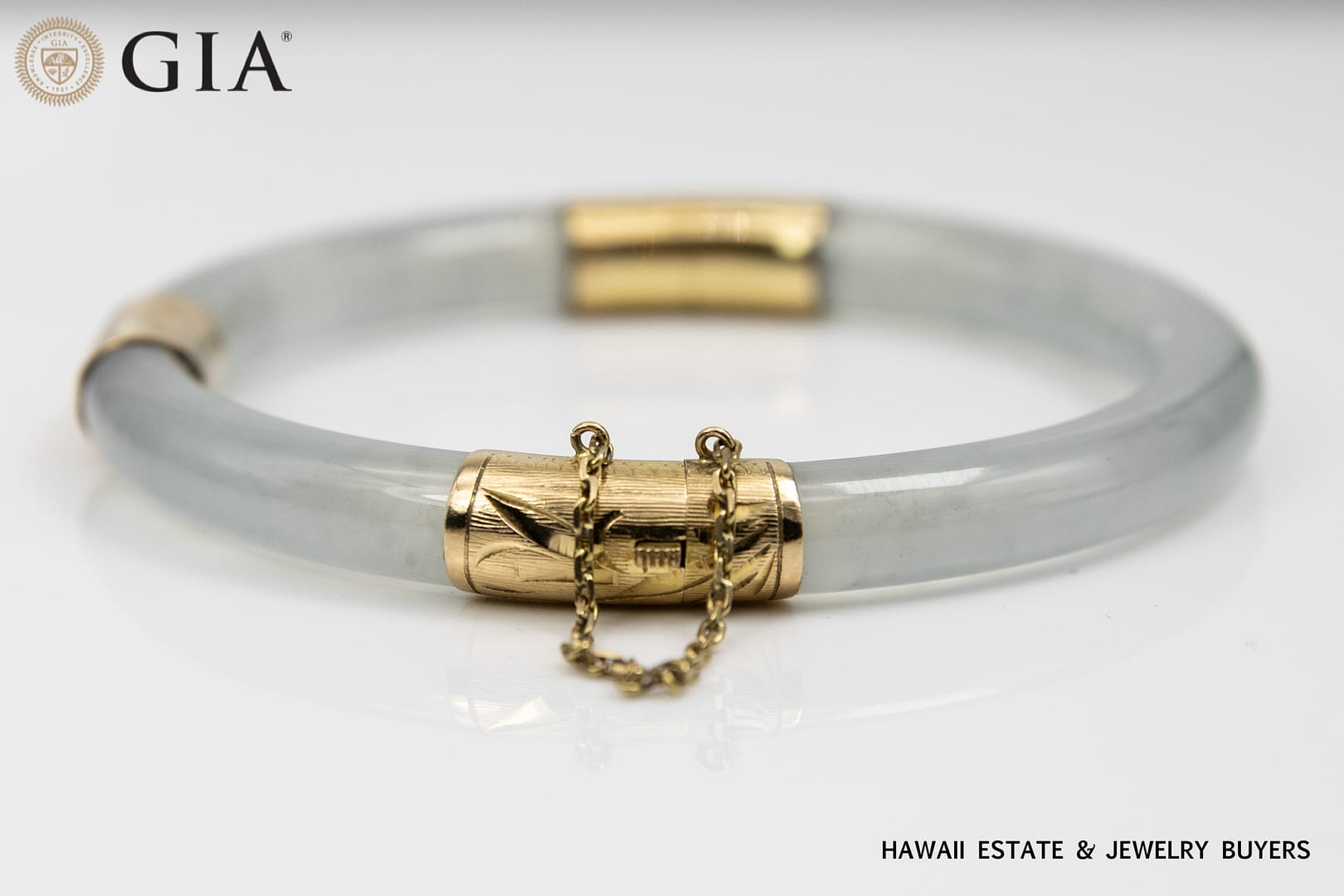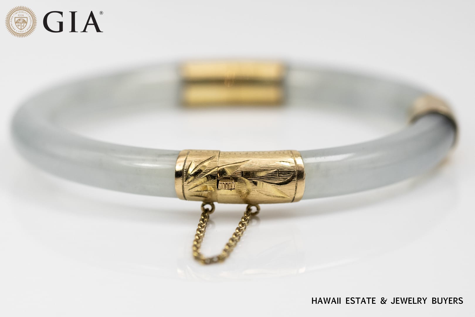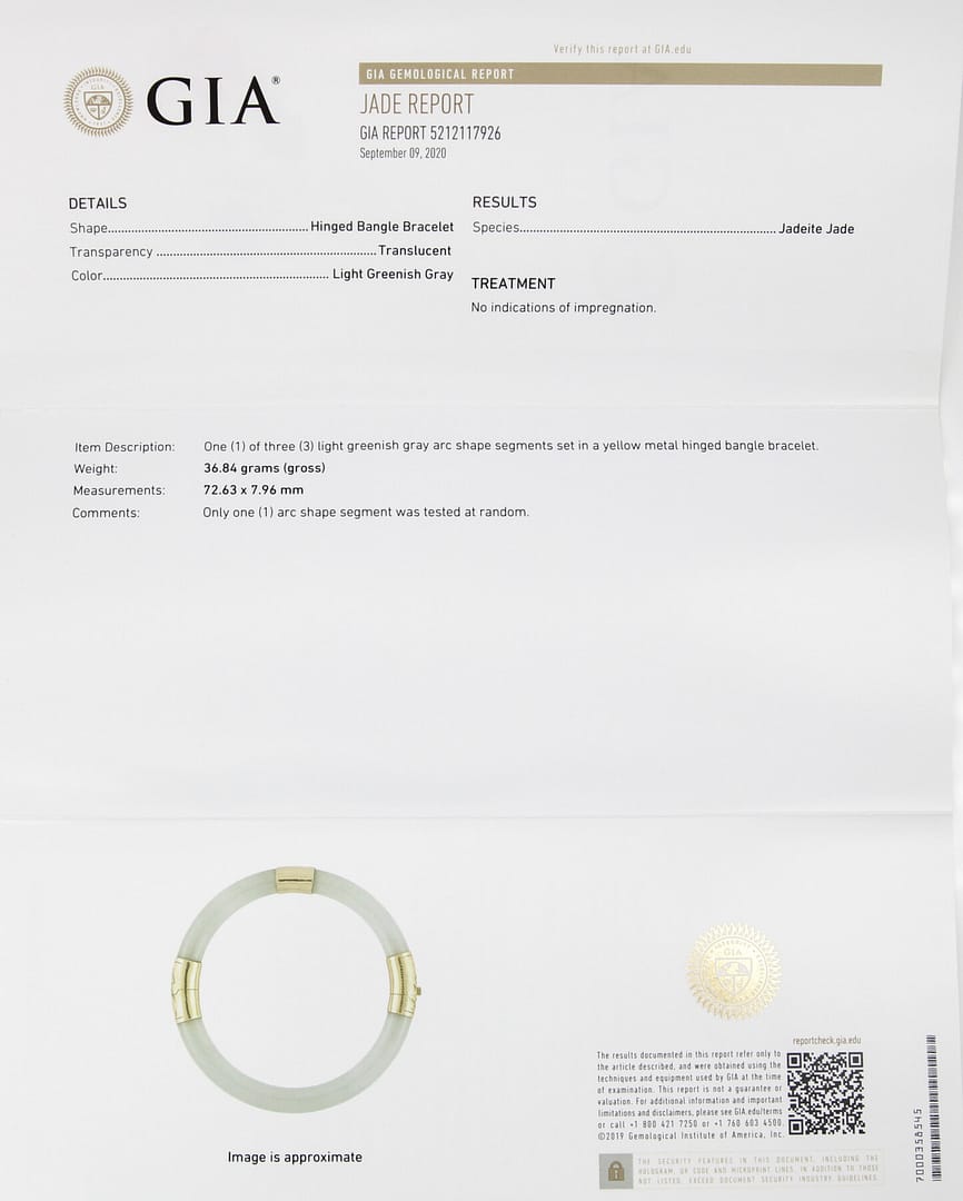 Description36.8g 14KYG LIGHT GREENISH GRAY JADE HINGED BANGLE BRACELET SIZE 7.5GIA Jade Report verifies Type A Jade. Known in the trade as Ice Jade.$6,500.001 in stock36.8g 14KYG LIGHT GREENISH GRAY JADE HINGED BANGLE BRACELET SIZE 7.5 quantityAdd to cartBuy withMake OfferSKU: 2446-66Categories: Jade Jewelry, Pre-owned Jade JewelryTags: 14k yellow gold, bracelet, gia, GIA JADE, jade, yellow goldRelated StylesMing’s Hawaii Natural Green Jade Do-nut W/ Cultured Pearl 14K Yellow Gold Ring$1,250.00Ming’s Hawaii Jade Green & Pearl Cluster 14K Yellow Gold Ring Earrings Brooch Set$3,800.00Vintage 1940’s Amethyst Wide Flexible 14K Yellow Gold Bracelet$5,500.00Ming’s Hawaii Natural Orange-Brown Jade Cabochon 14K Yellow Gold Clip-On Earrings$1,150.00