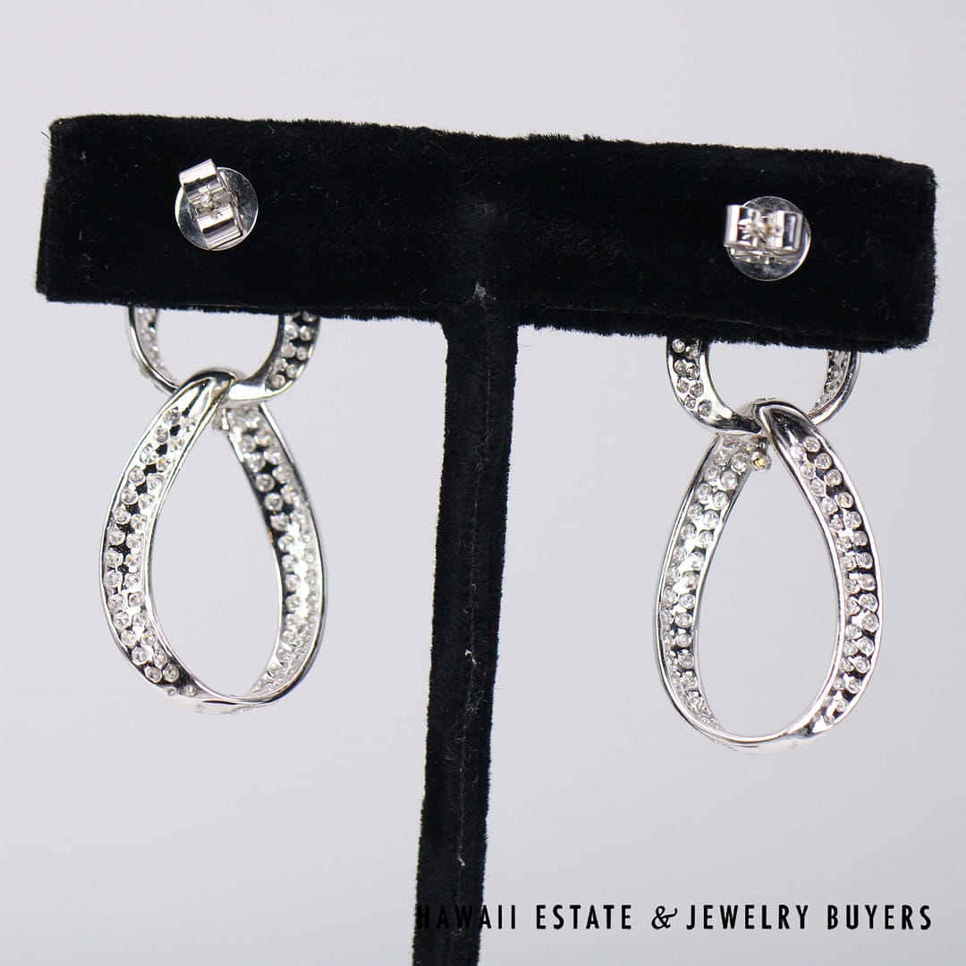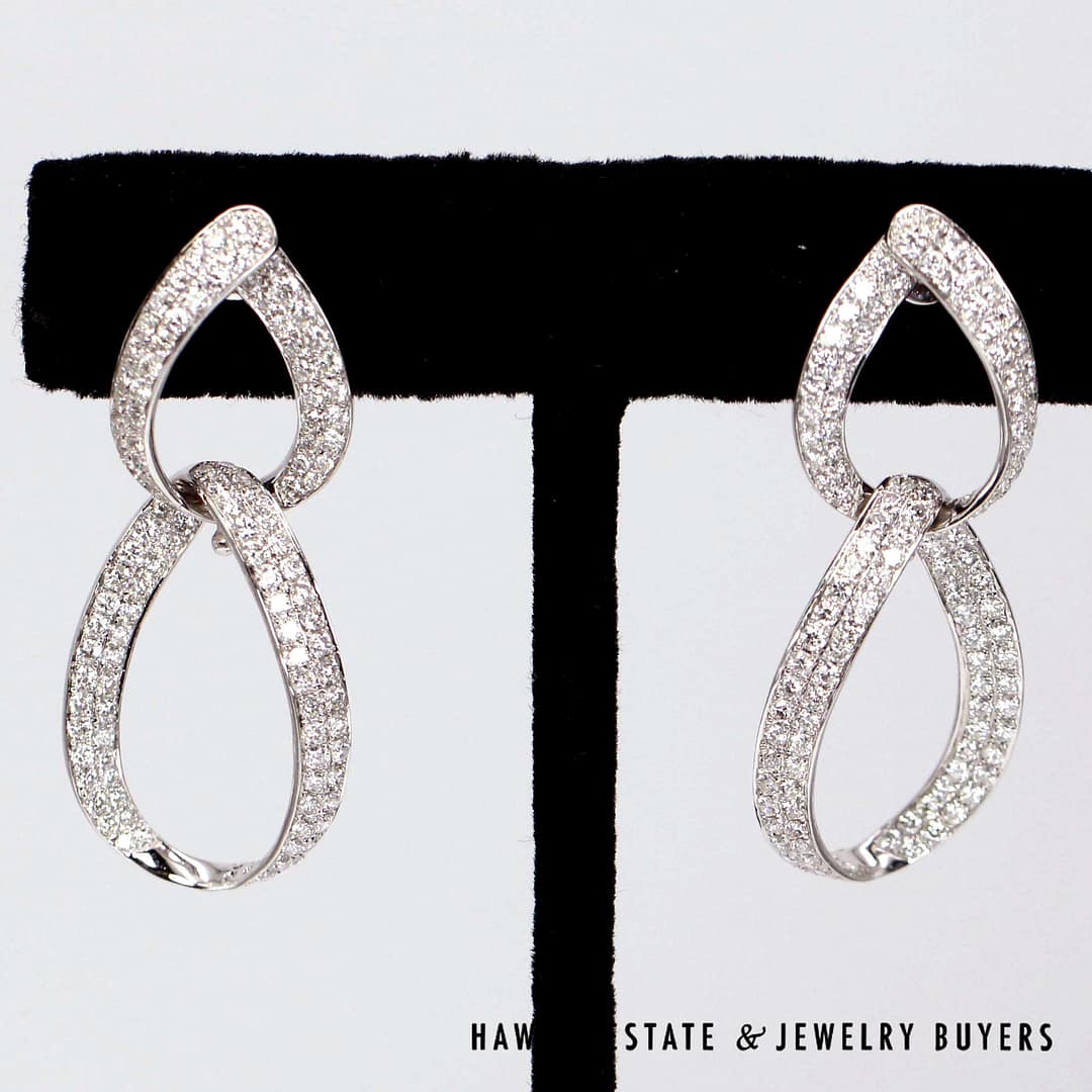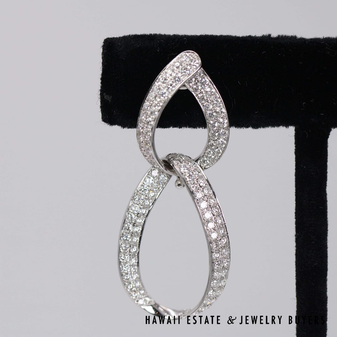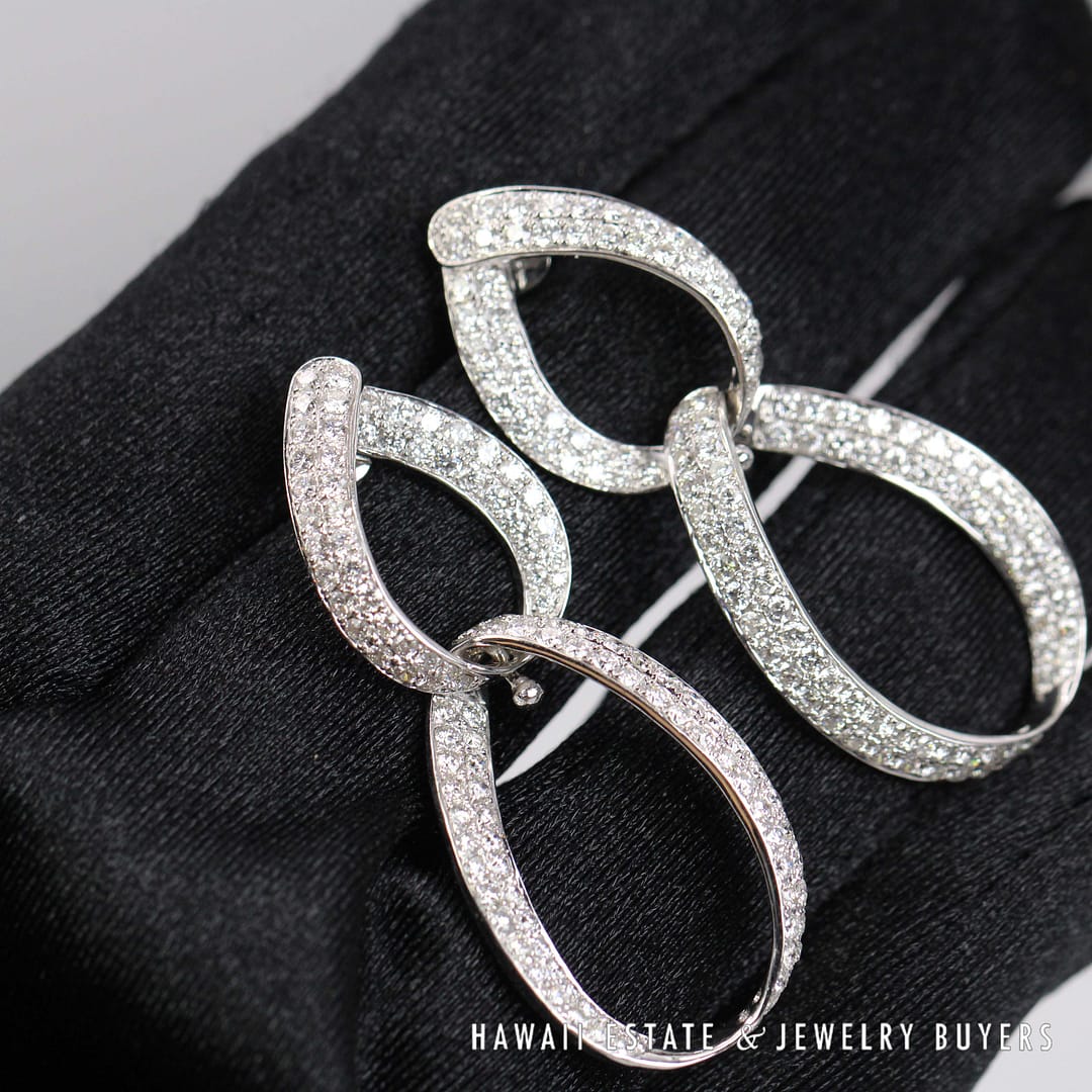 LADY’S WHITE GOLD STAMPED 18K 750 TRADEMARKED: PDJ. PAVE’ DIAMOND DOUBLE LOOP RIBBON DROP EARRINGS. The diamonds are pave’ set in two diagonal rows in the curved ribbon style loops that are pinned at each end together for maximum brilliance in the movement of the larger drop ribbon. The backs have a pierced post and large friction handmade ear-nuts. Total length approx. 1 3/4″ inches. The earrings have a high polish rhodium finish.