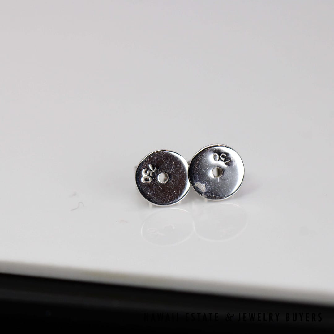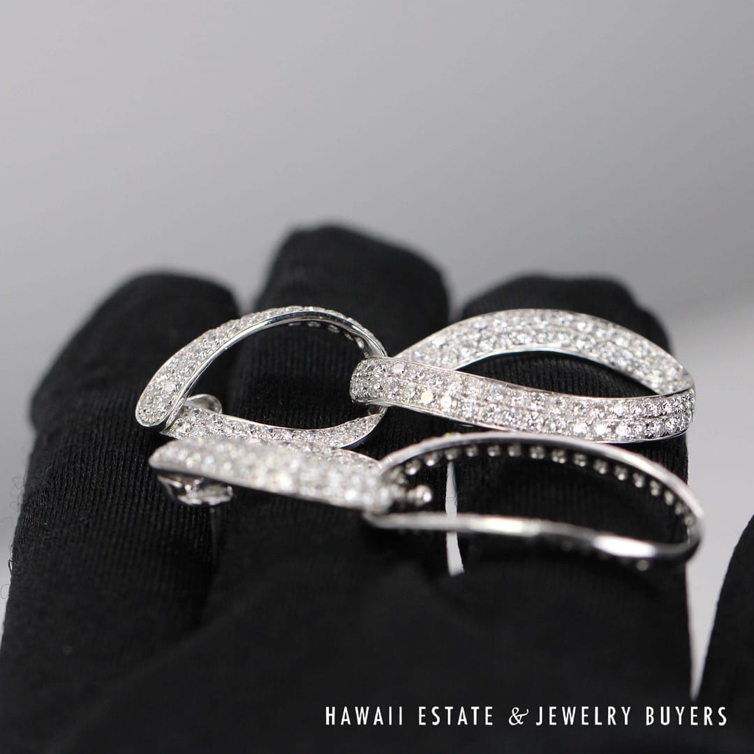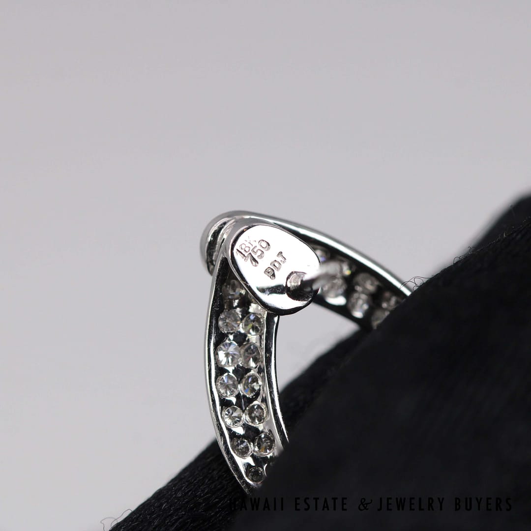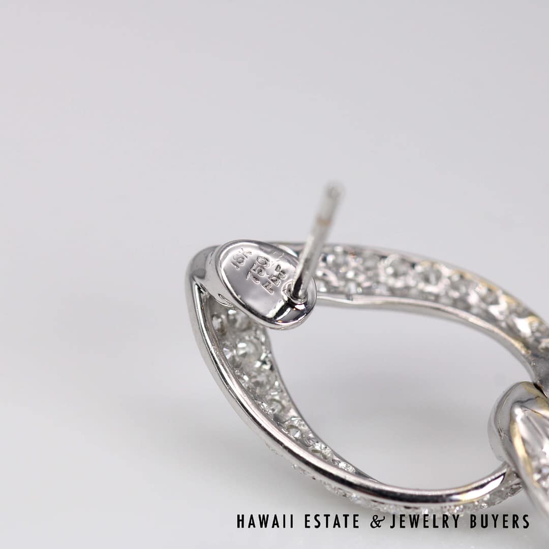 LADY’S WHITE GOLD STAMPED 18K 750 TRADEMARKED: PDJ. PAVE’ DIAMOND DOUBLE LOOP RIBBON DROP EARRINGS. The diamonds are pave’ set in two diagonal rows in the curved ribbon style loops that are pinned at each end together for maximum brilliance in the movement of the larger drop ribbon. The backs have a pierced post and large friction handmade ear-nuts. Total length approx. 1 3/4″ inches. The earrings have a high polish rhodium finish.