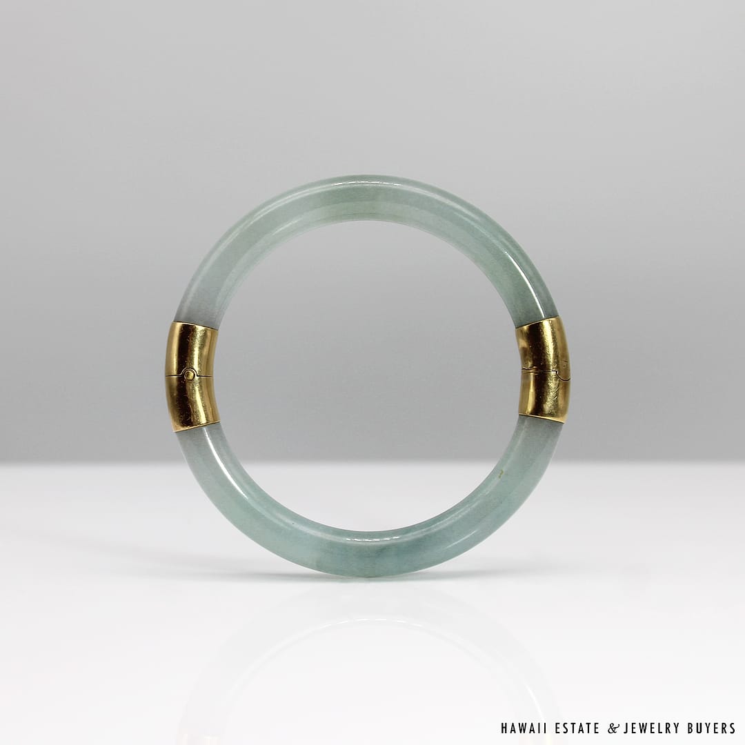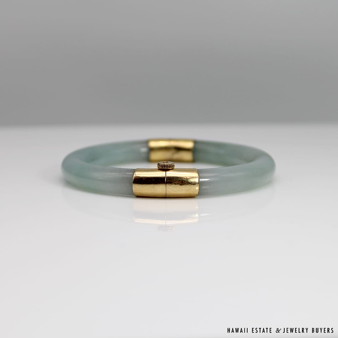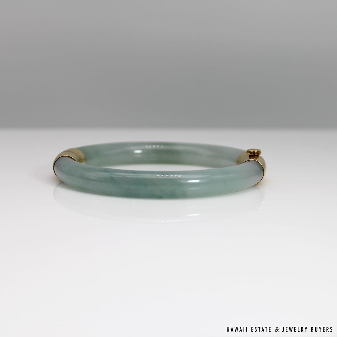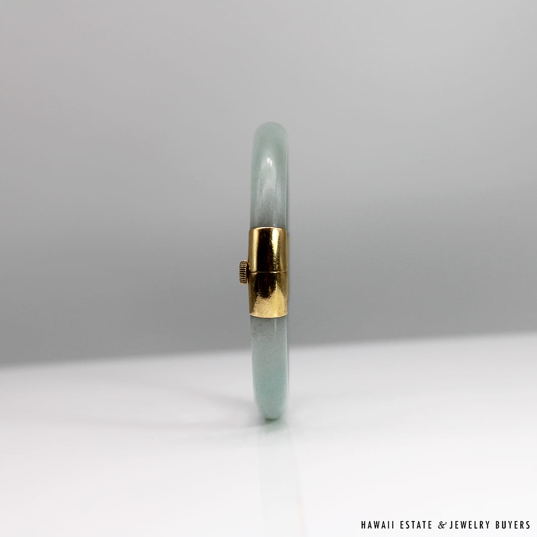 Description18KYG TYPE A PALE GREEN JADE HINGED BANGLEWEIGHT: APPROX. 41.2gBRACELET SIZE: 7INSIDE DIAMETER: APPROX. 55.4mmINSIDE CIRCUMFERENCE: APPROX. 178mmJADE THICKNESS: APPROX. 8.5mmSTAMPED 18KYG$4,500.001 in stock41.2g 18KYG TYPE A PALE GREEN JADE HINGED BANGLE SIZE 7 quantityAdd to cartMake OfferSKU: 2510-02Category: Pre-owned Vintage JewelryTags: green bangle, jade, JADE BANGLE, jade hinged bangle, type a jadeRelated StylesNatural Grade A White Jade Archer Ring$3,800.00Natural Grade A Jade Cabochon Ring$8,500.00Estate Large 18mm South Sea Pearl Necklace$18,000.00Thick Certified Grade A Natural Jade Hinged Bangle$4,250.00