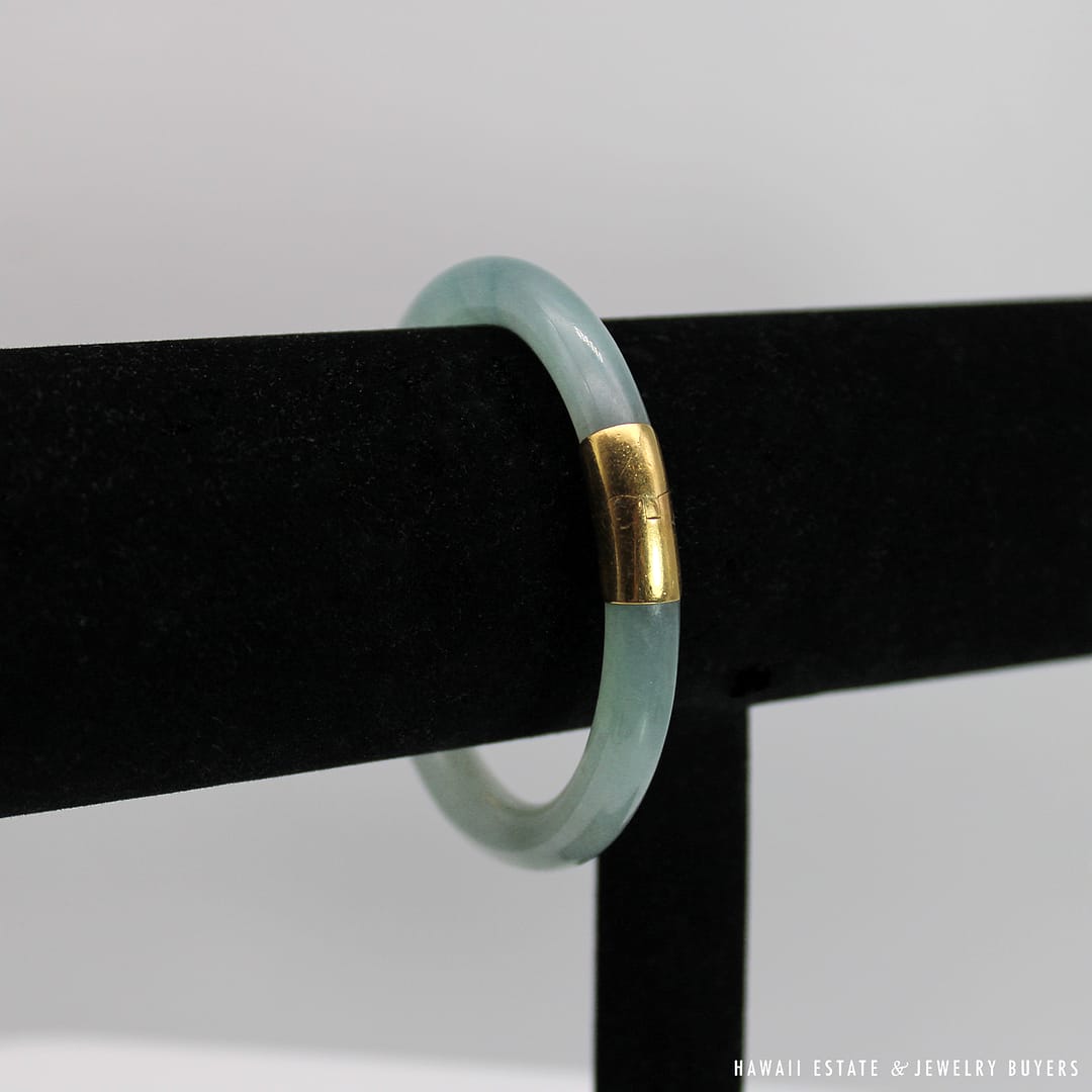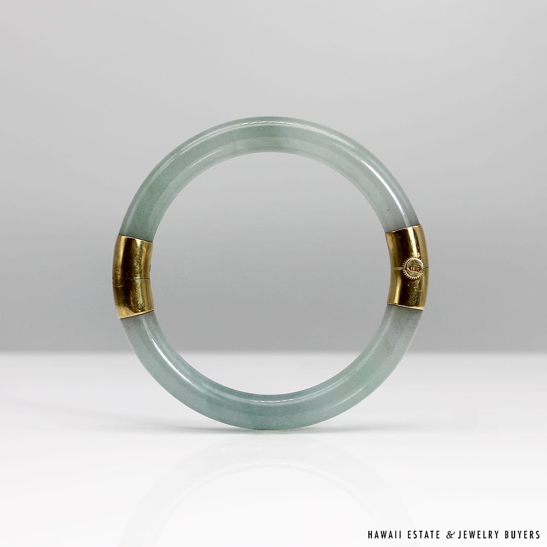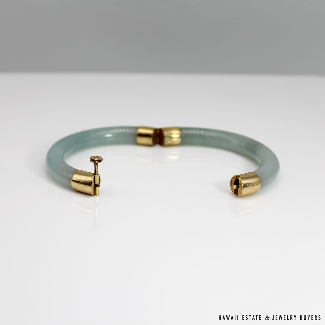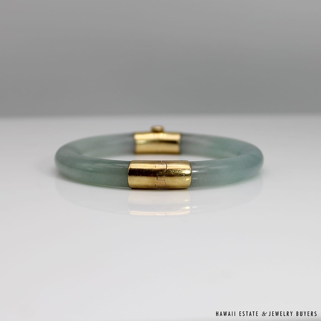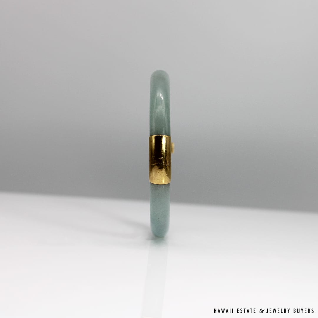 Description18KYG TYPE A PALE GREEN JADE HINGED BANGLEWEIGHT: APPROX. 41.2gBRACELET SIZE: 7INSIDE DIAMETER: APPROX. 55.4mmINSIDE CIRCUMFERENCE: APPROX. 178mmJADE THICKNESS: APPROX. 8.5mmSTAMPED 18KYG$4,500.001 in stock41.2g 18KYG TYPE A PALE GREEN JADE HINGED BANGLE SIZE 7 quantityAdd to cartMake OfferSKU: 2510-02Category: Pre-owned Vintage JewelryTags: green bangle, jade, JADE BANGLE, jade hinged bangle, type a jadeRelated StylesNatural Grade A White Jade Archer Ring$3,800.00Natural Grade A Jade Cabochon Ring$8,500.00Estate Large 18mm South Sea Pearl Necklace$18,000.00Thick Certified Grade A Natural Jade Hinged Bangle$4,250.00