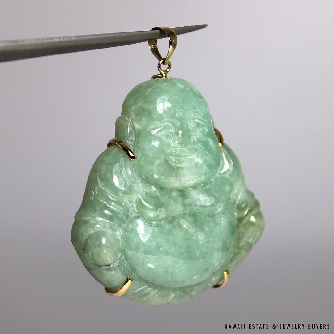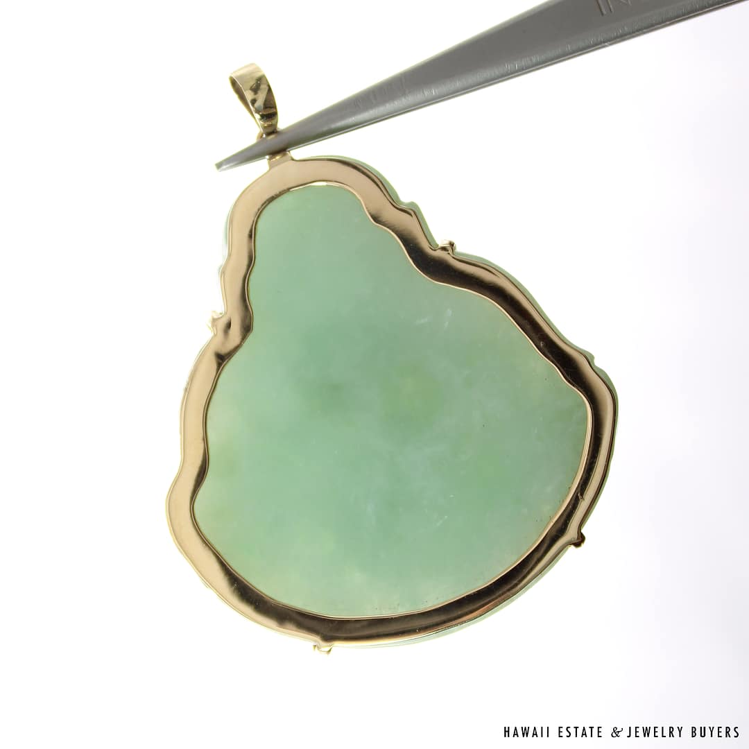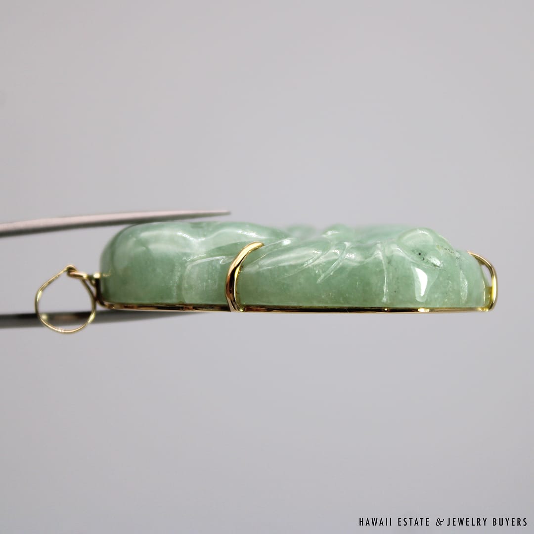Description14KYG MOTTLED GREEN JADE BUDDHA PENDANTWEIGHT: 42.5gJADE MEASURES: APPROX. 59x45mmJADE THICKNESS: APPROX. 10.6mmACID TESTED 14KYG$800.00Out of stockSKU: 050522-02Categories: Pre-owned Gold jewelry, Pre-owned Vintage JewelryTags: 14k yellow gold, buddha pendant, gold and jade, jade, jade pendantRelated StylesAntique Ceremonial Certified Nephrite Jade Flute$16,000.00Natural Lavender Cabochon Pendant$2,300.00Estate Large 18mm South Sea Pearl Necklace$18,000.00Certified Jade White Carved Bangle Bracelet$5,300.00