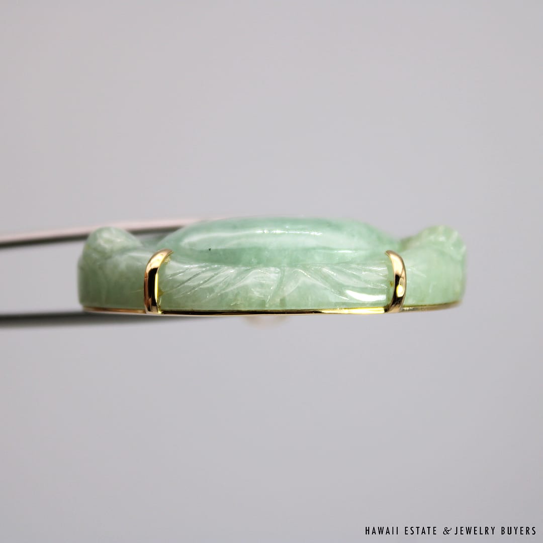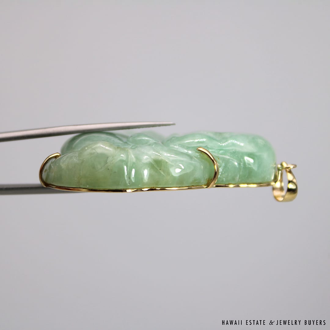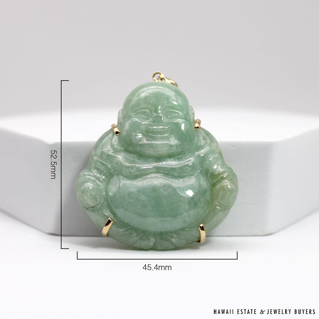 Description14KYG MOTTLED GREEN JADE BUDDHA PENDANTWEIGHT: 42.5gJADE MEASURES: APPROX. 59x45mmJADE THICKNESS: APPROX. 10.6mmACID TESTED 14KYG$800.00Out of stockSKU: 050522-02Categories: Pre-owned Gold jewelry, Pre-owned Vintage JewelryTags: 14k yellow gold, buddha pendant, gold and jade, jade, jade pendantRelated StylesAntique Ceremonial Certified Nephrite Jade Flute$16,000.00Natural Lavender Cabochon Pendant$2,300.00Estate Large 18mm South Sea Pearl Necklace$18,000.00Certified Jade White Carved Bangle Bracelet$5,300.00