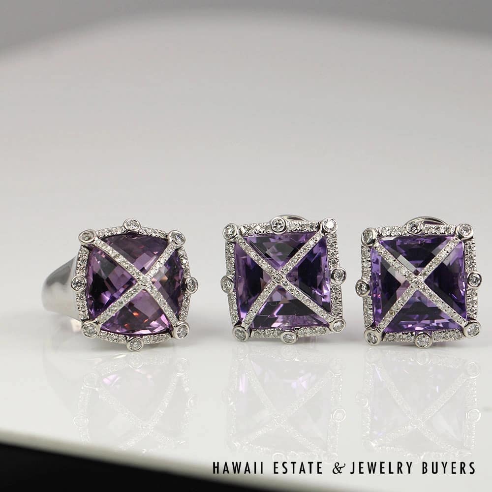 32.7g 18KWG SET 45ctw CHESSBOARD AMETHYST 1.50ctw DIAMOND EARRINGS AND RING SIZE 6.5 (3006-05)