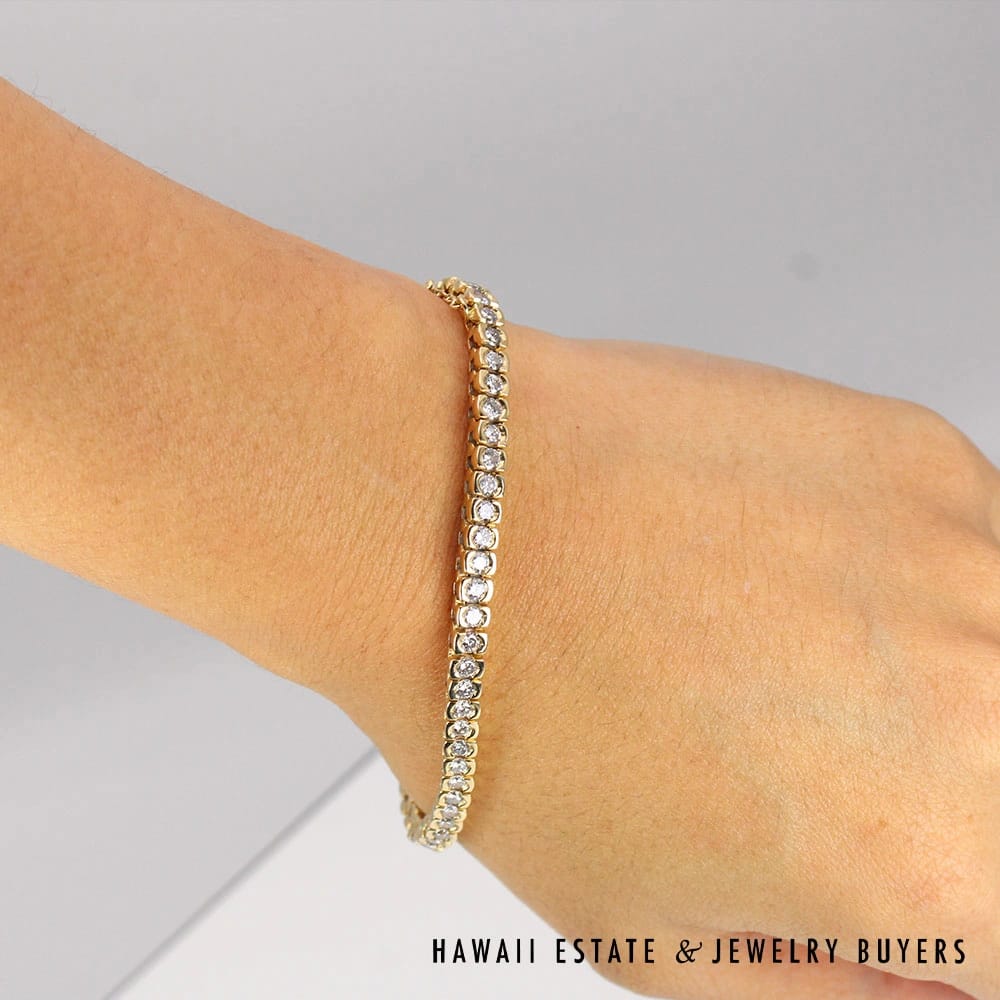 Stunning 4ctw Diamond Channel Set Tennis Bracelet. Crafted with 18.5g 14K Yellow Gold, this vintage piece features a classic tennis design with a half-bezel channel set, with 4CTW of diamonds.