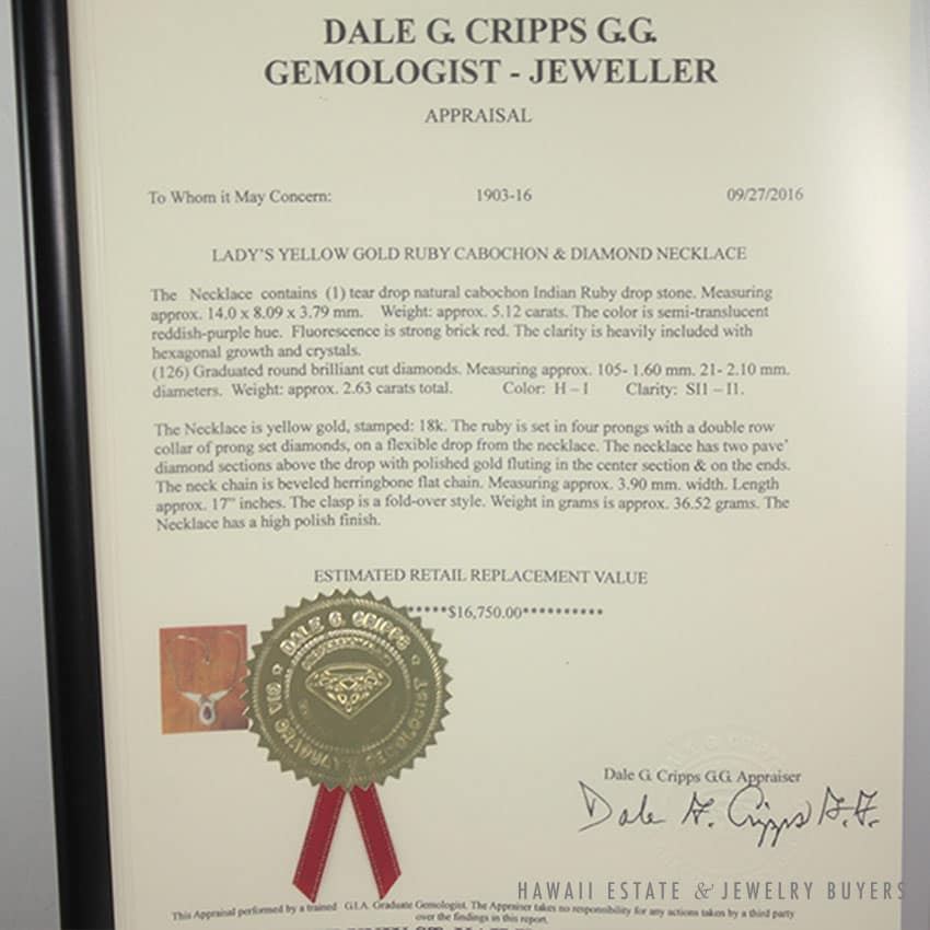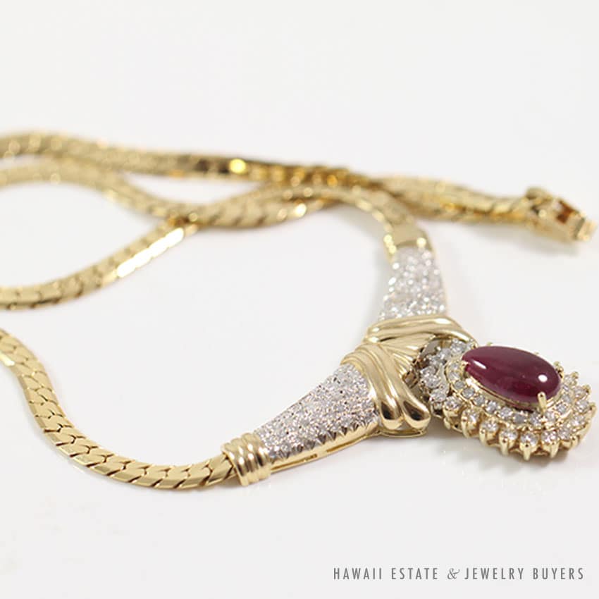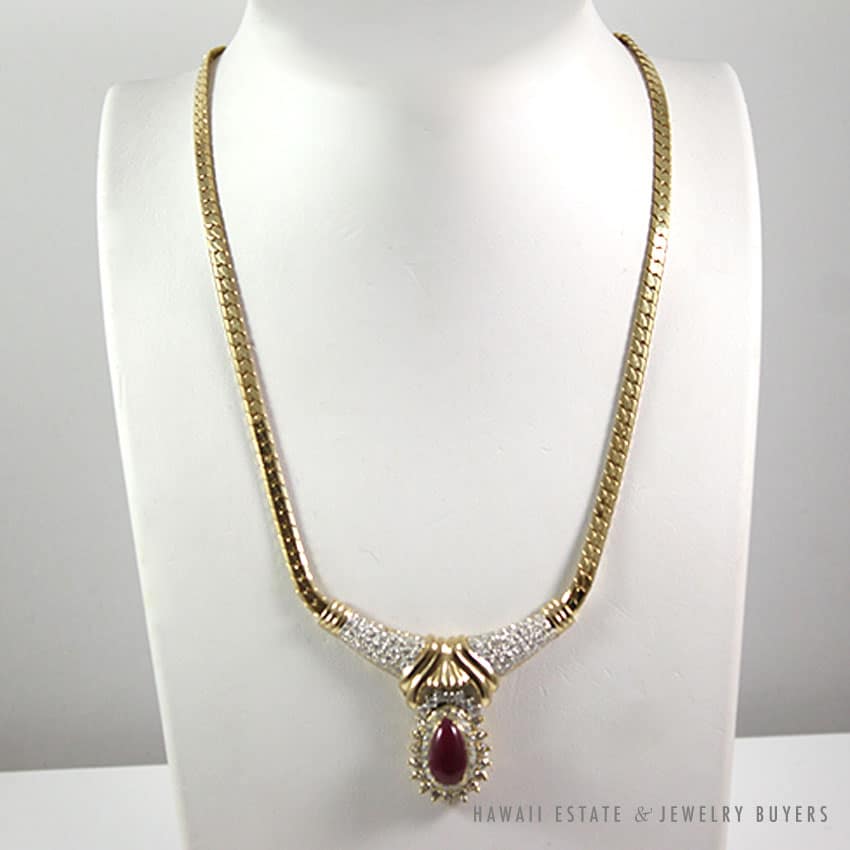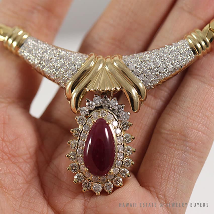 The necklace contains (1) 5.12ct semi-translucent reddish-purple tear drop natural cabochon Indian Ruby drop stone and (126) graduated round brilliant cut diamonds.