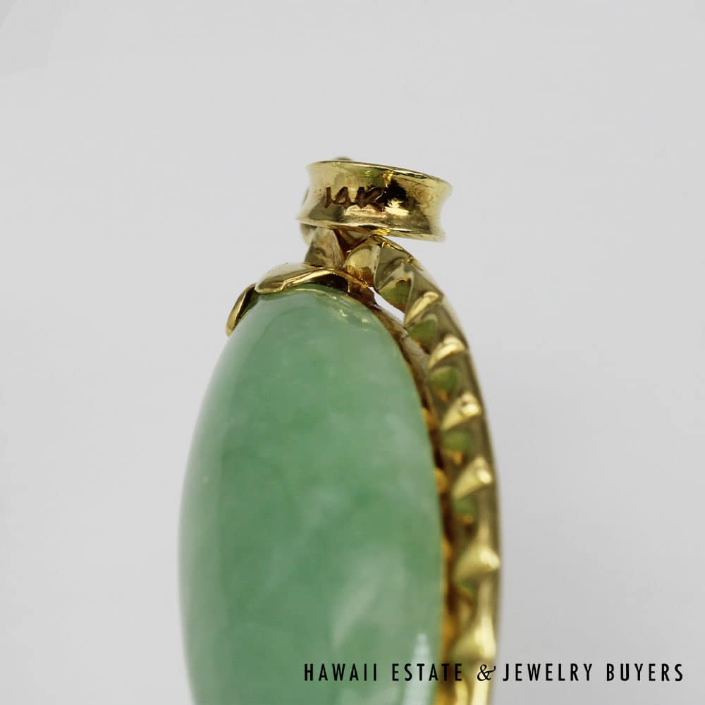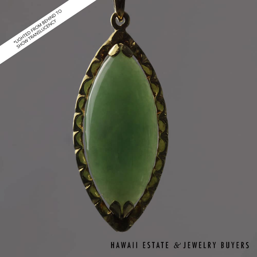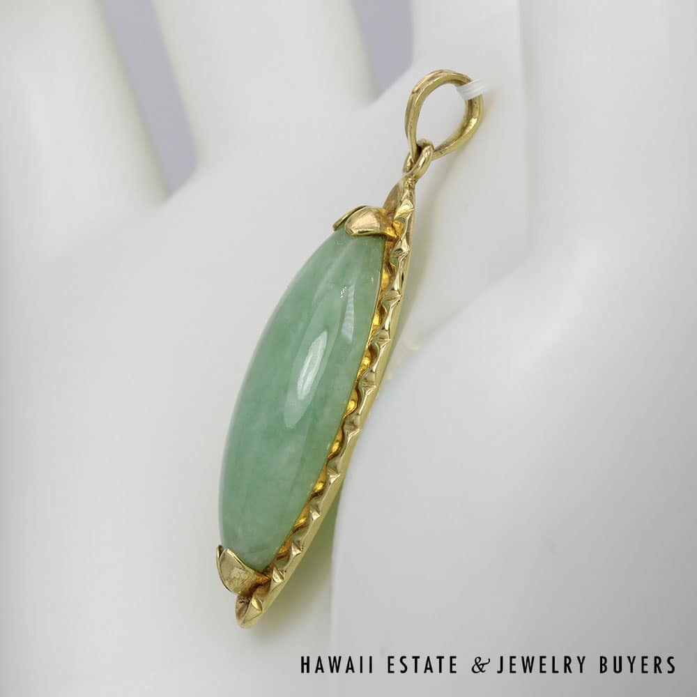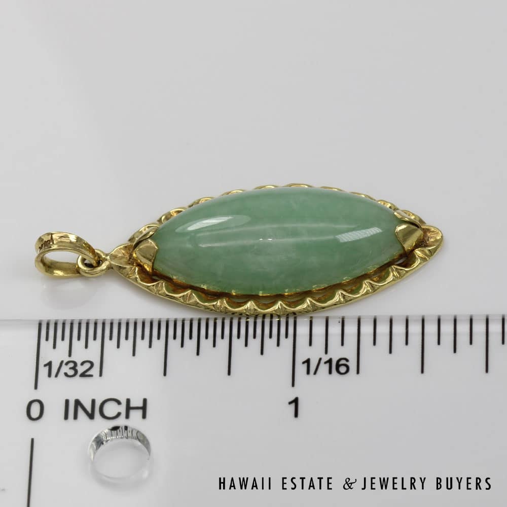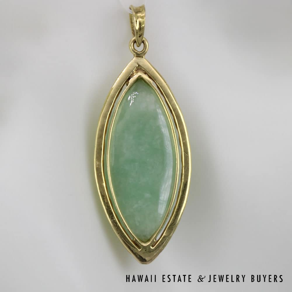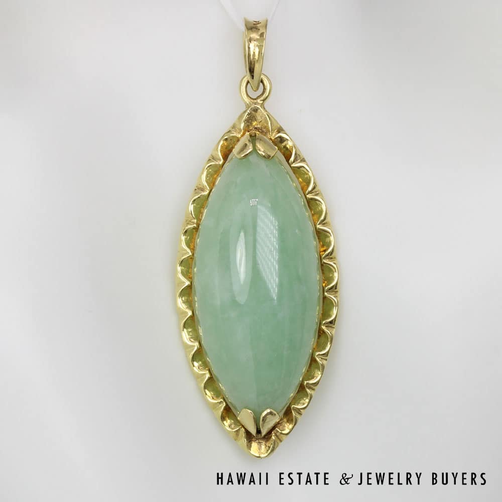 DescriptionYou’re looking at a GREEN JADE MARQUISE CABOCHON PENDANT.This pendant weighs 5.4g and features 14KYG.Pendant measures approx 42.1 x 14.6mm and is stamped 14K. $499.001 in stock5.4g 14KYG GREEN JADE MARQUISE CABOCHON PENDANT quantityAdd to cartMake OfferSKU: 042623-01Category: Pre-owned Jade JewelryTags: 14KYG, jade pendantRelated Styles4.3g 14KYG 0.75ct MEXICAN OPAL RING 4.75$1,200.0011.1g 14KWG ICE JADE 2ctw DIAMOND CLIP ON EARRINGS$7,500.0012.6g 14KWG 10ct ICE JADE 1.80ctw DIAMONDS RING/PENDANT SIZE 5.5$9,500.008.1g 14KYG 9.6mm TAHITIAN PEARL with 0.50ctw DIAMONDS RING SIZE 7$2,300.00